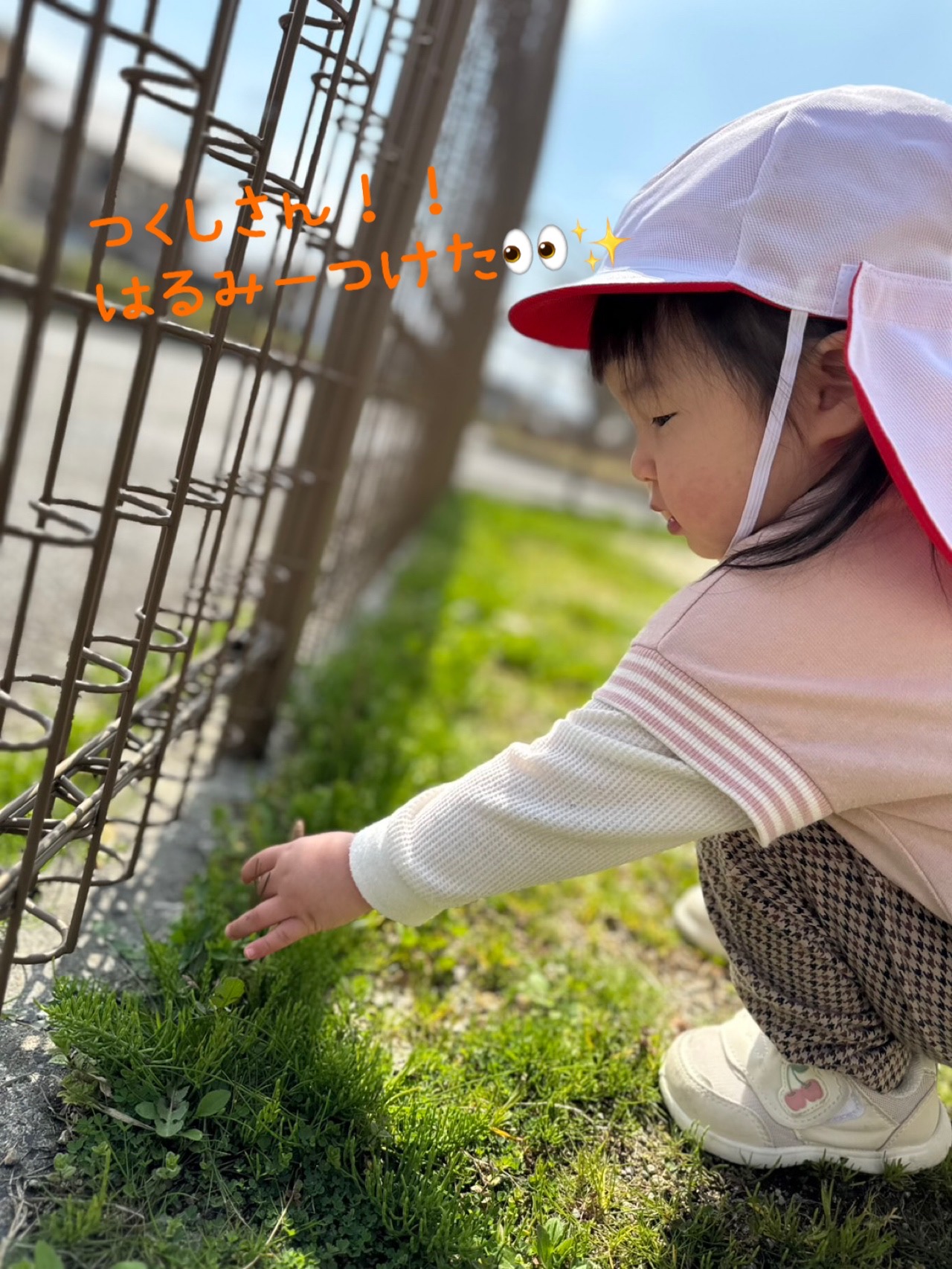 新年度が始まりポカポカ陽気の中、保育者と一緒に園庭でつくしを