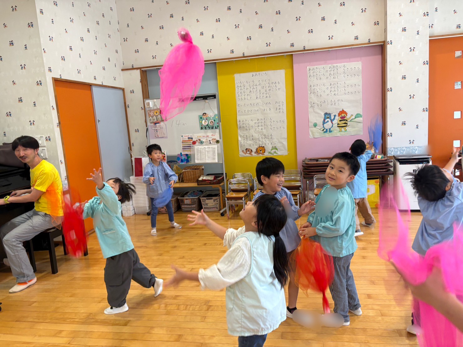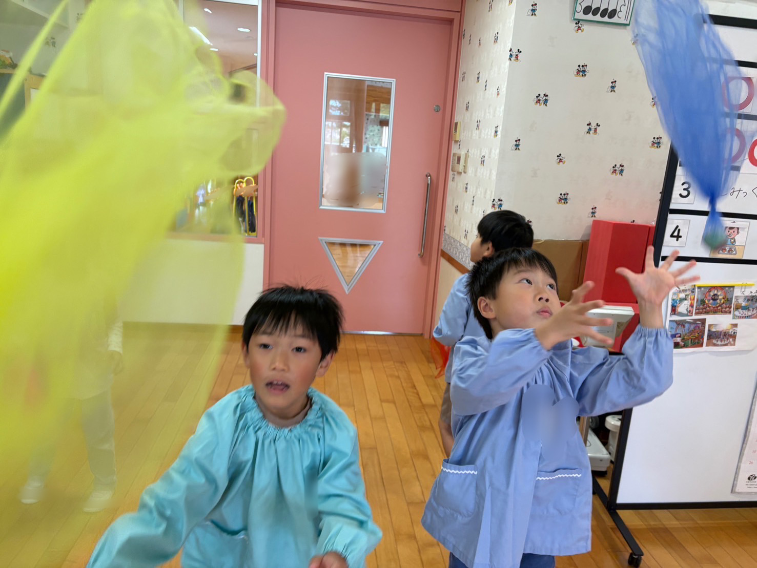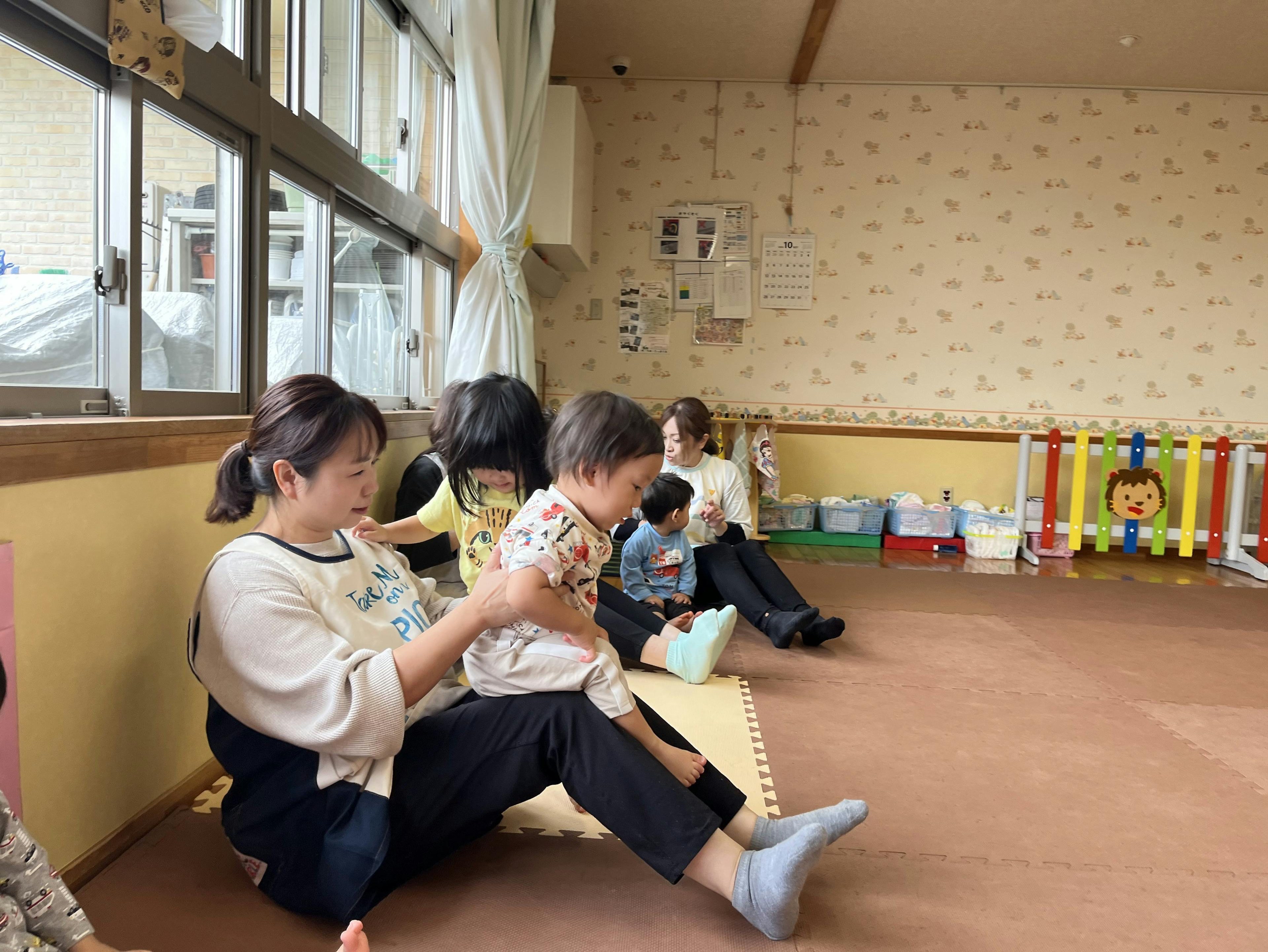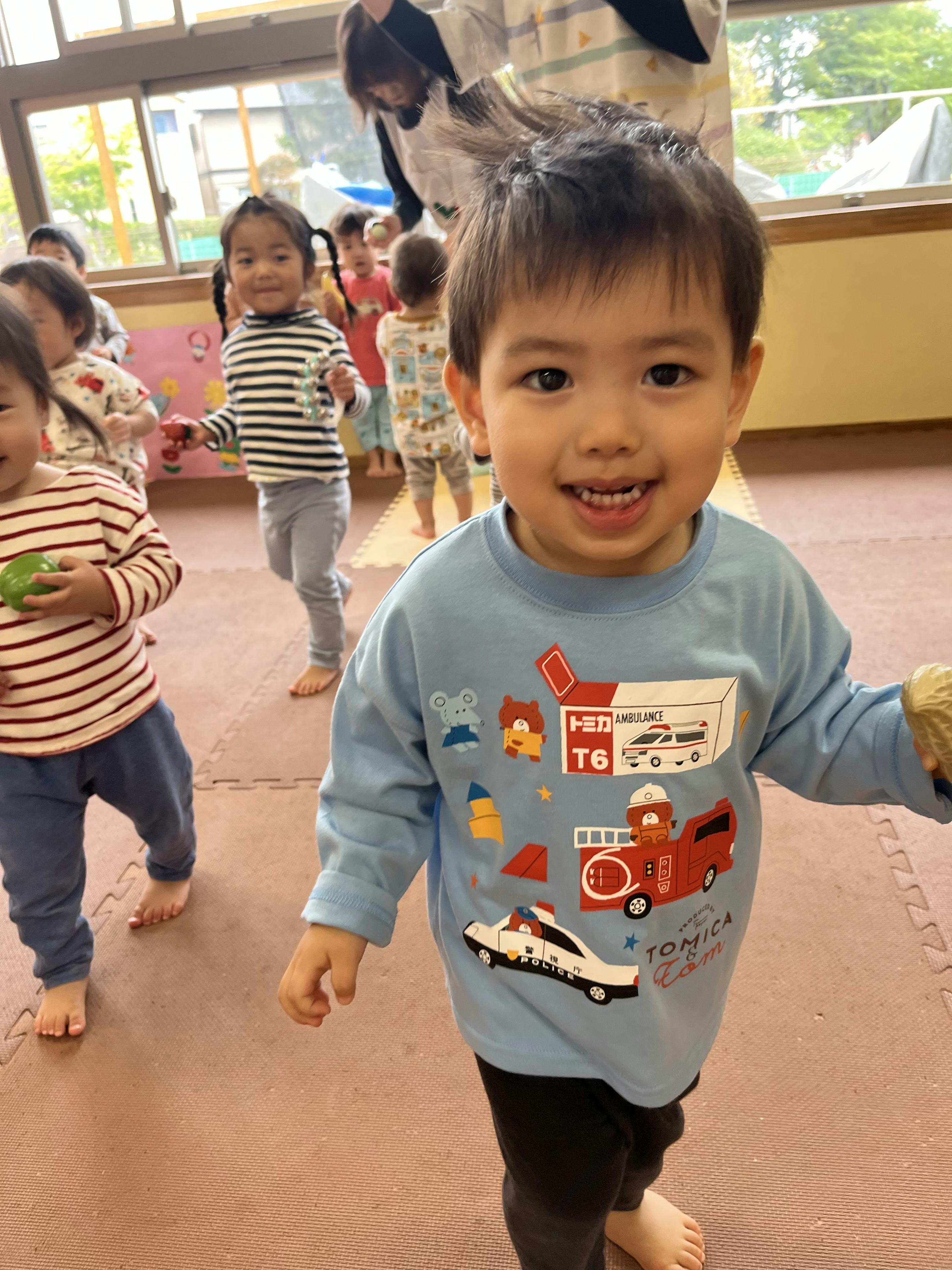 今月は子どもたちの大好きな秋のうた「どんぐりころころ♪」のピアノに合わせて、歌いながら2人1組で体を動かしました♪