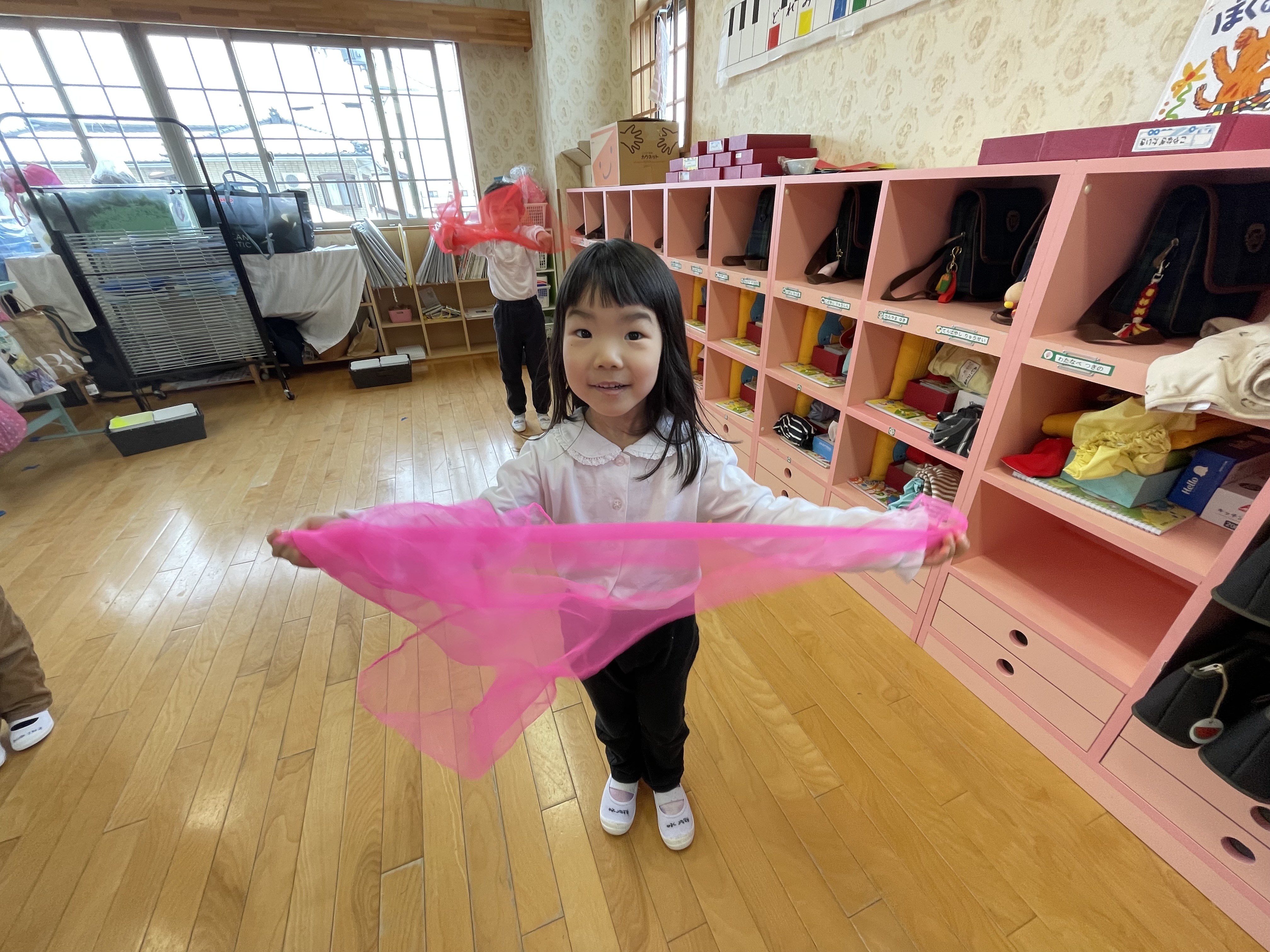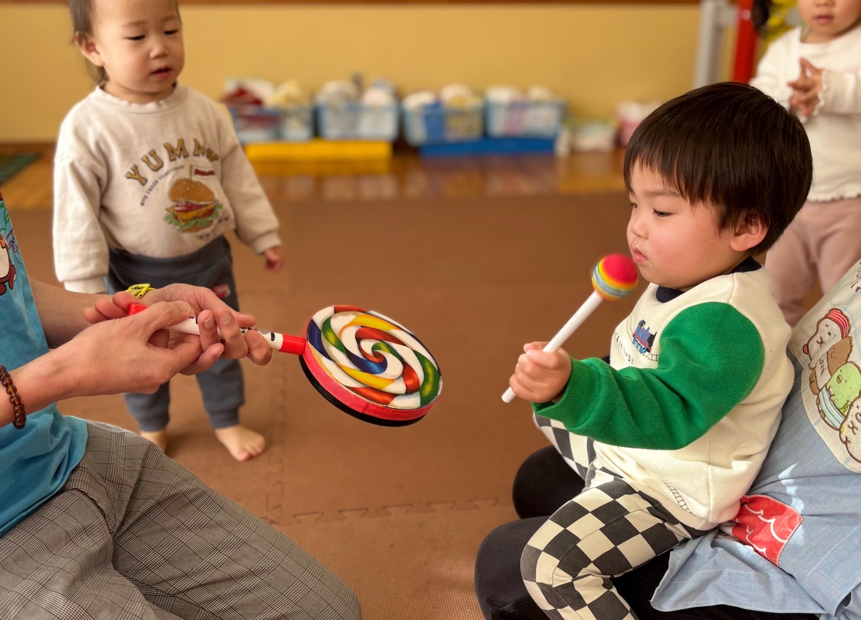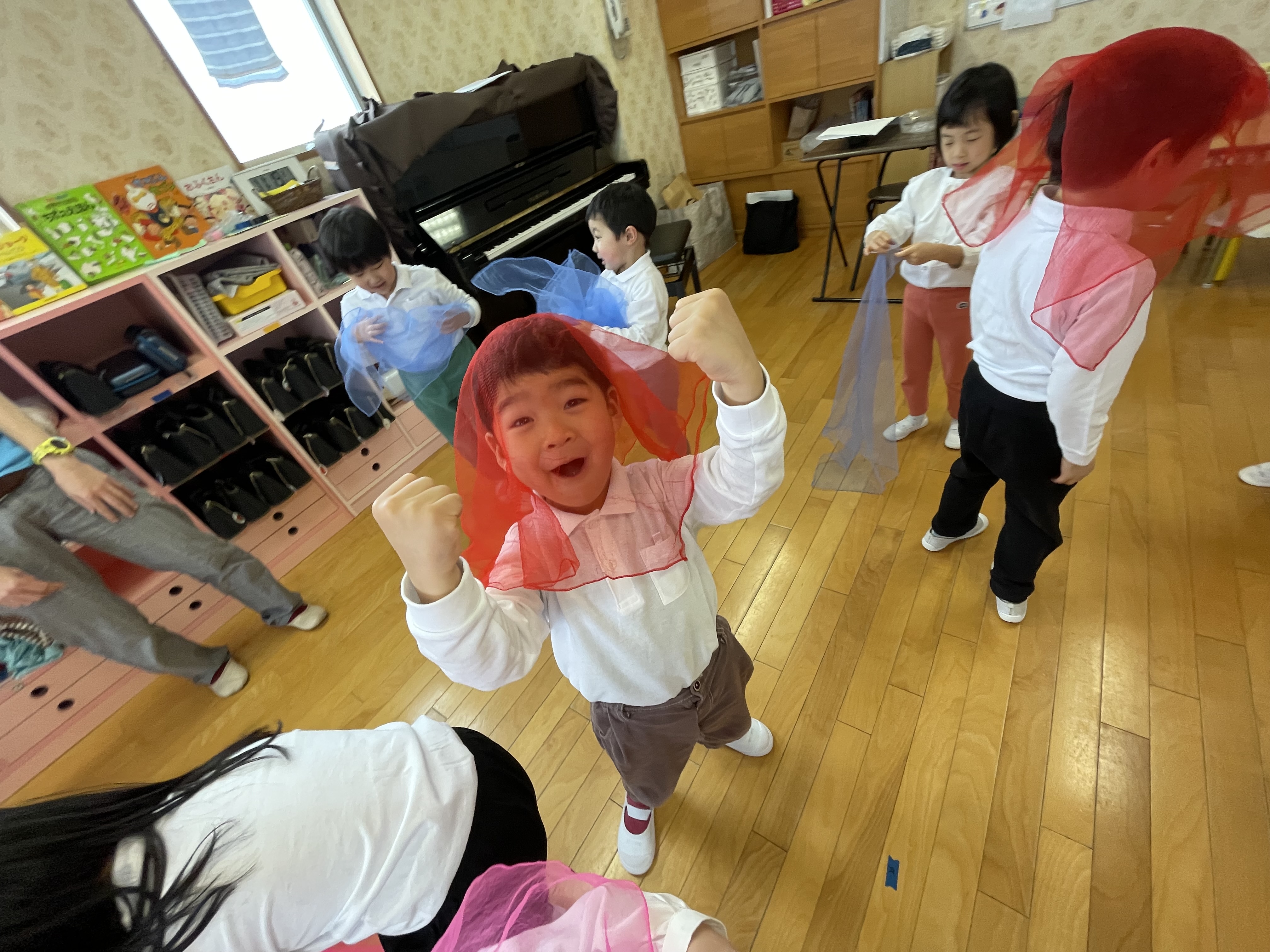 2月5日(木)のリトミックでは、スカーフを使い音楽に合わせてゲームをしたり、太鼓やマラカスを使ってリズム遊びをしました♪