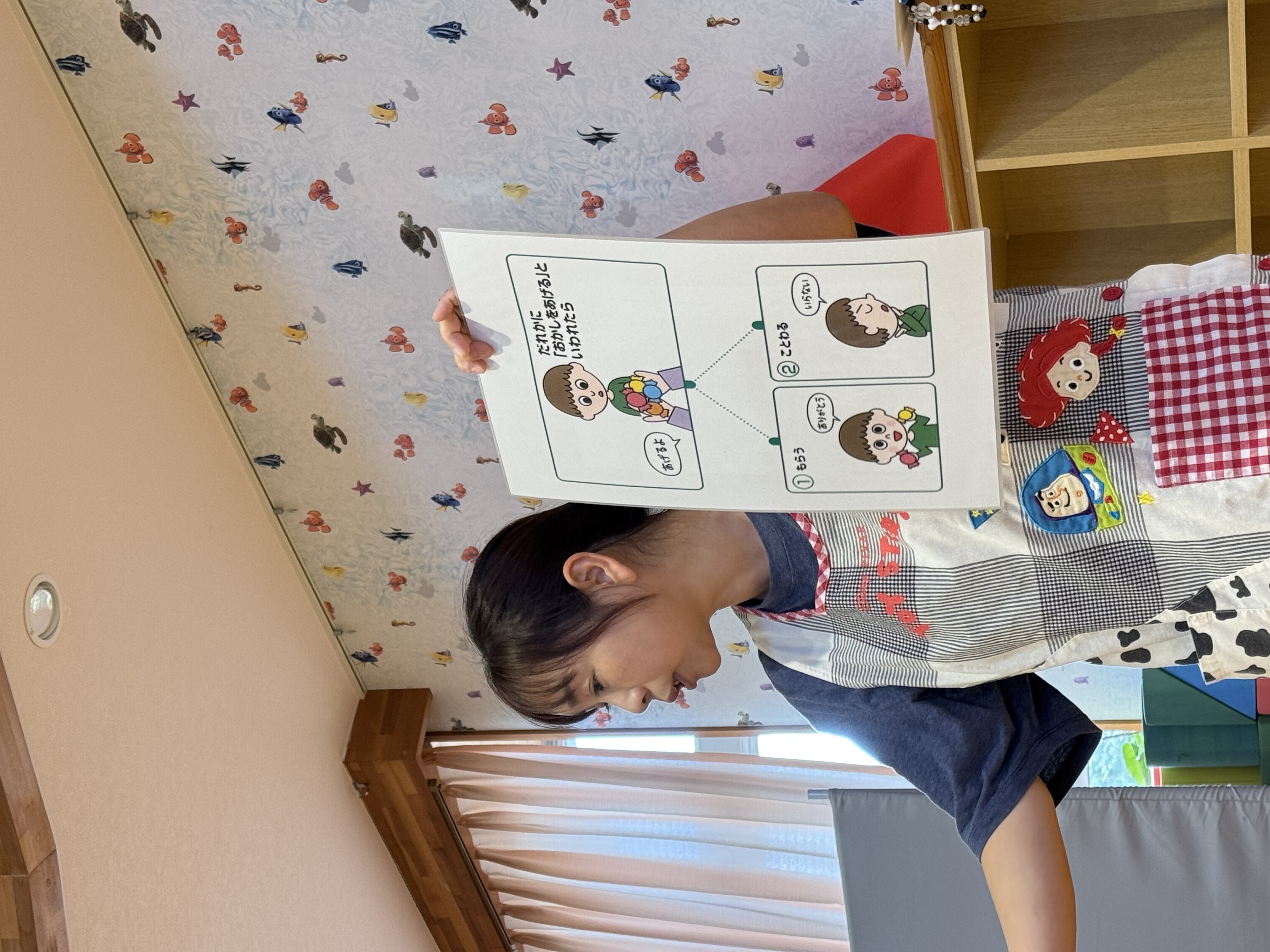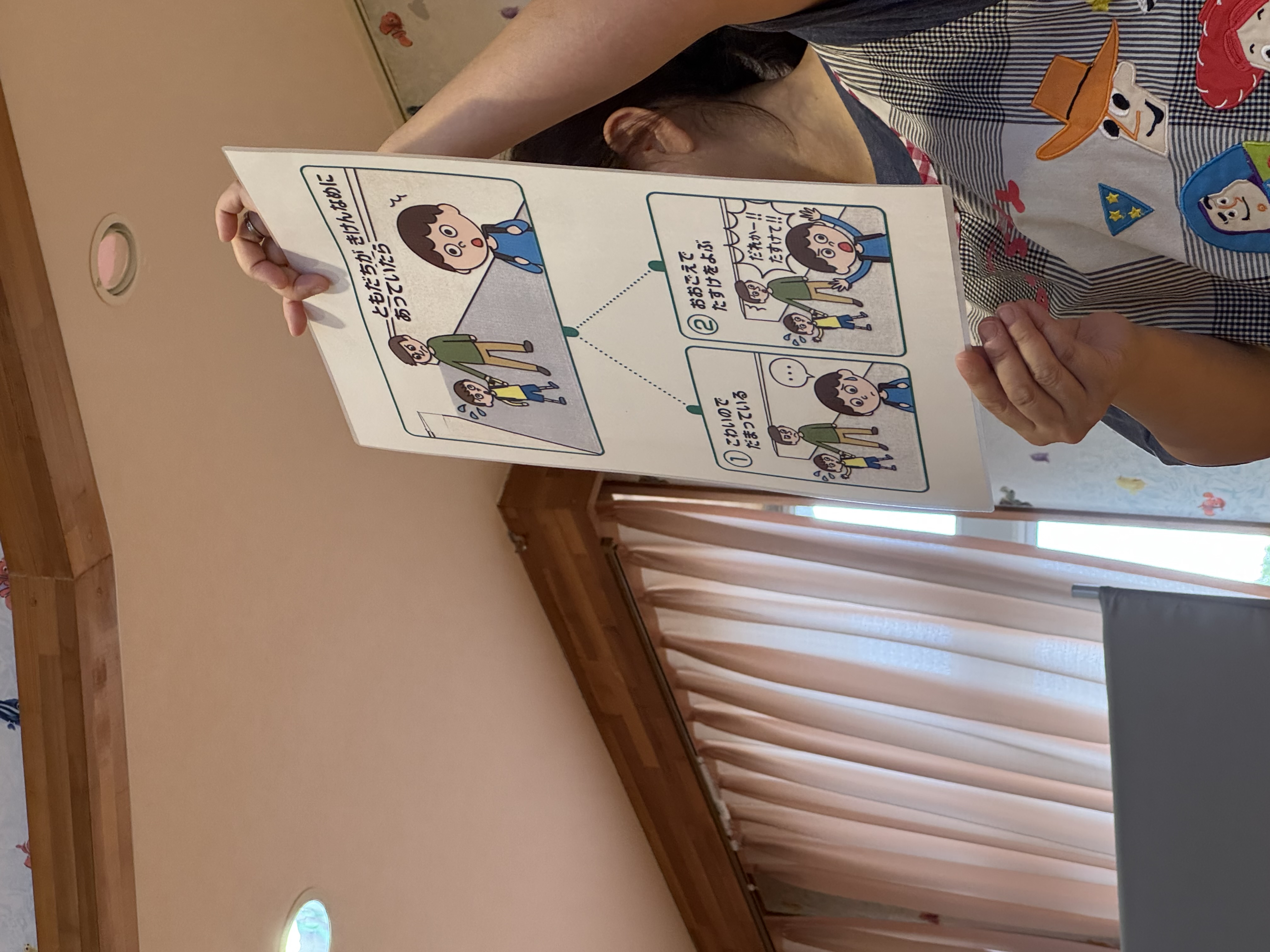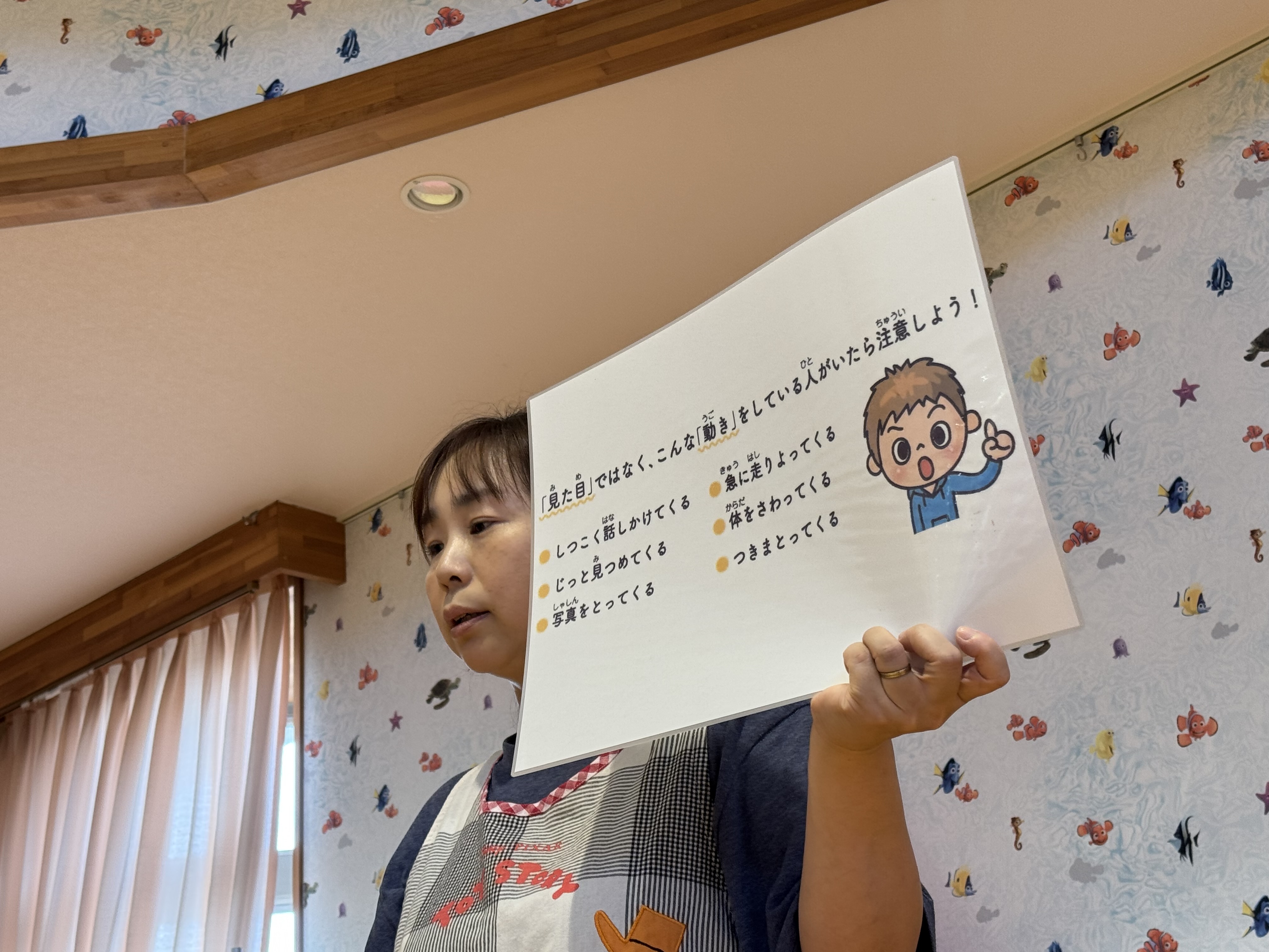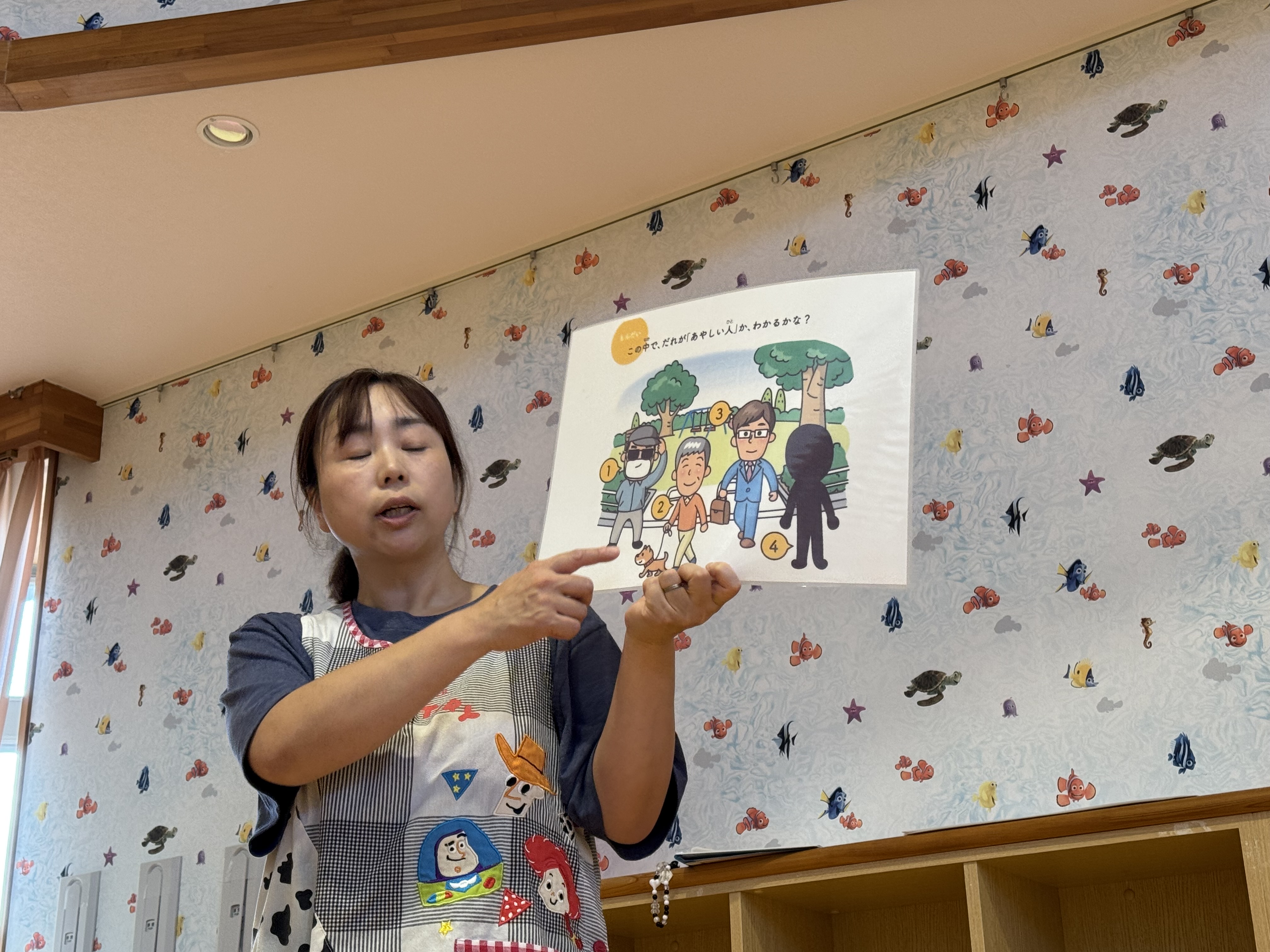 「逃げる」「先生に知らせる」「あいこども園に電話する」「110番」など様々な声が聞かれました!