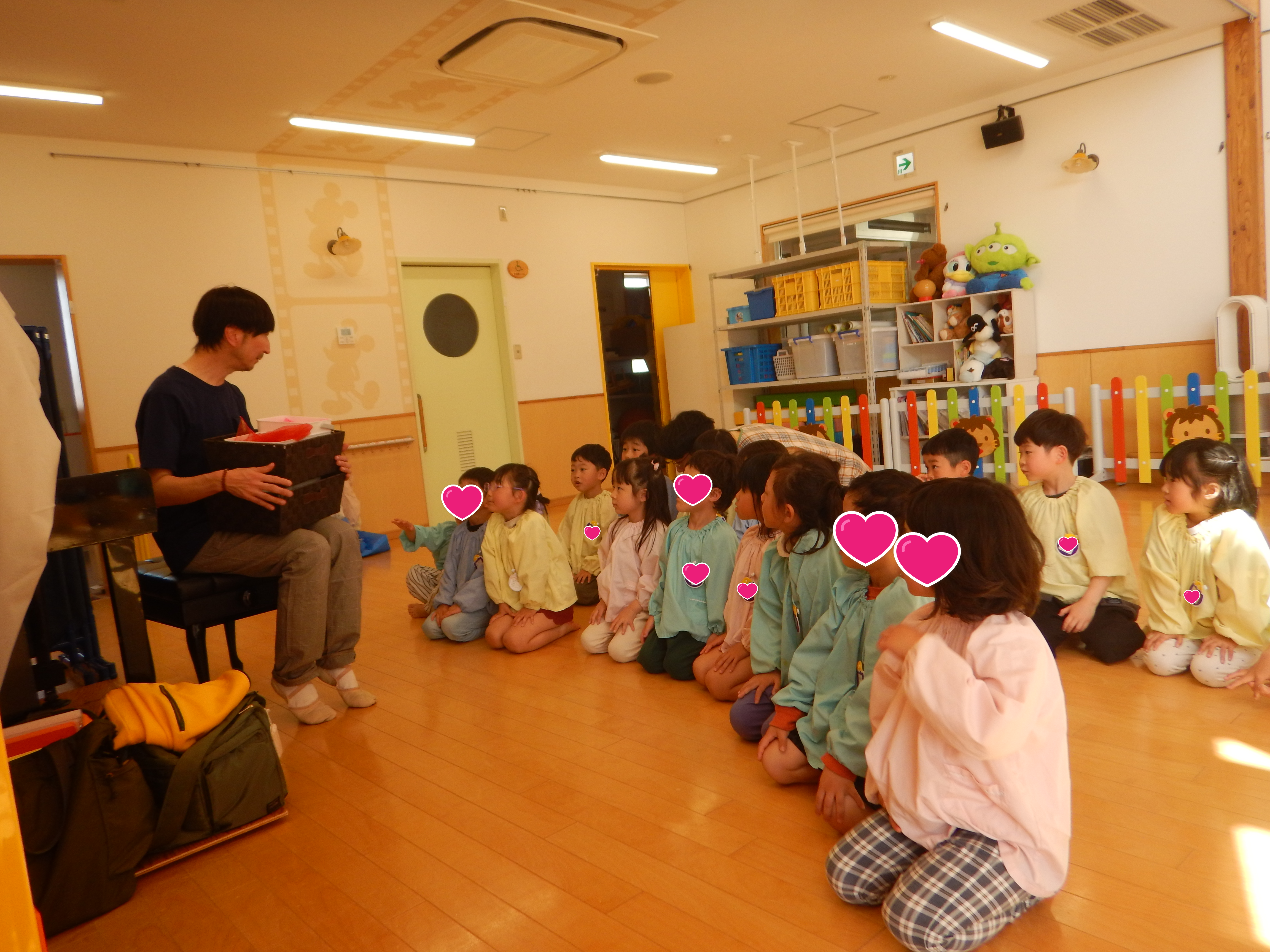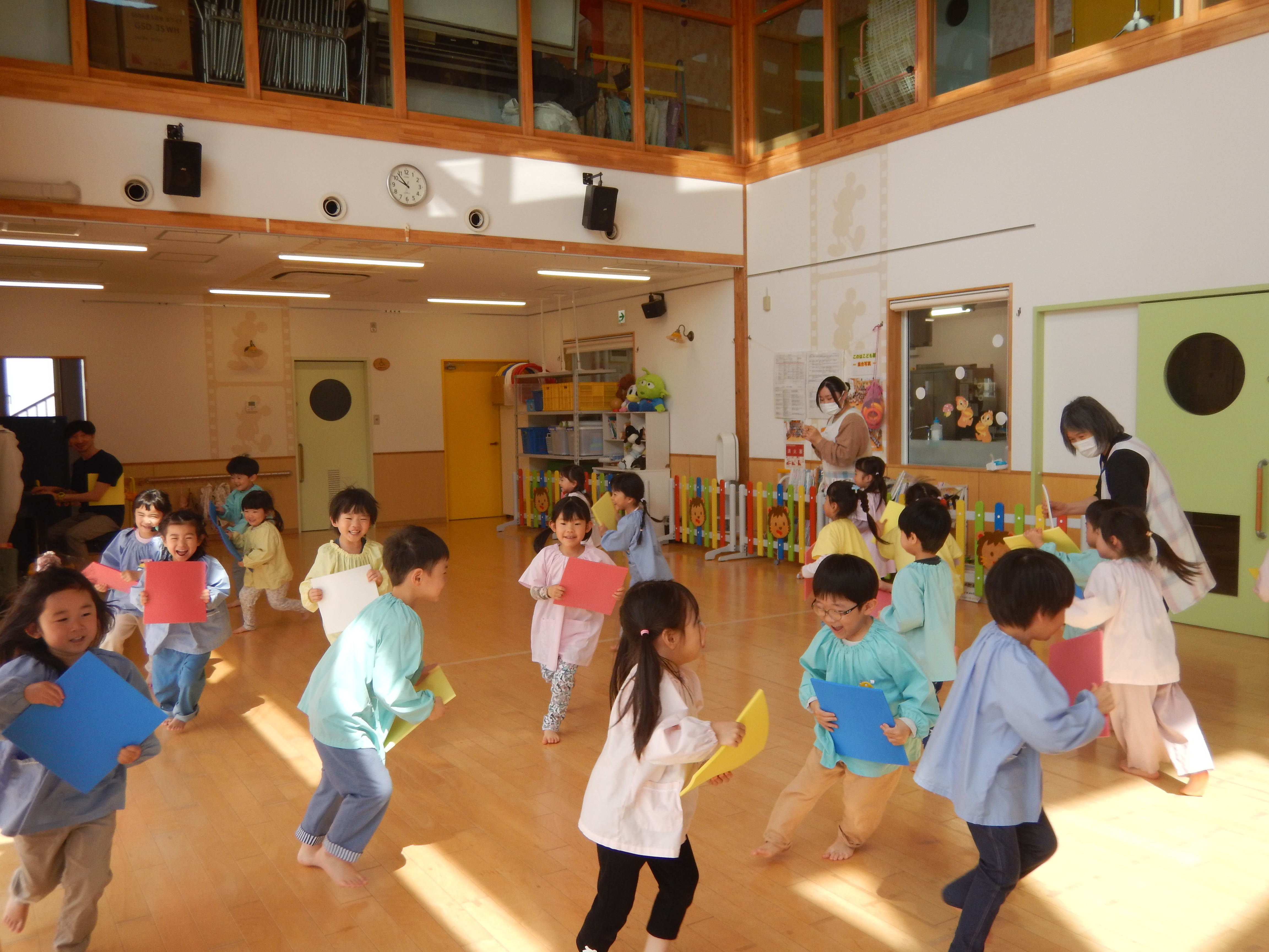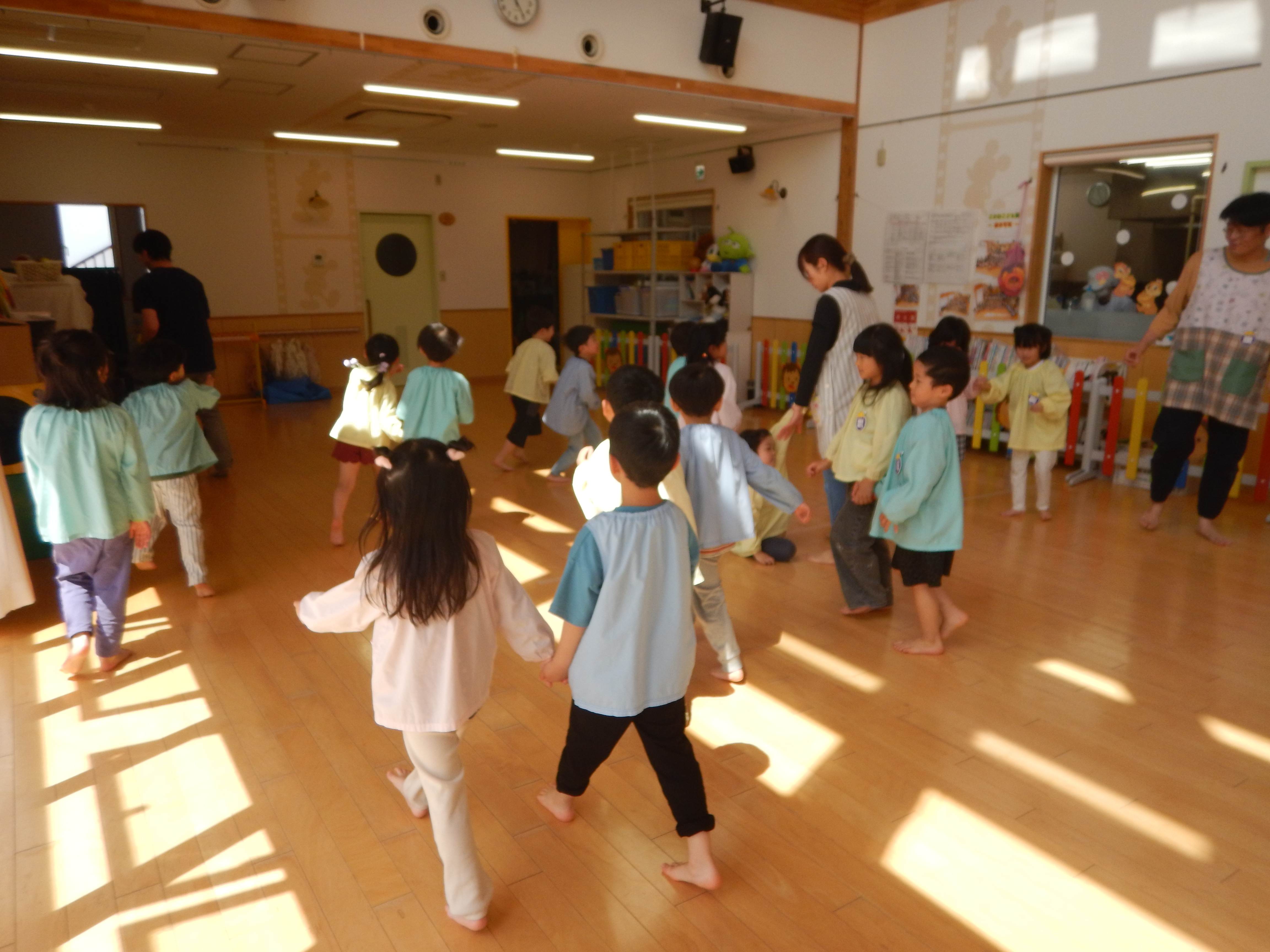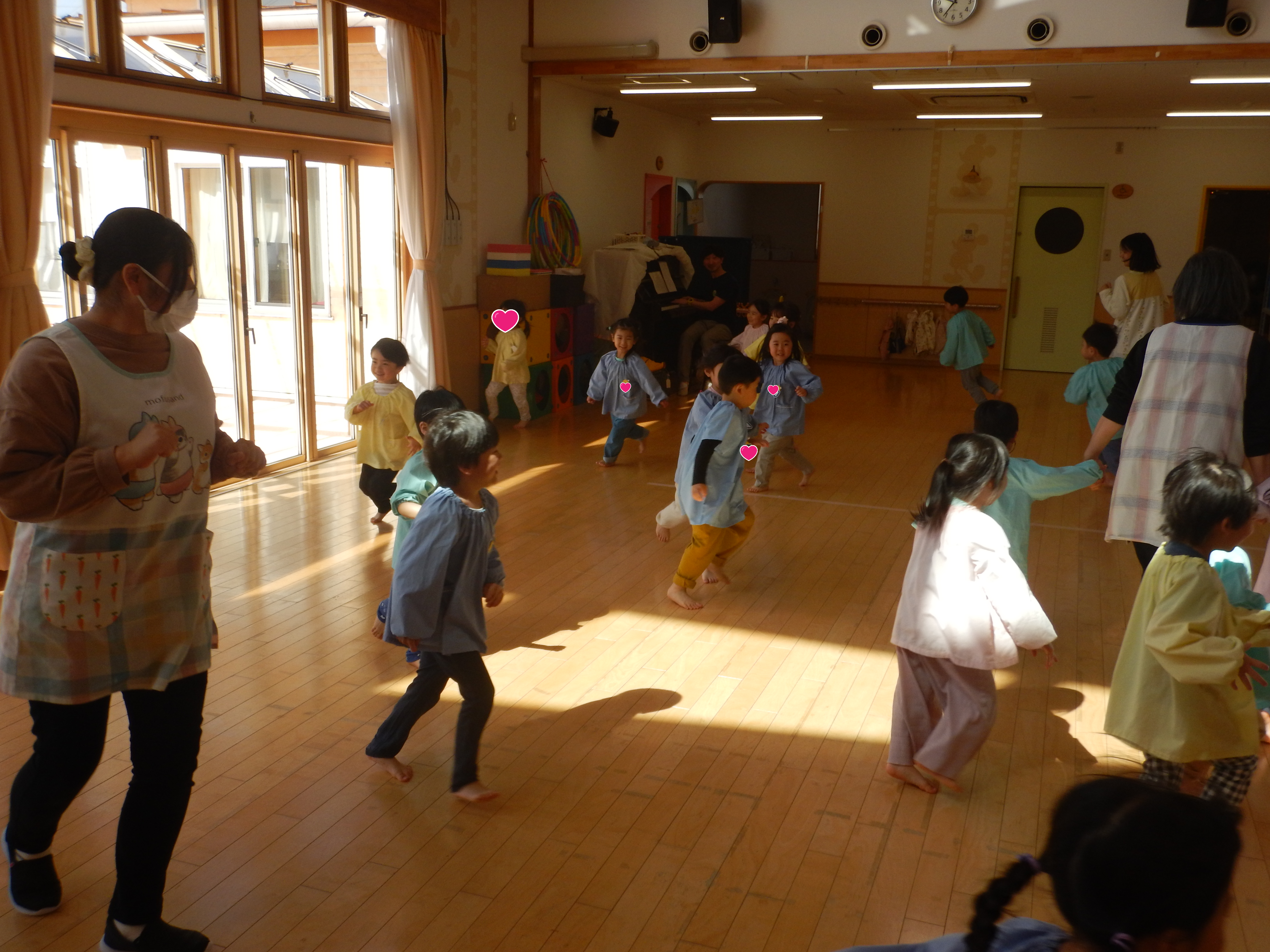 今日は、今年度初のリトミック教室でした。各クラス入れ替わりで行いました。先生のピアノに合わせてスキップしたり立ち止まったり方向転換してスキップしたり。スピードに乗りながら楽しく参加していました。