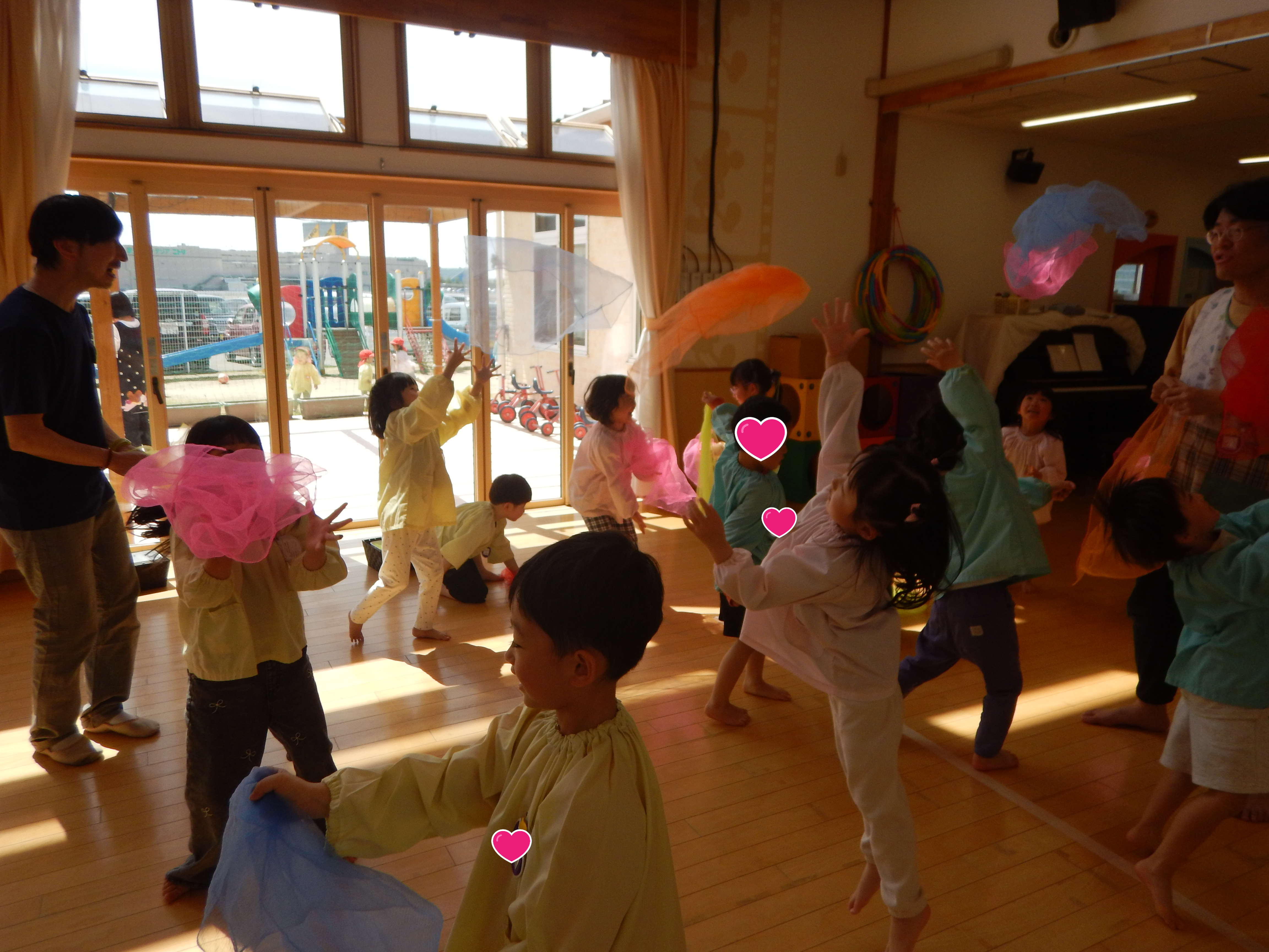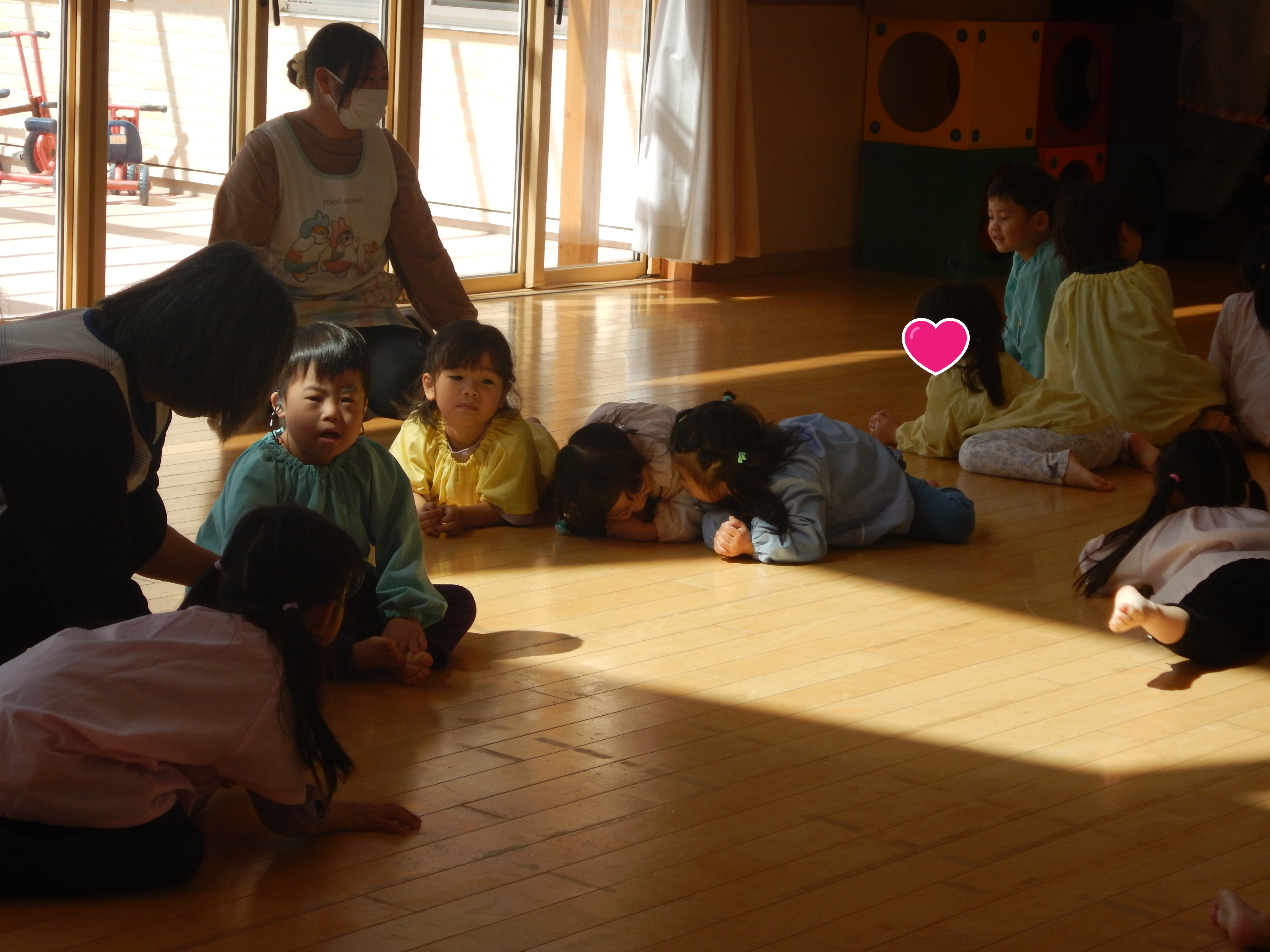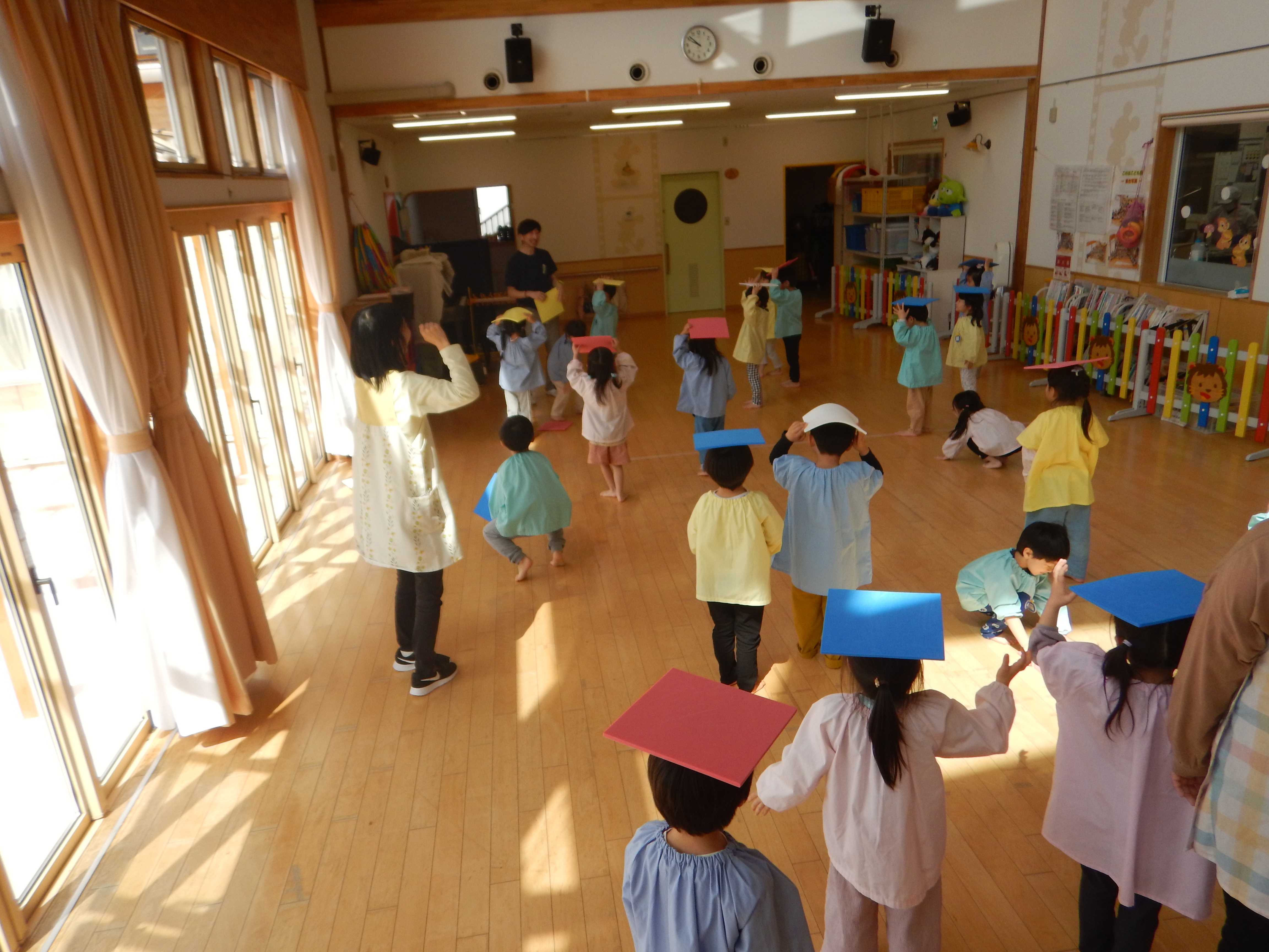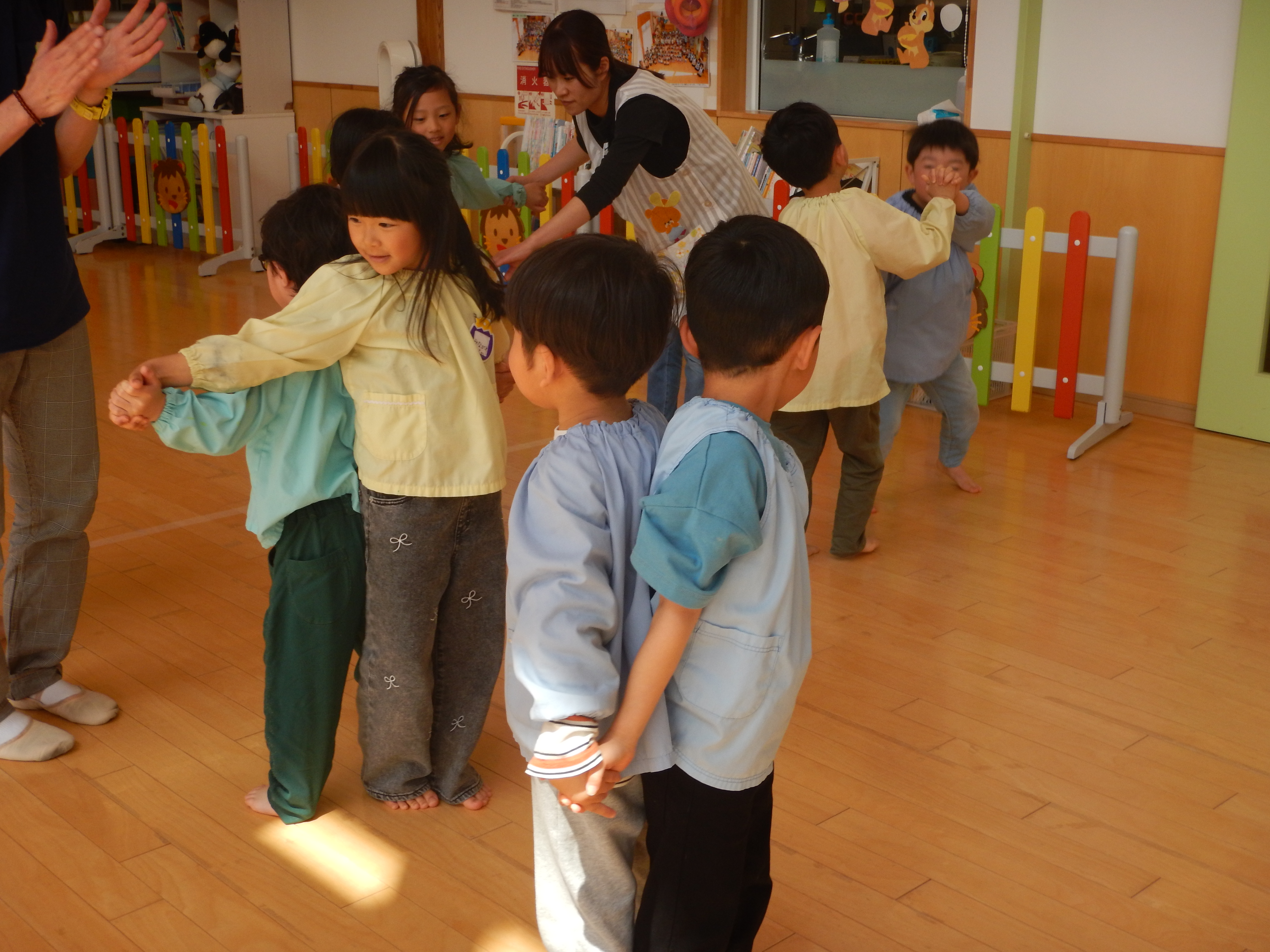 5歳児さんは、お友だちと2人組になり腕の間に頭をくぐらせ背中同士をくっつけたりまた元にもどったり、スカーフを使ってチューリップの歌を歌いながら花を咲かせてみたりと笑顔があふれた時間でした。