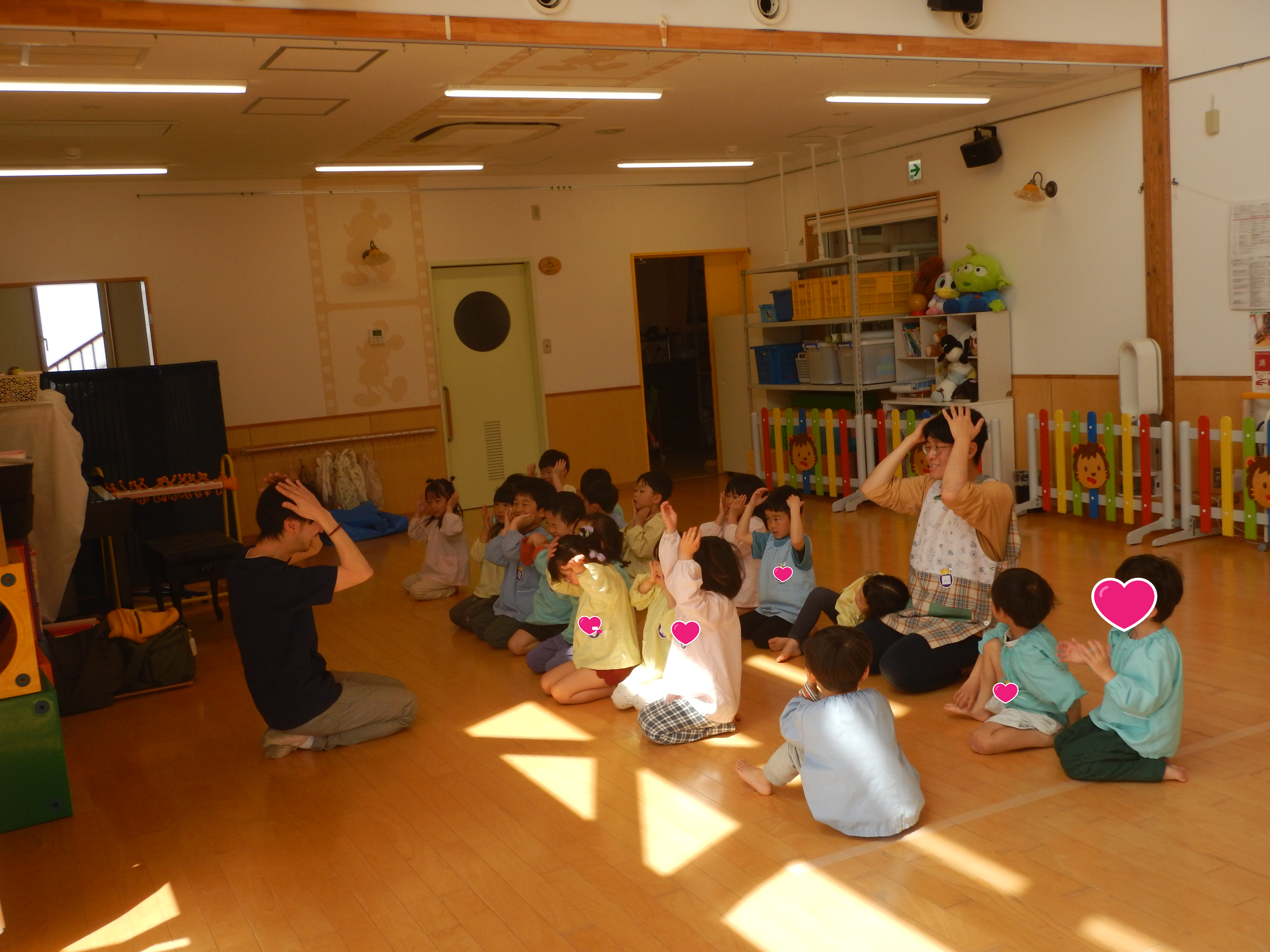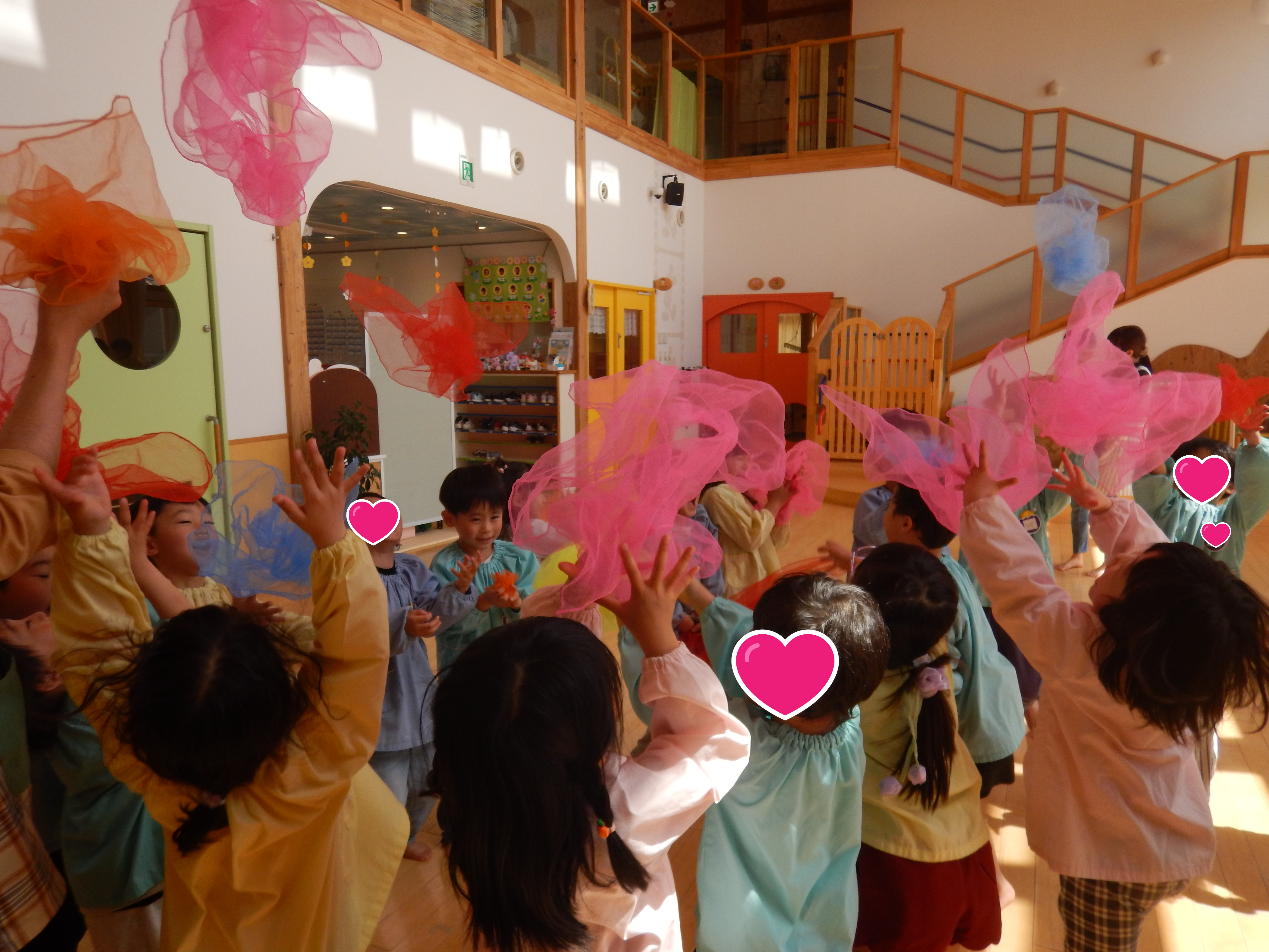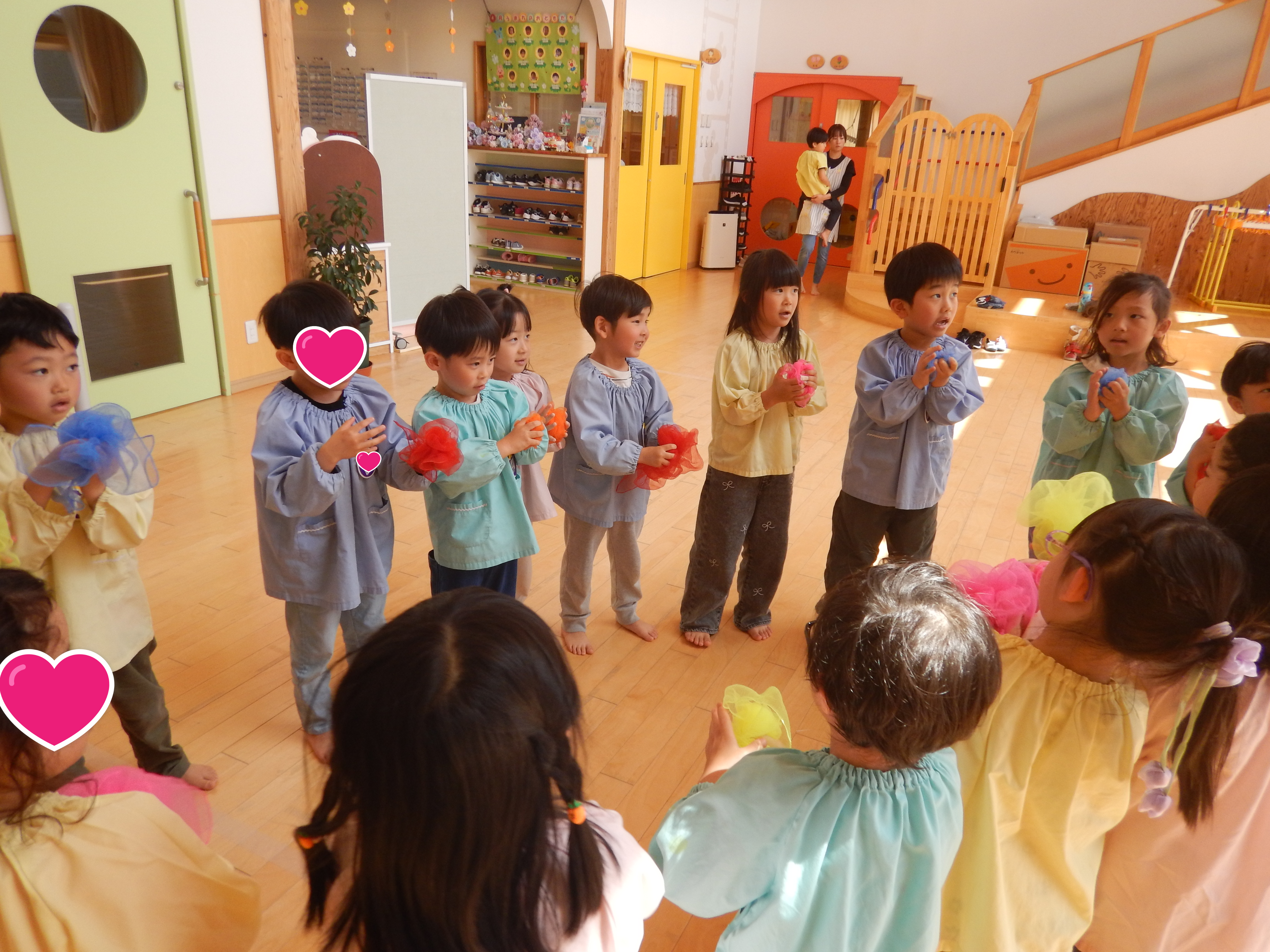5歳児さんは、お友だちと2人組になり腕の間に頭をくぐらせ背中同士をくっつけたりまた元にもどったり、スカーフを使ってチューリップの歌を歌いながら花を咲かせてみたりと笑顔があふれた時間でした。