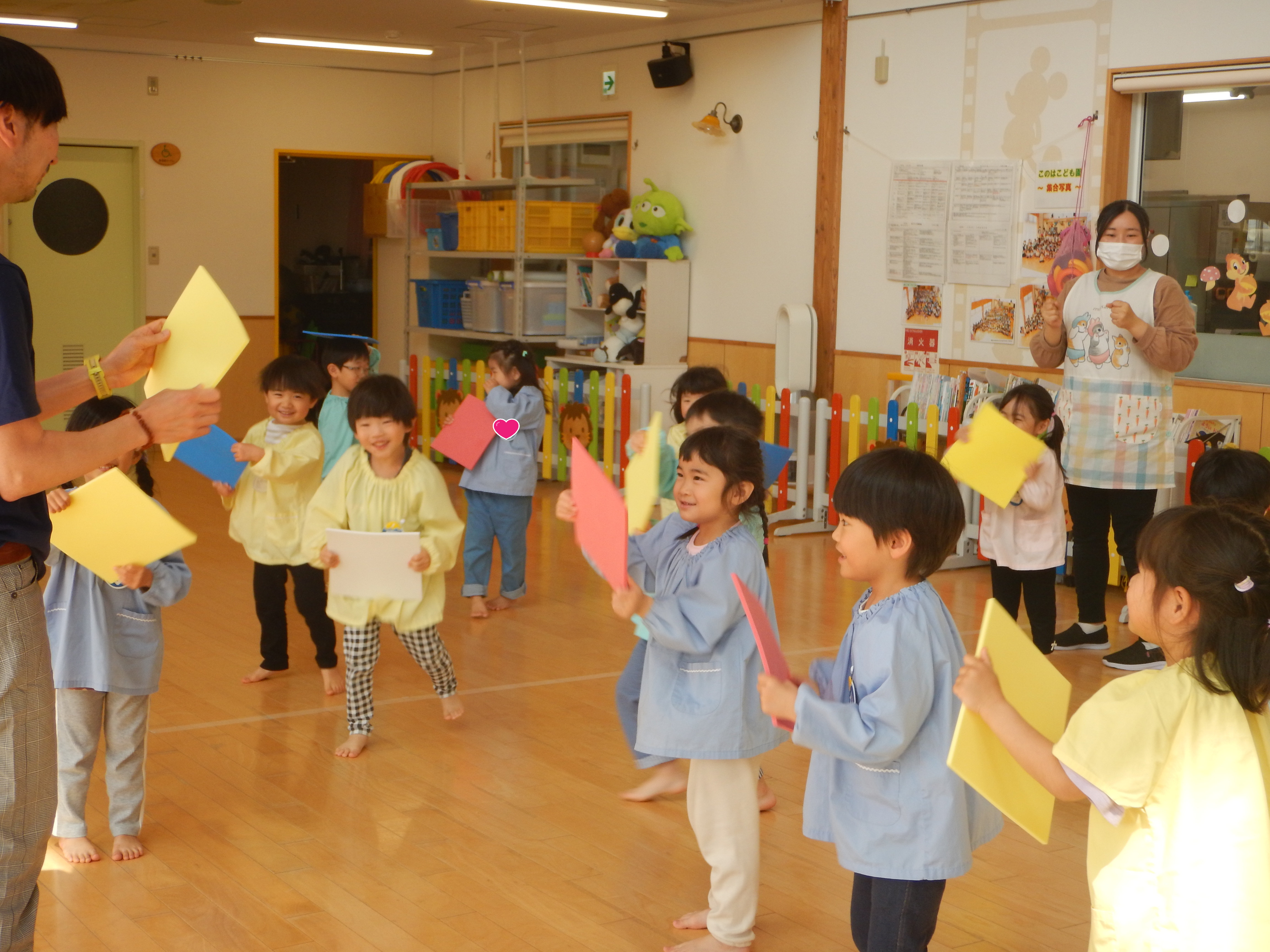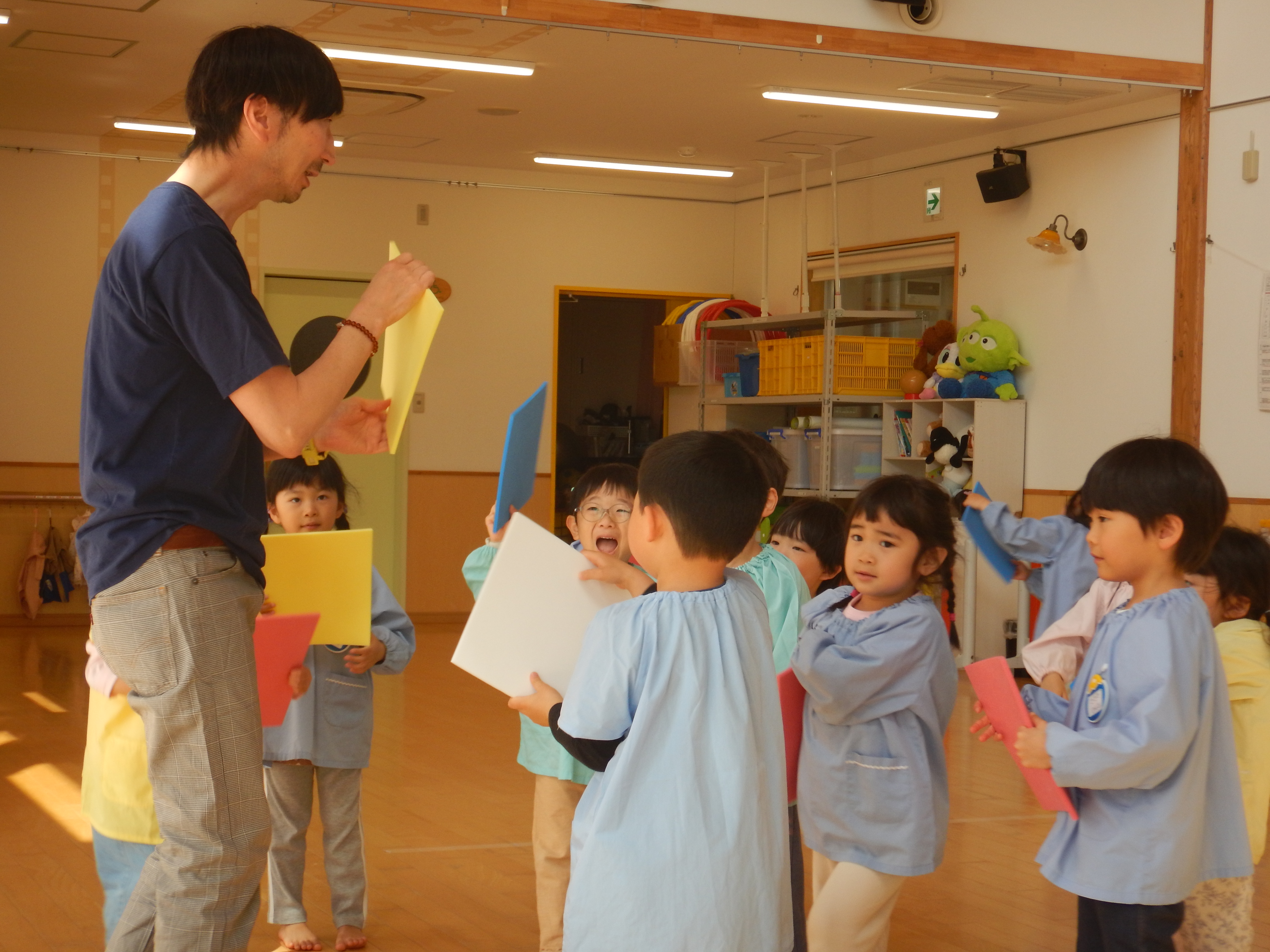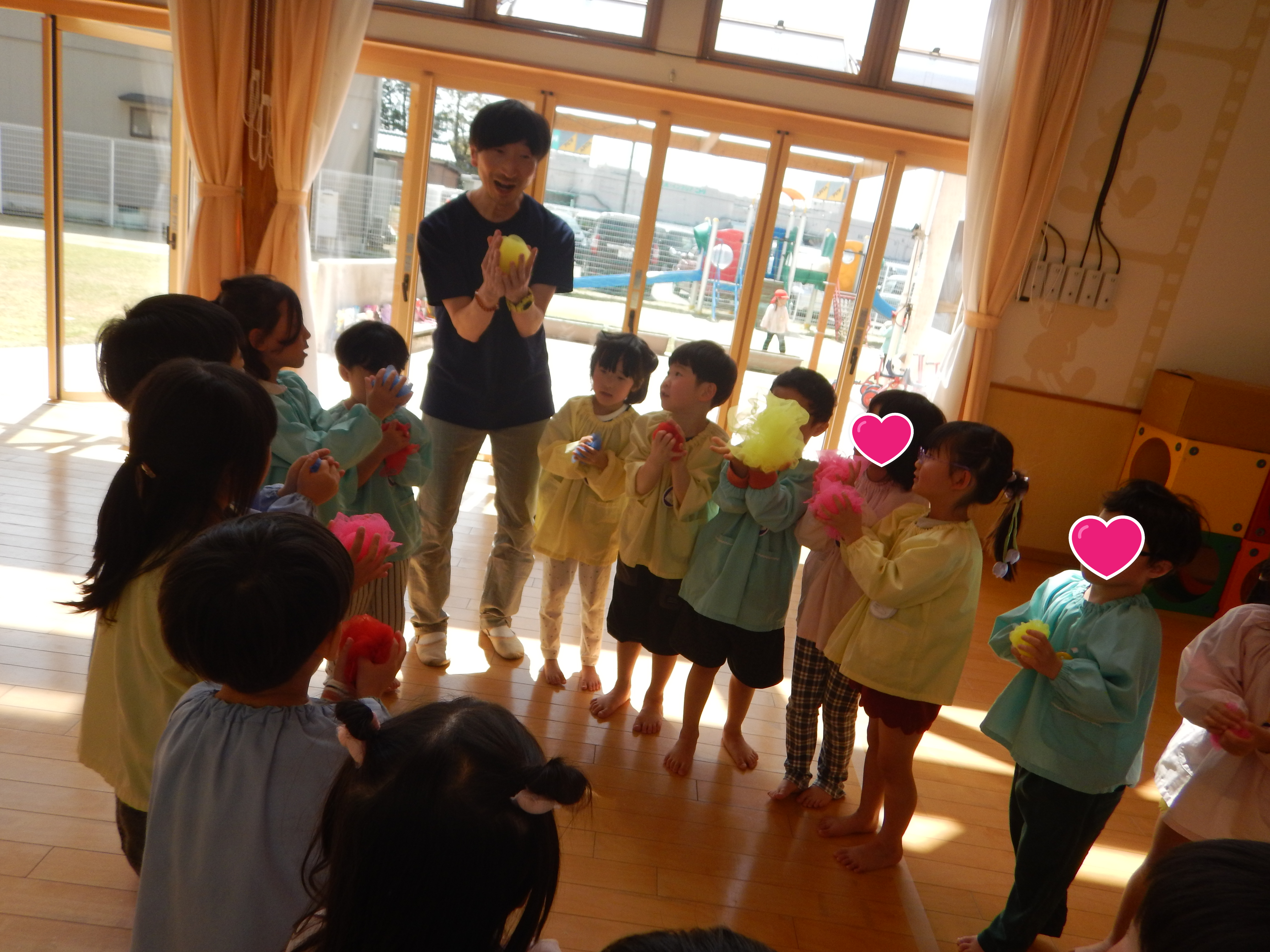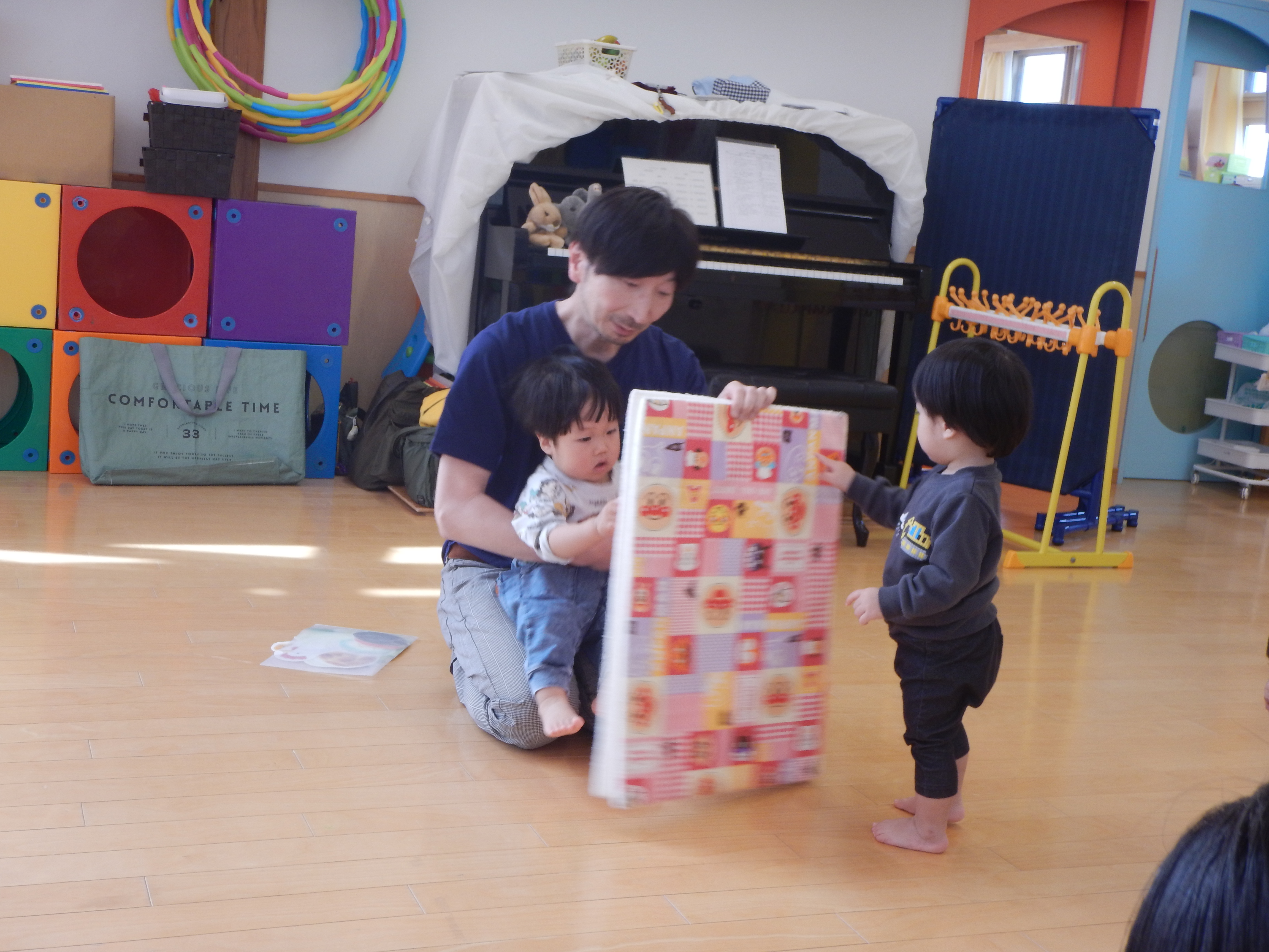 5歳児さんは、お友だちと2人組になり腕の間に頭をくぐらせ背中同士をくっつけたりまた元にもどったり、スカーフを使ってチューリップの歌を歌いながら花を咲かせてみたりと笑顔があふれた時間でした。