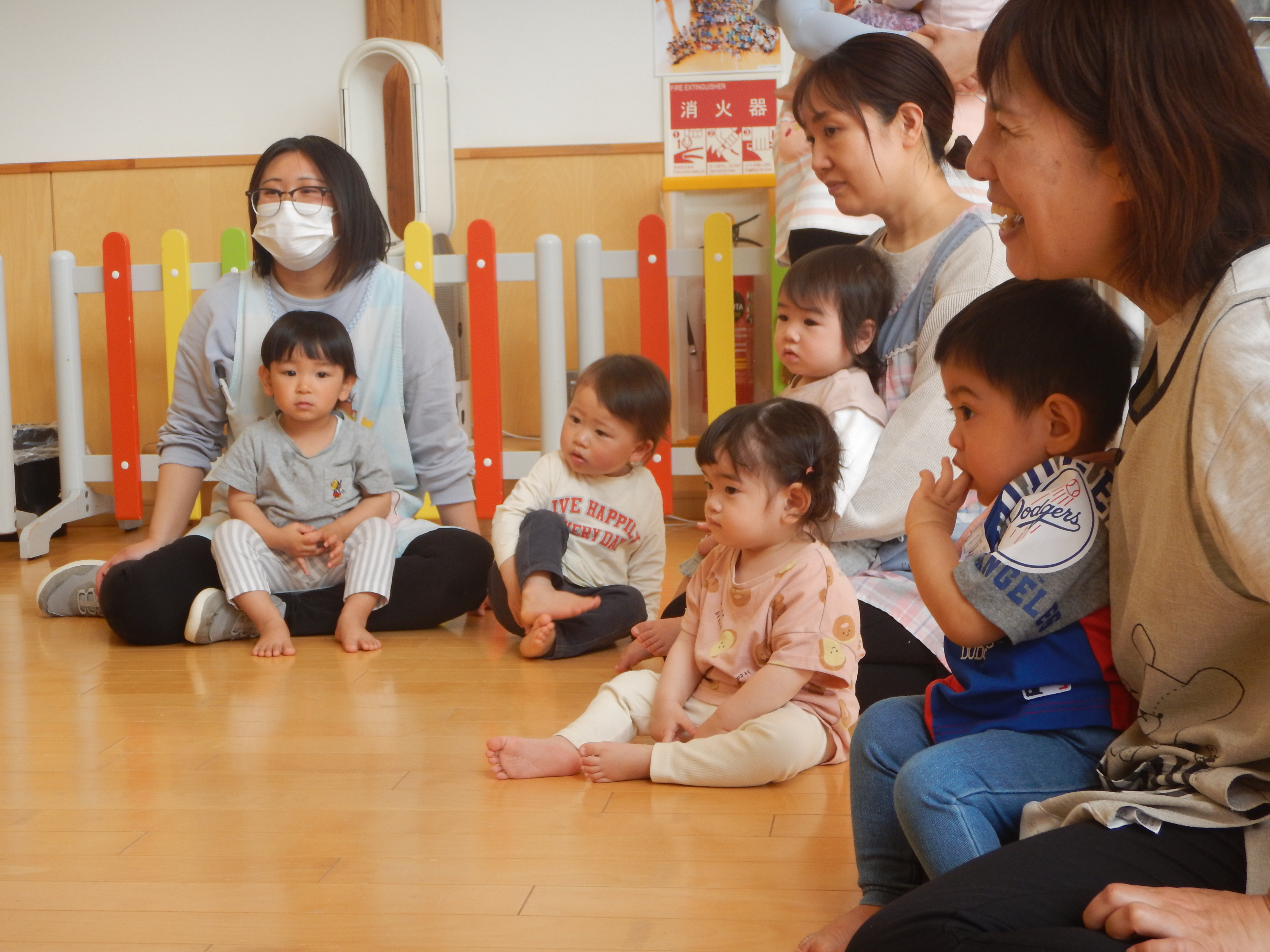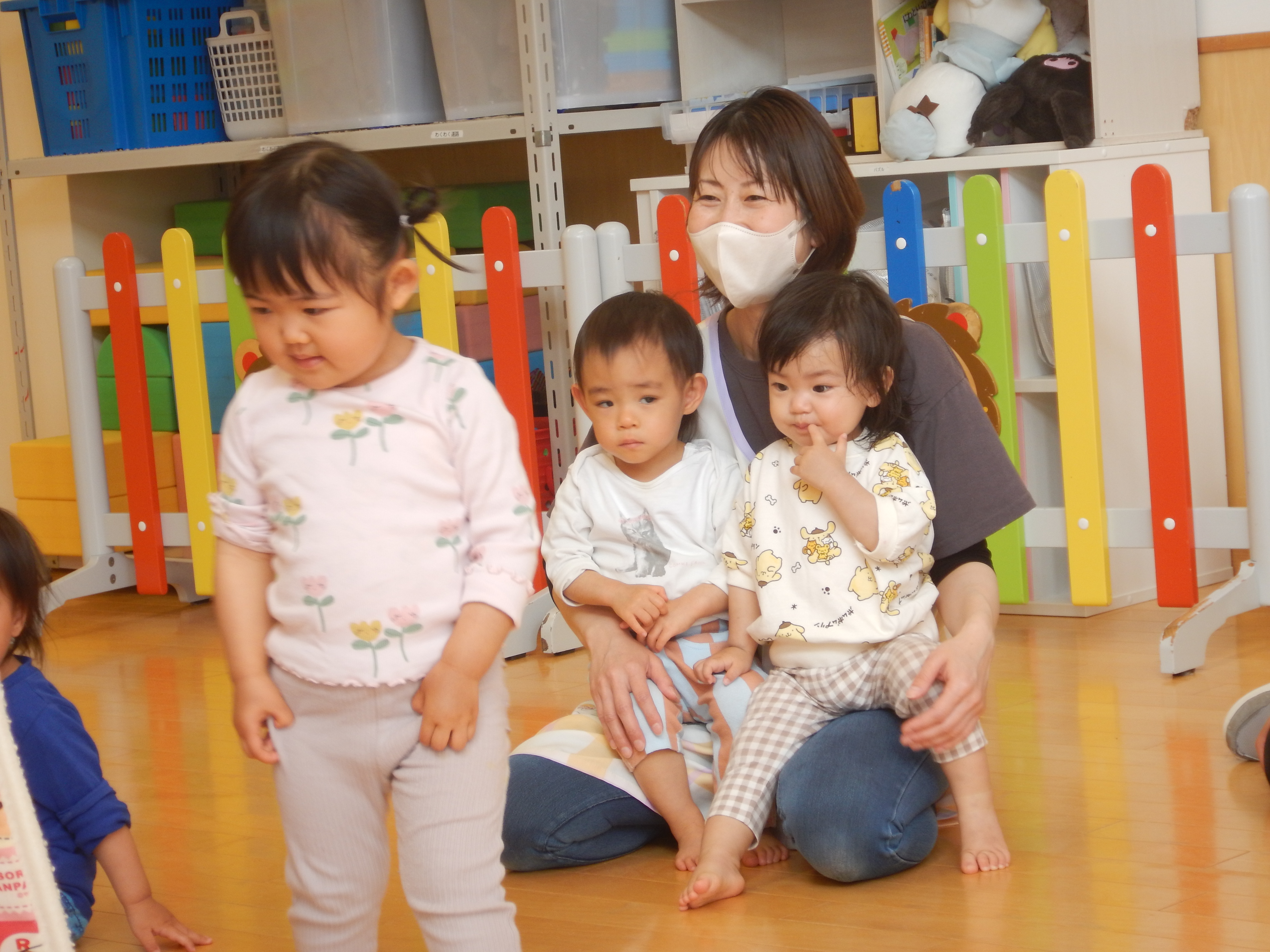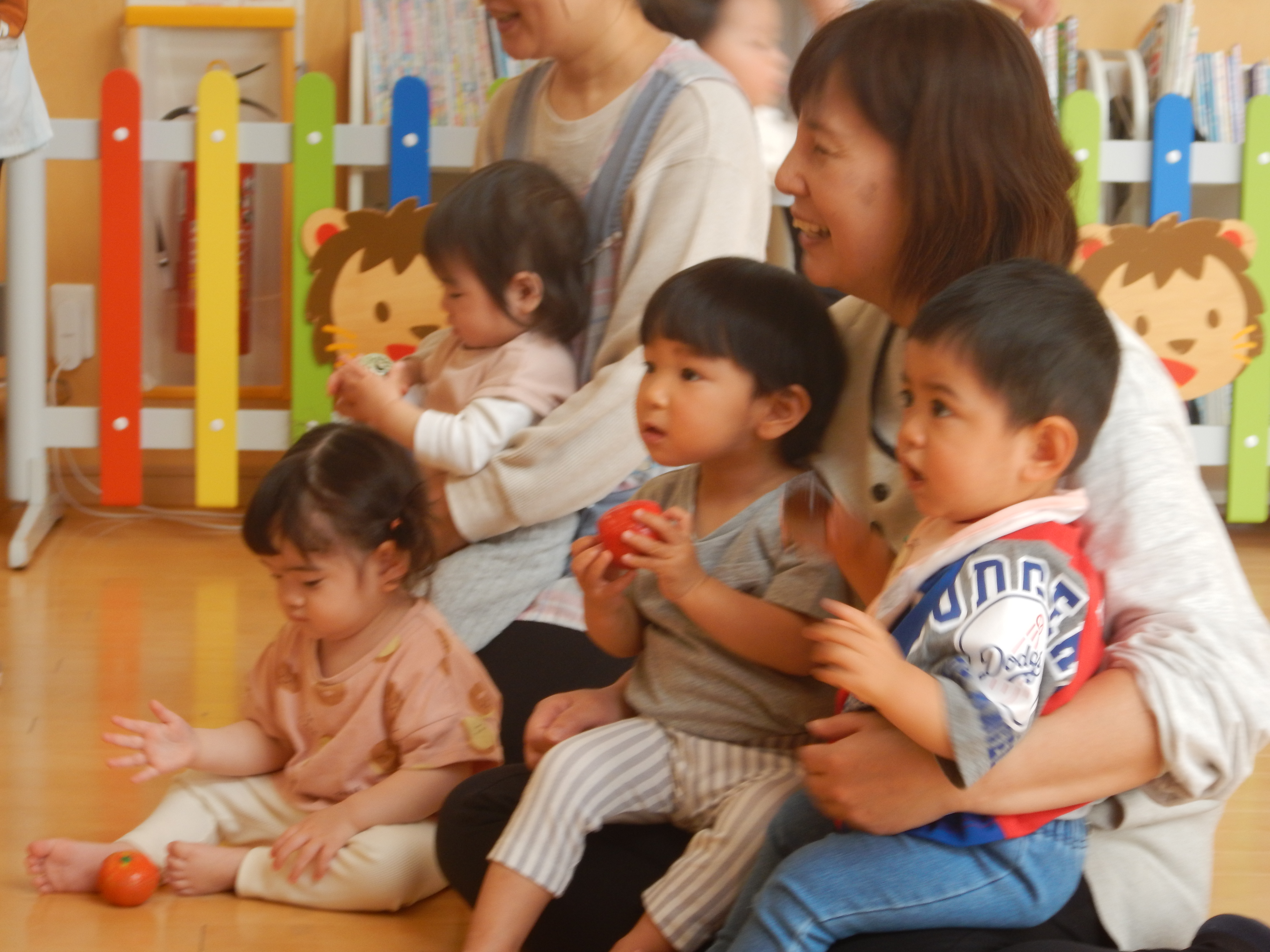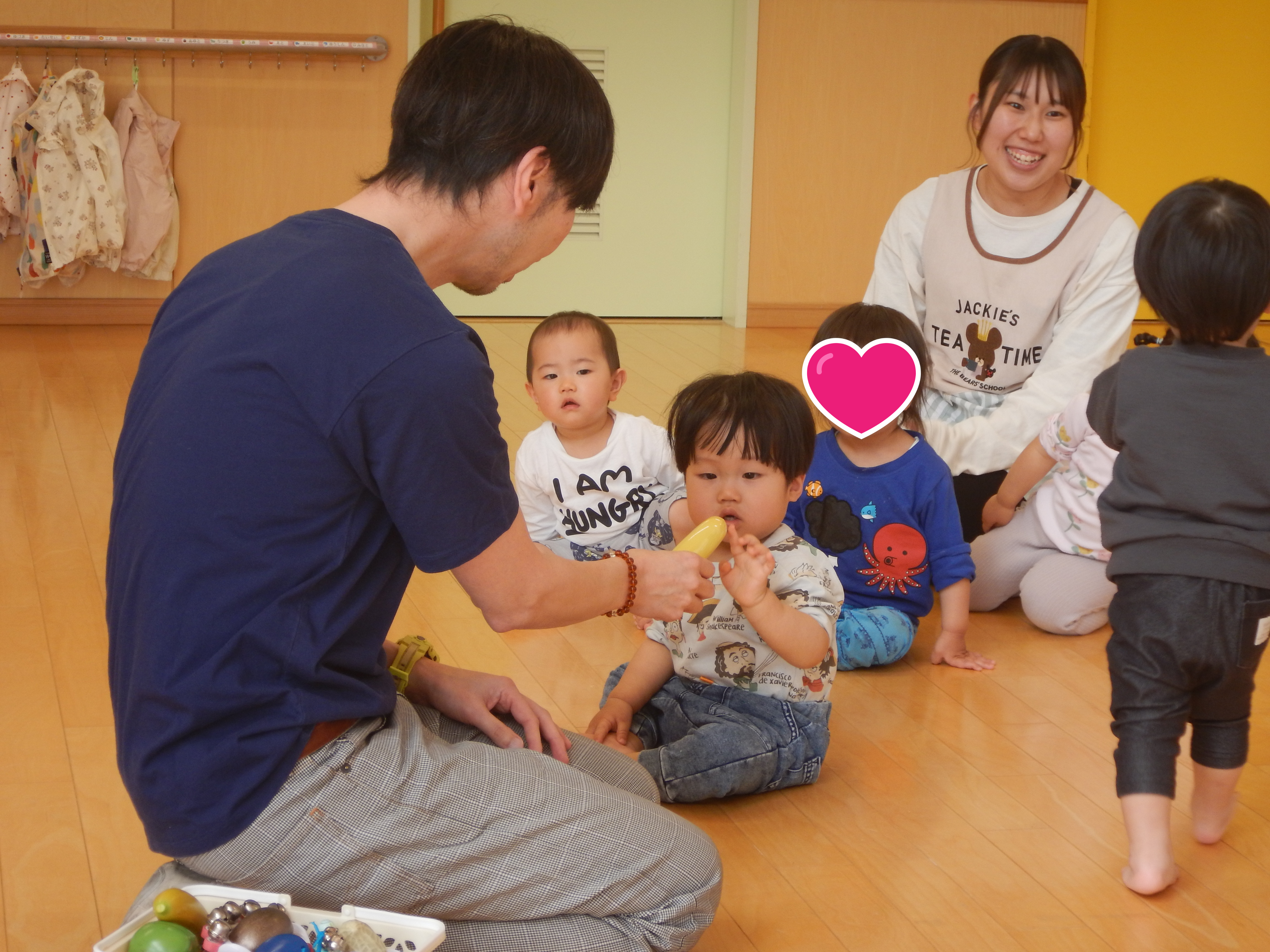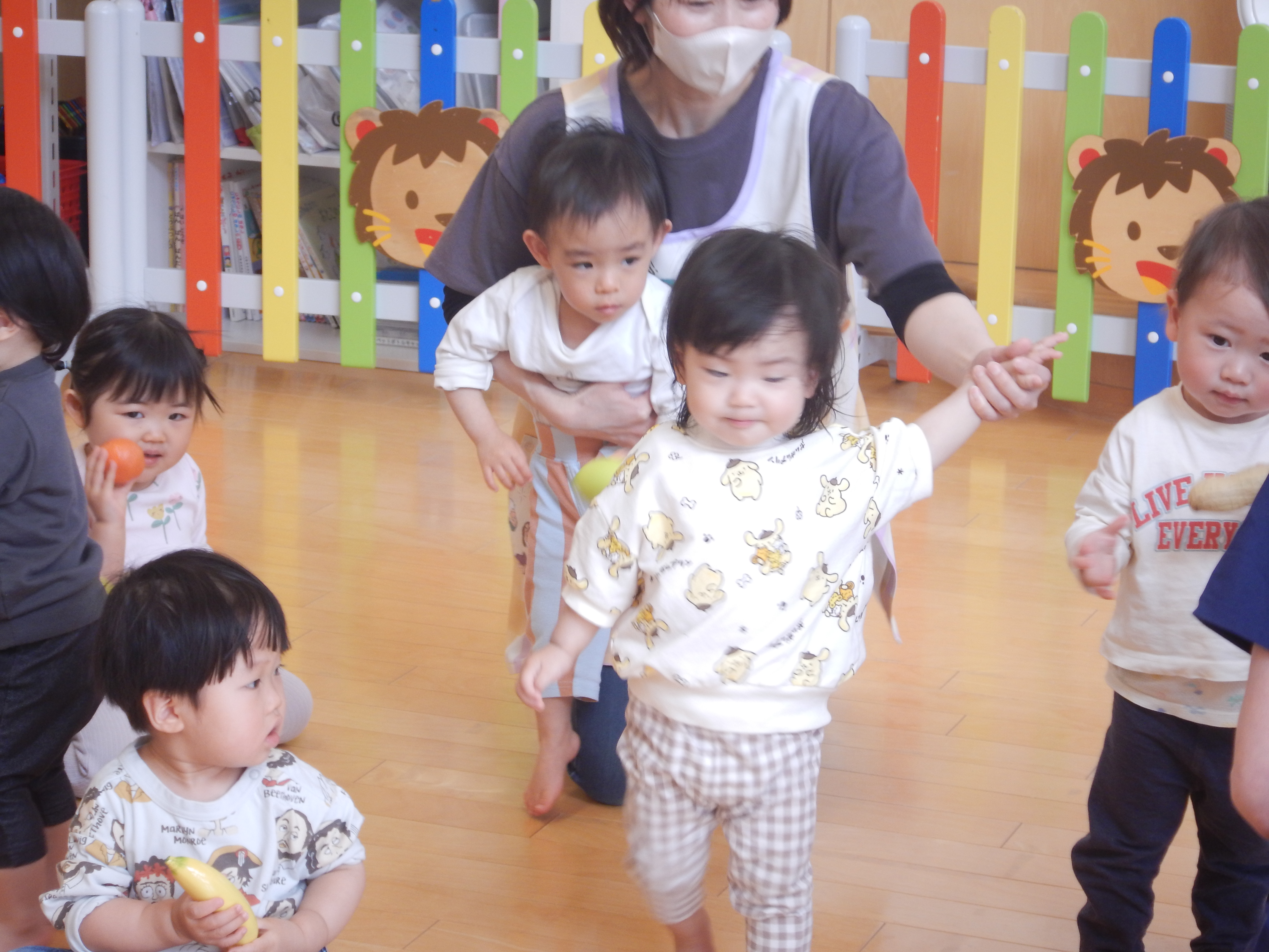 1歳児クラスさんでは、シャカシャカと音のなるフルーツを持ち音楽に合わせて鳴らしていました。