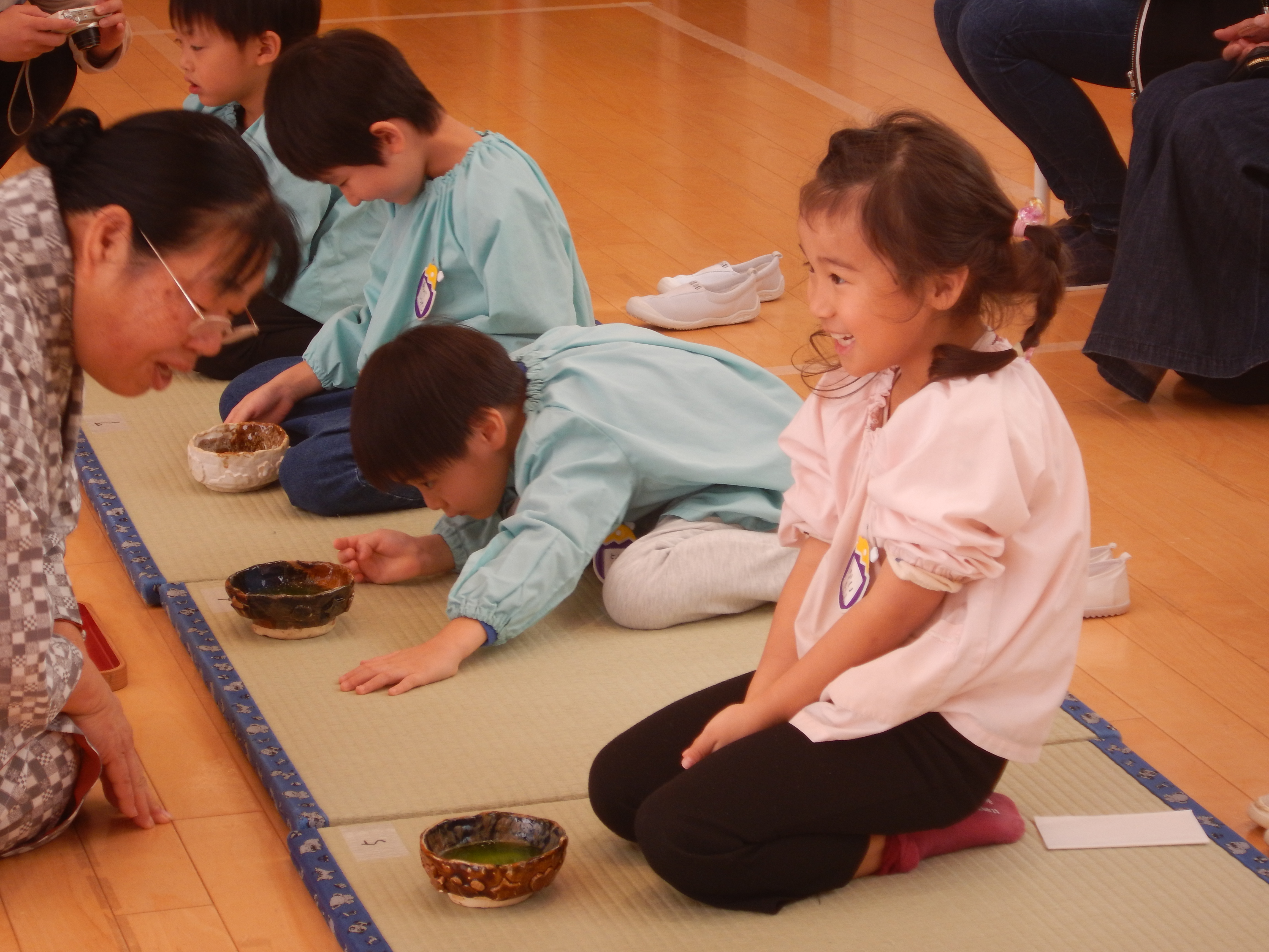 年長組さんが6月の参観日に作った抹茶茶碗を使ってお茶会をしました。