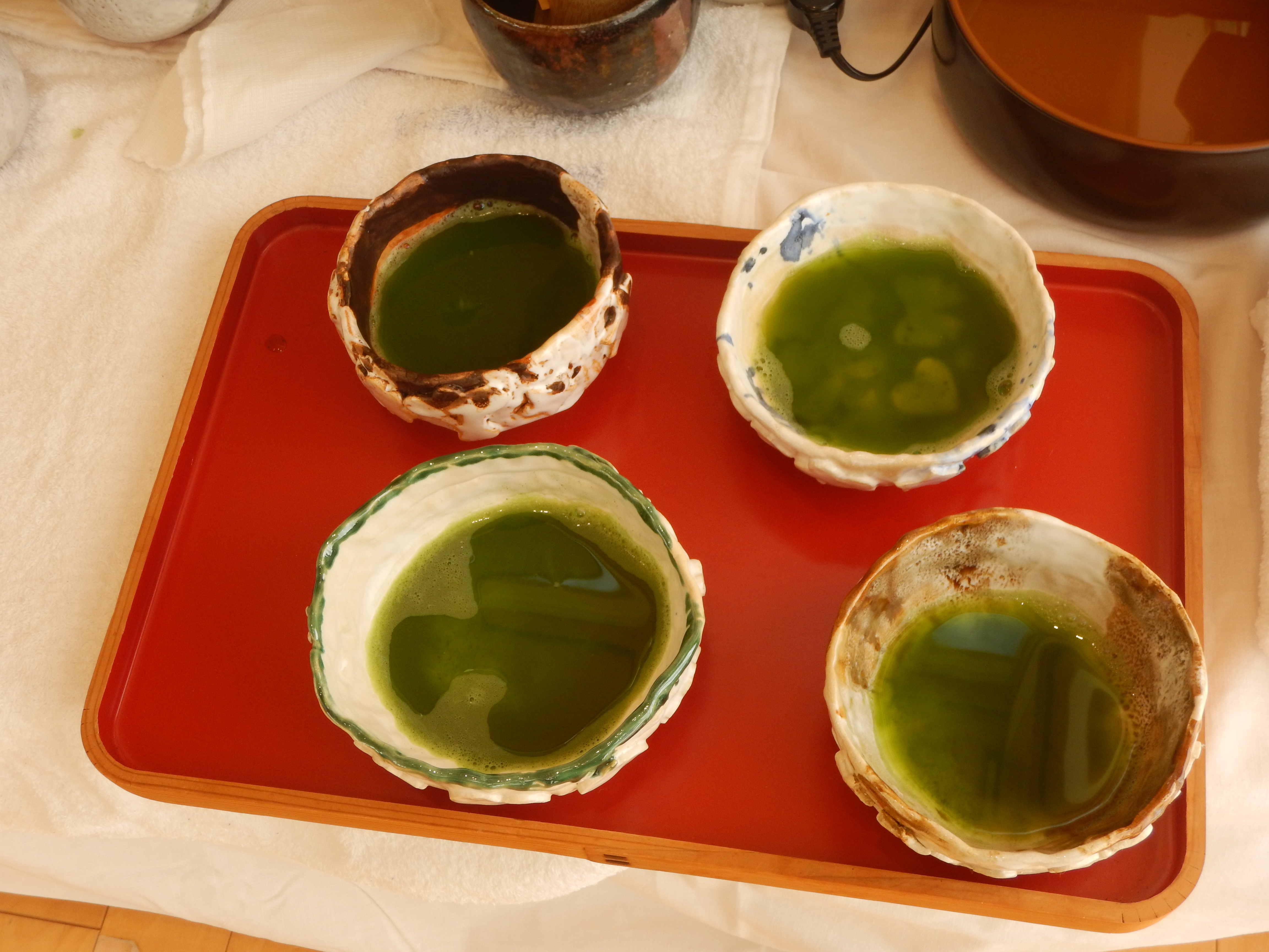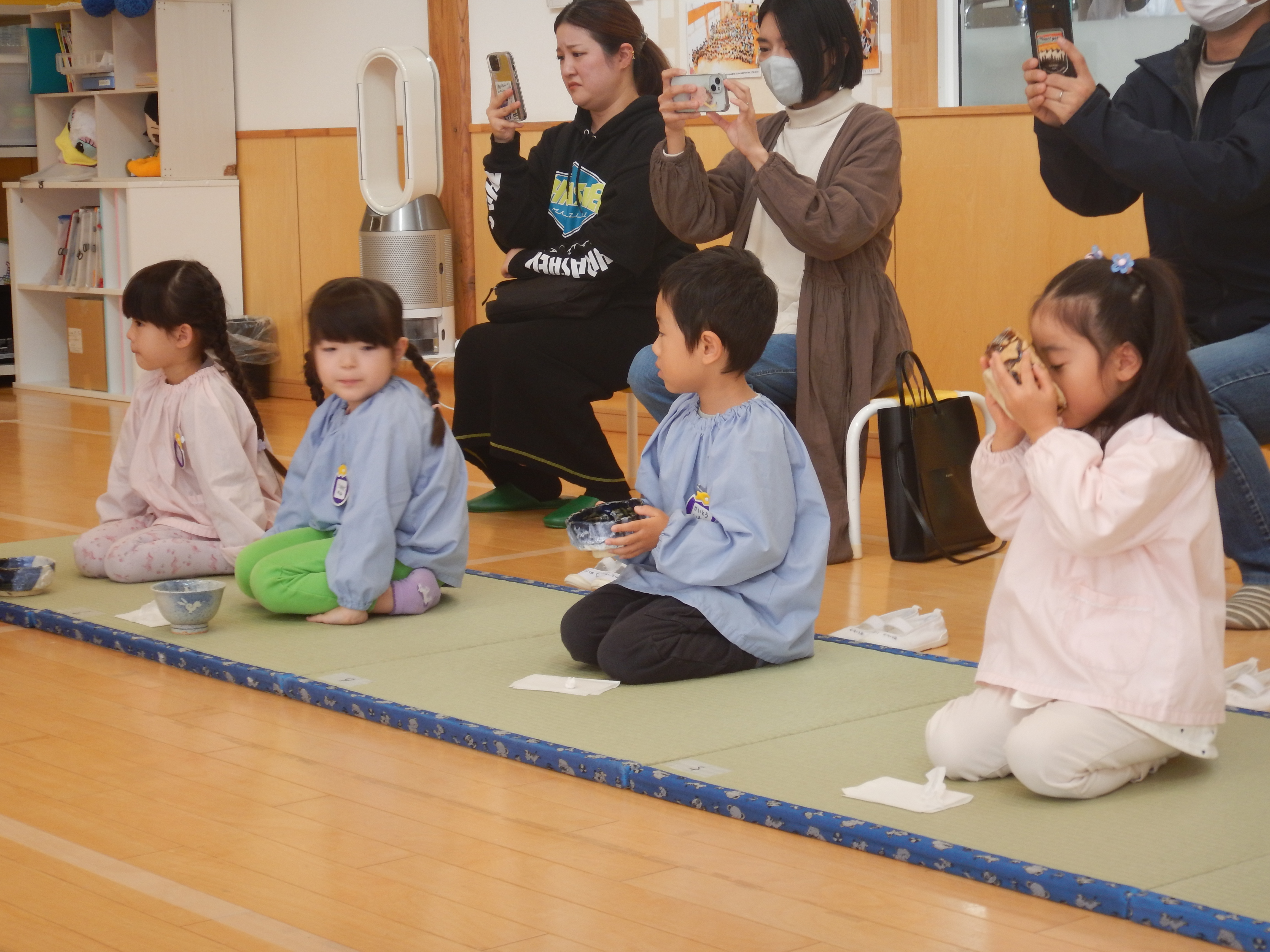 自分で作った器で飲むお抹茶の味は…一口飲んで「苦い…」。と言って手が止まる子やきれいに全部飲める子もいました。