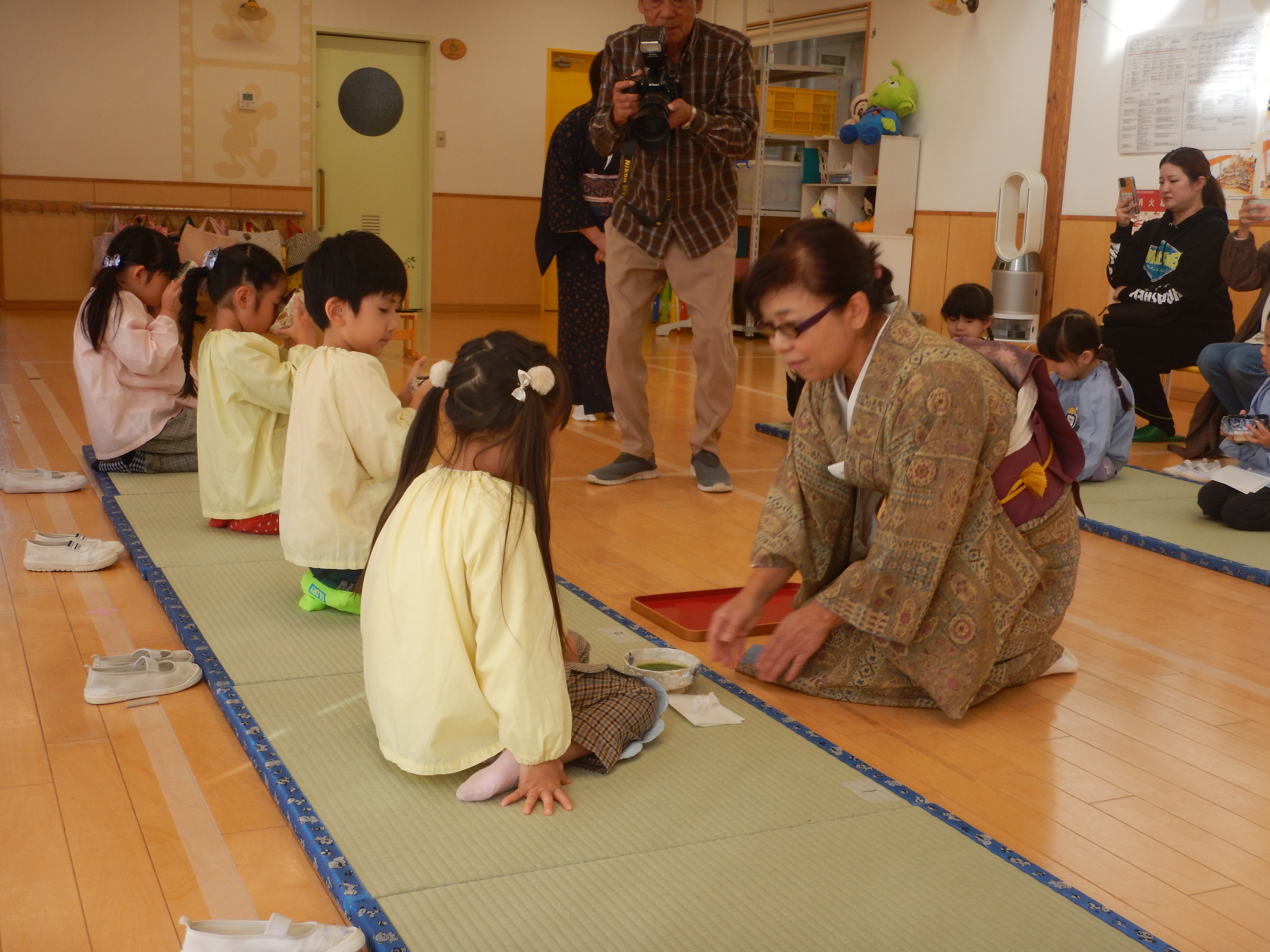 年長組さんが6月の参観日に作った抹茶茶碗を使ってお茶会をしました。