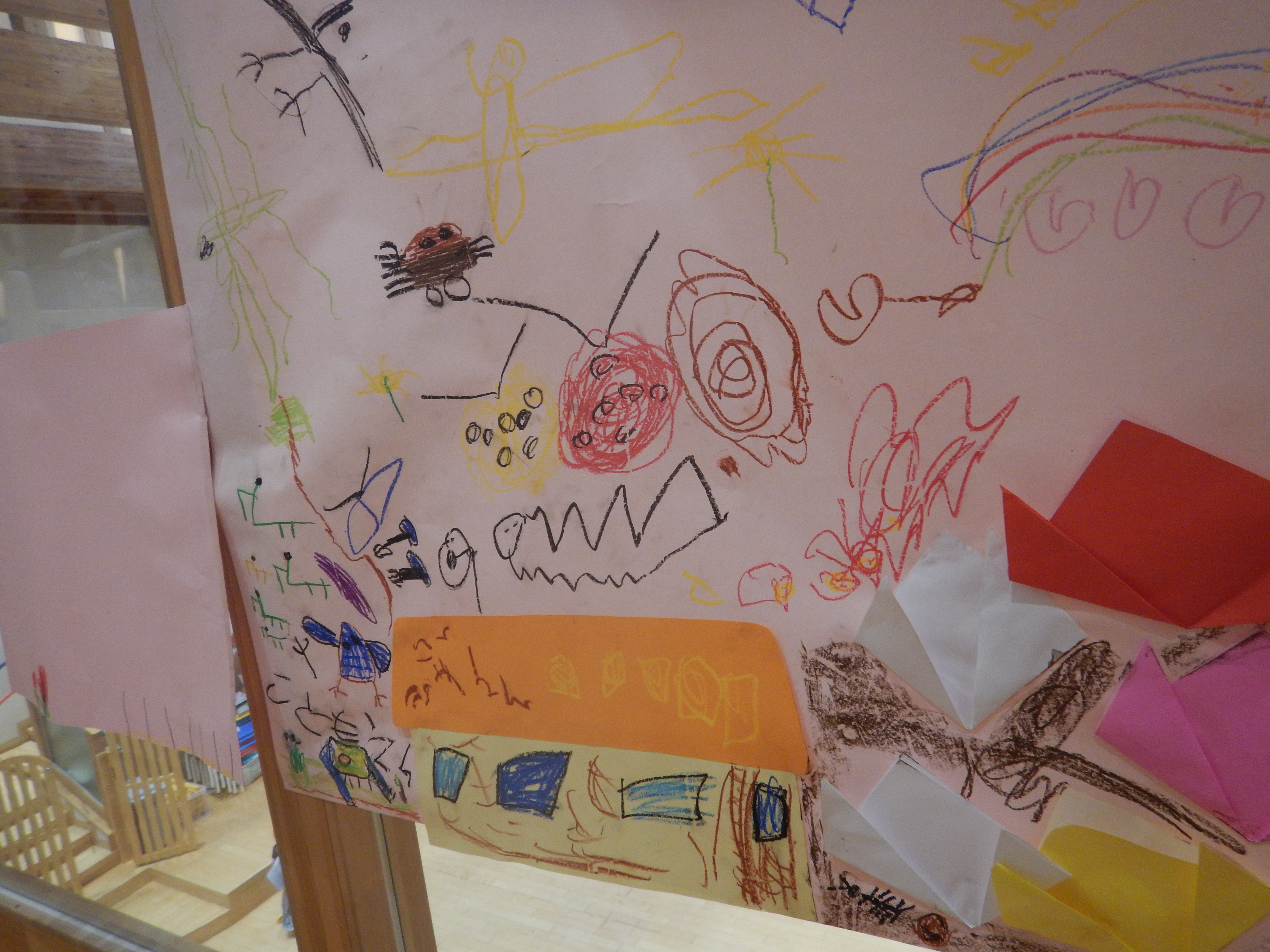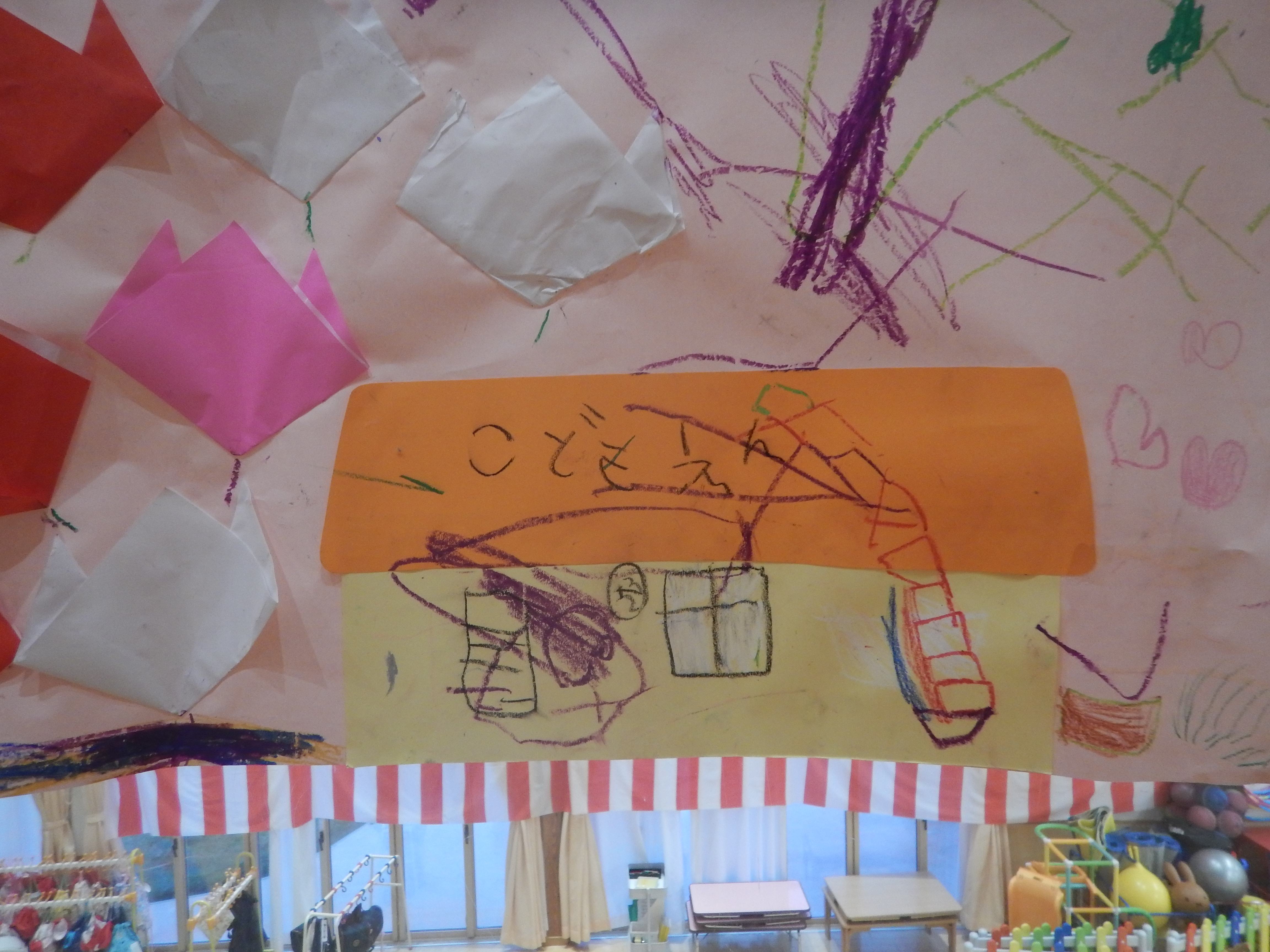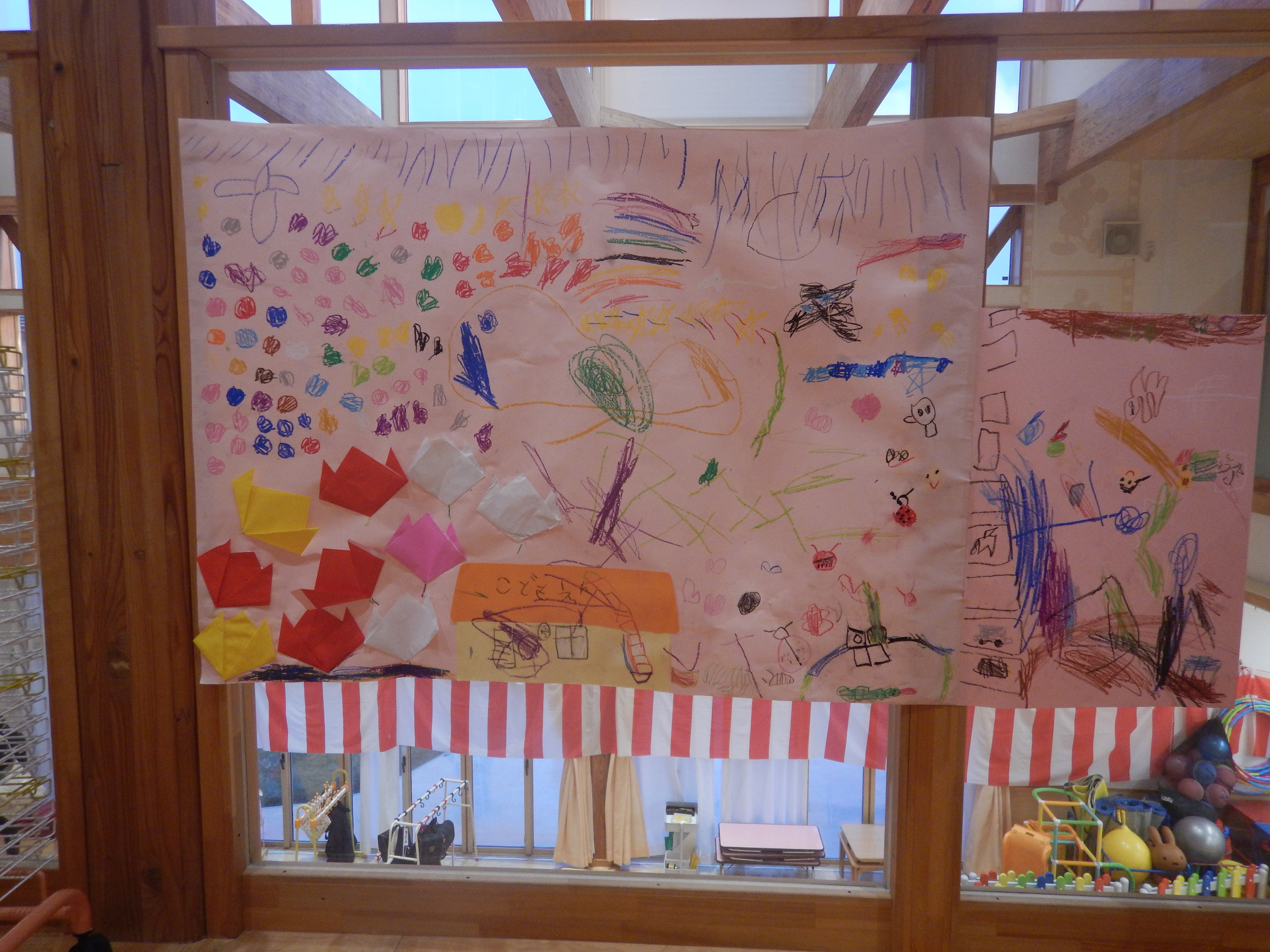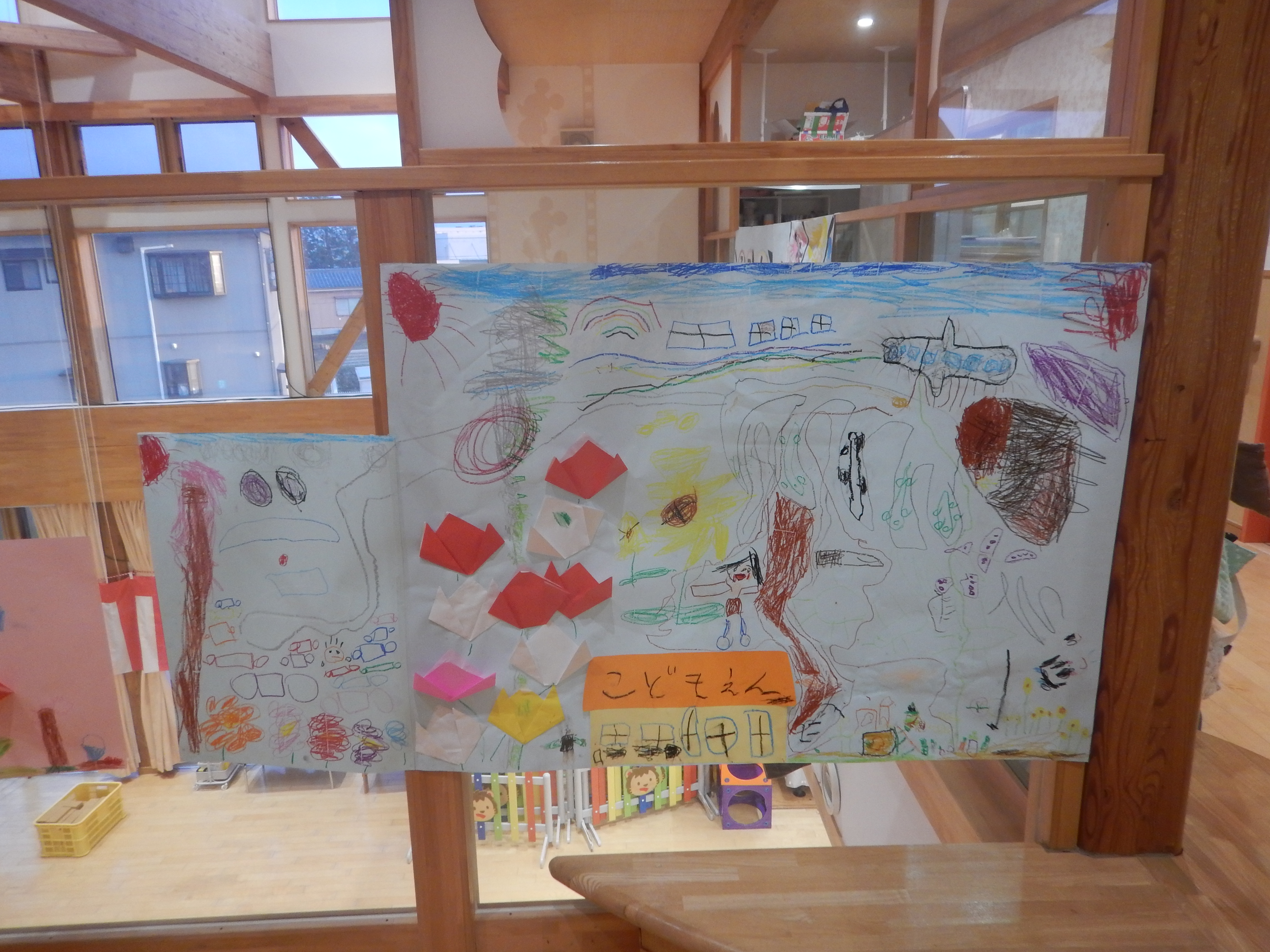 年中組さんがグループごとに大きな紙に絵を描きました。このはこども園の周りにあるものを描こう!となったそうです(*^-^*)