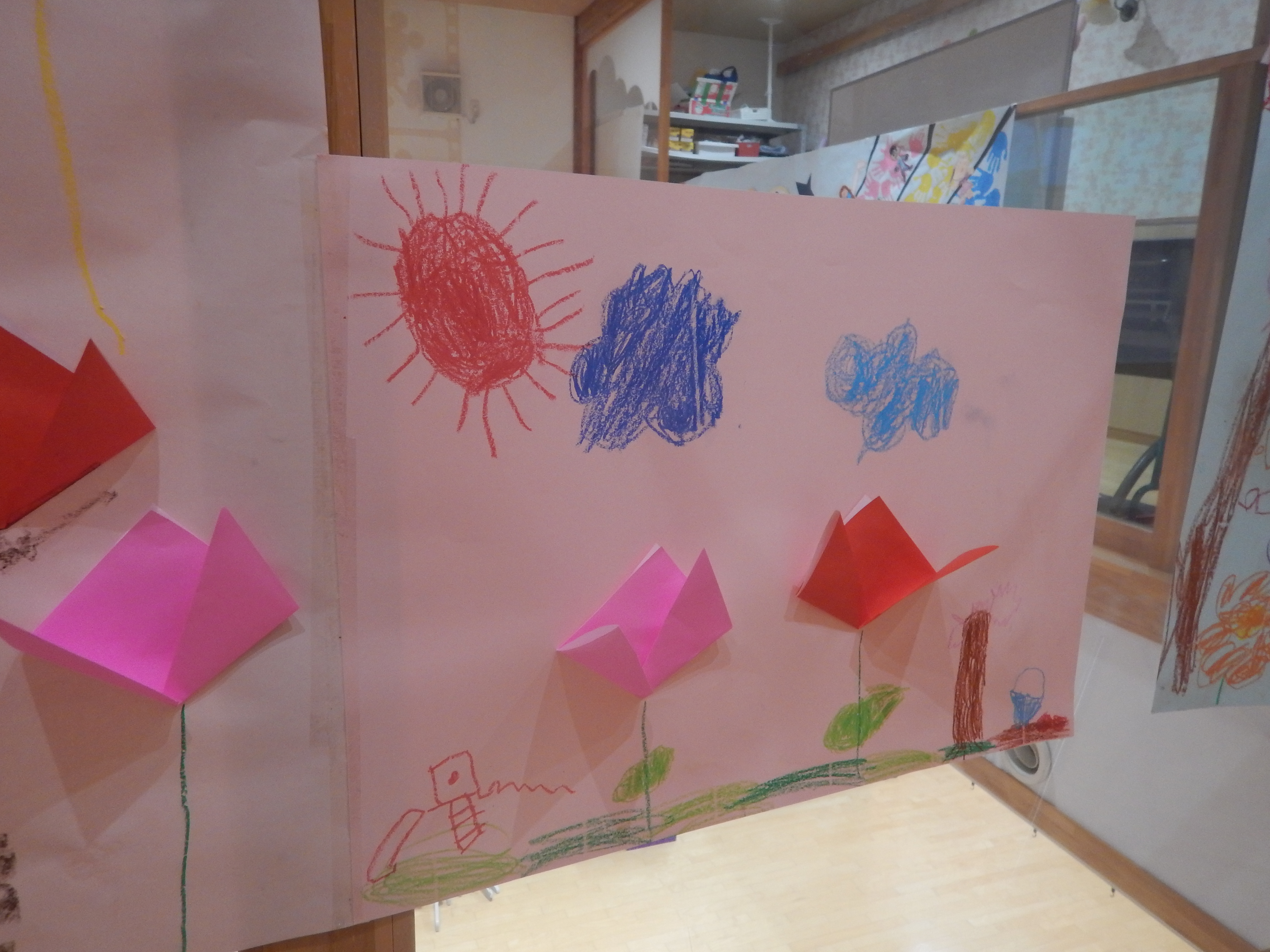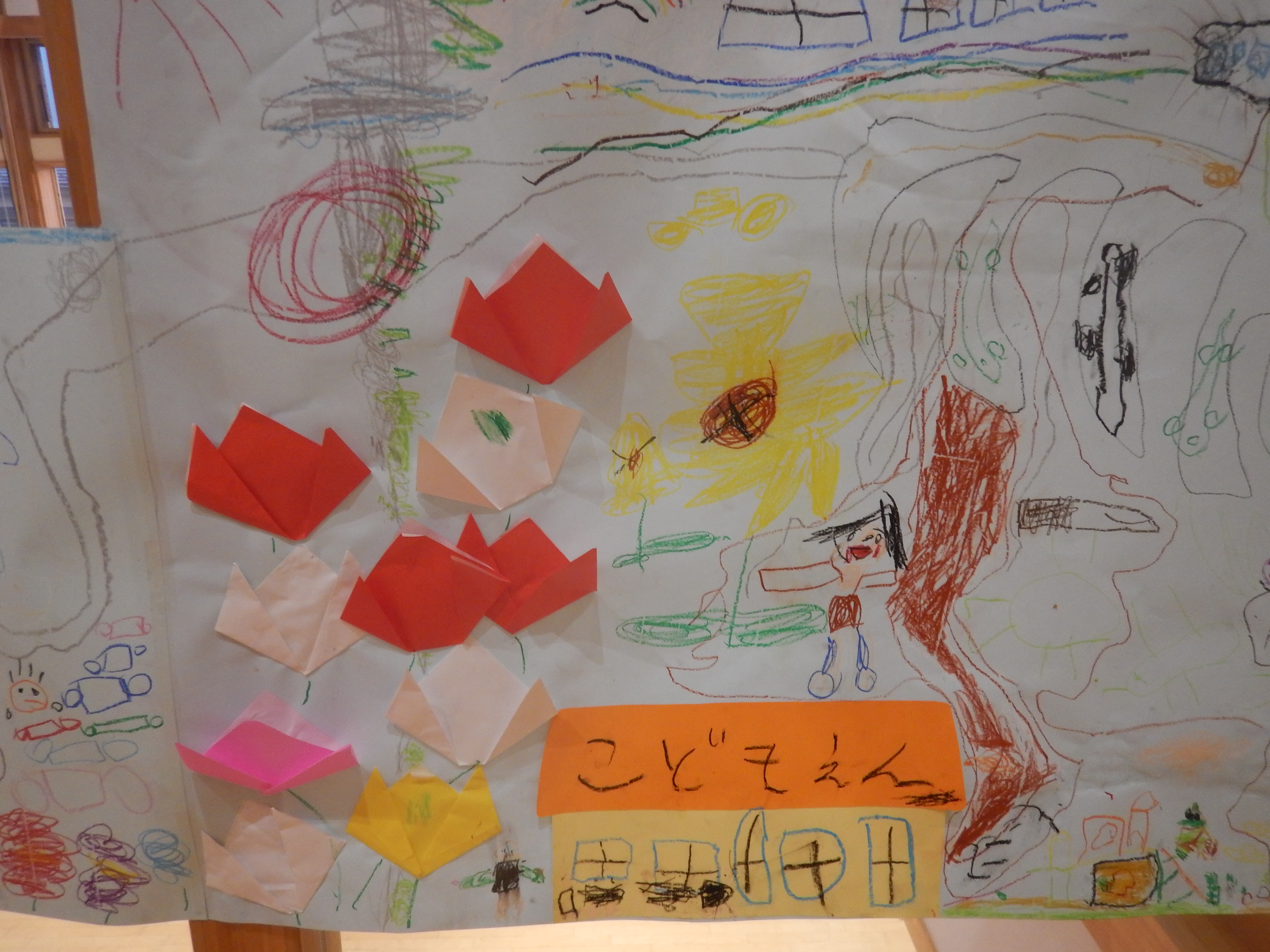 チューリップの折り紙は玄関前に年中組さんが昨年の秋に植えた球根で花が咲いている様子を表現していました。