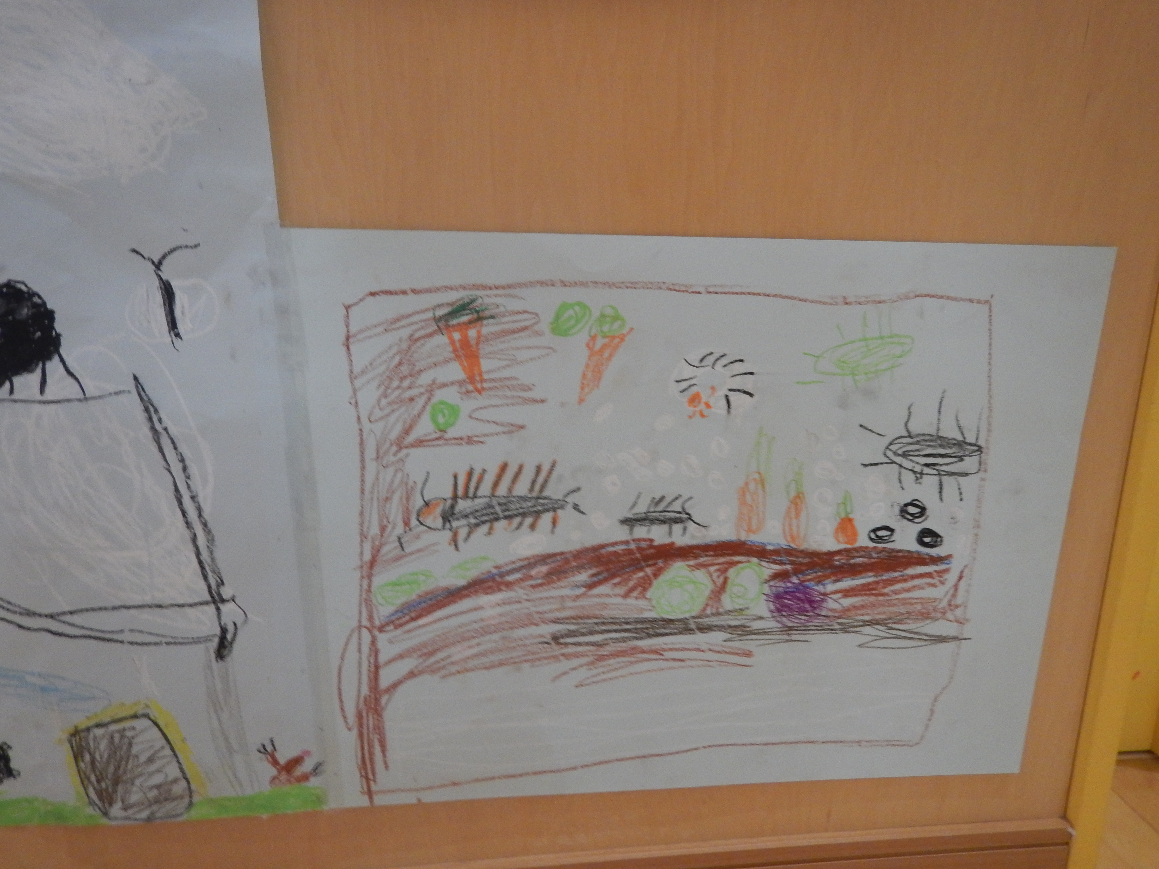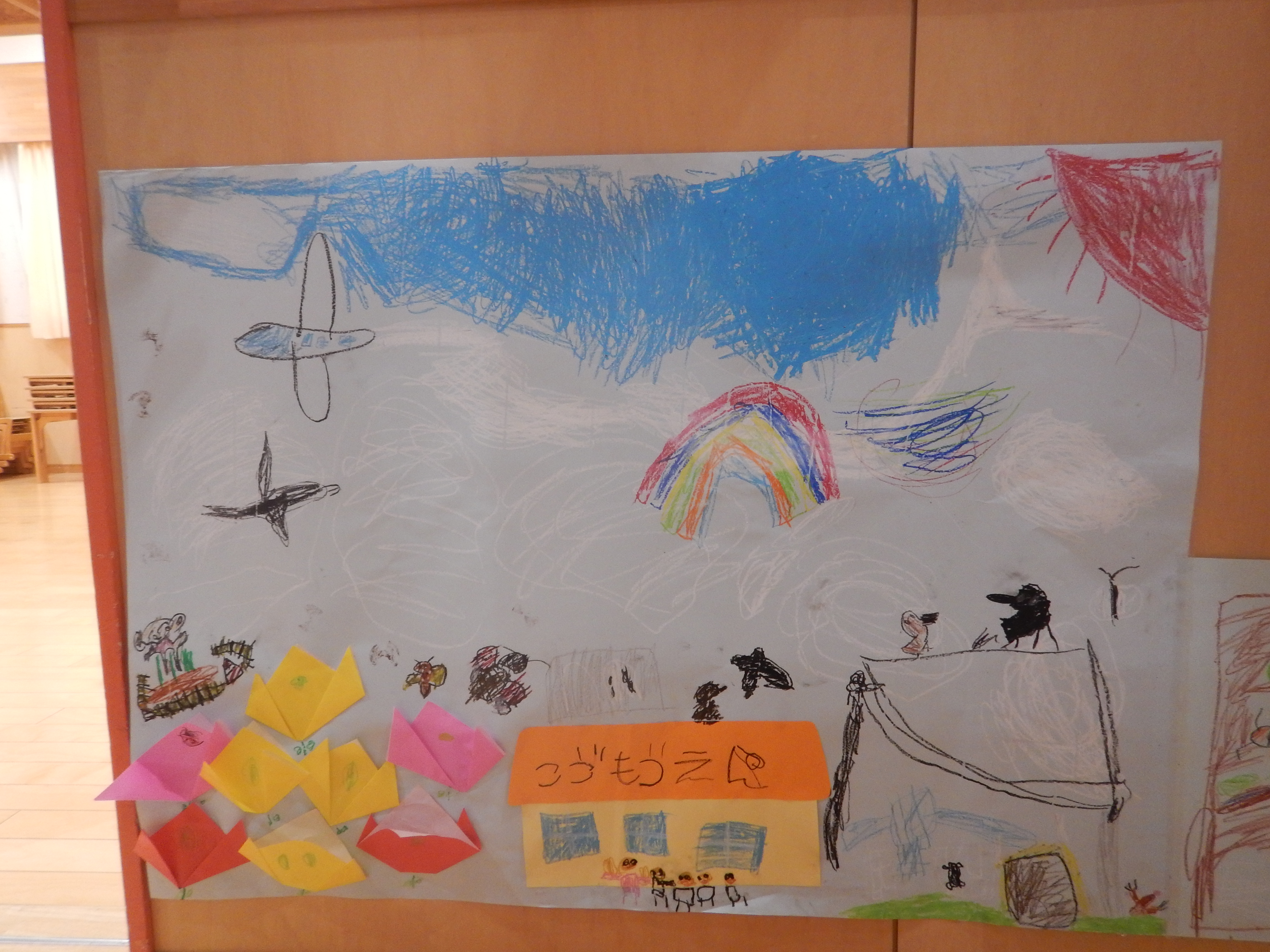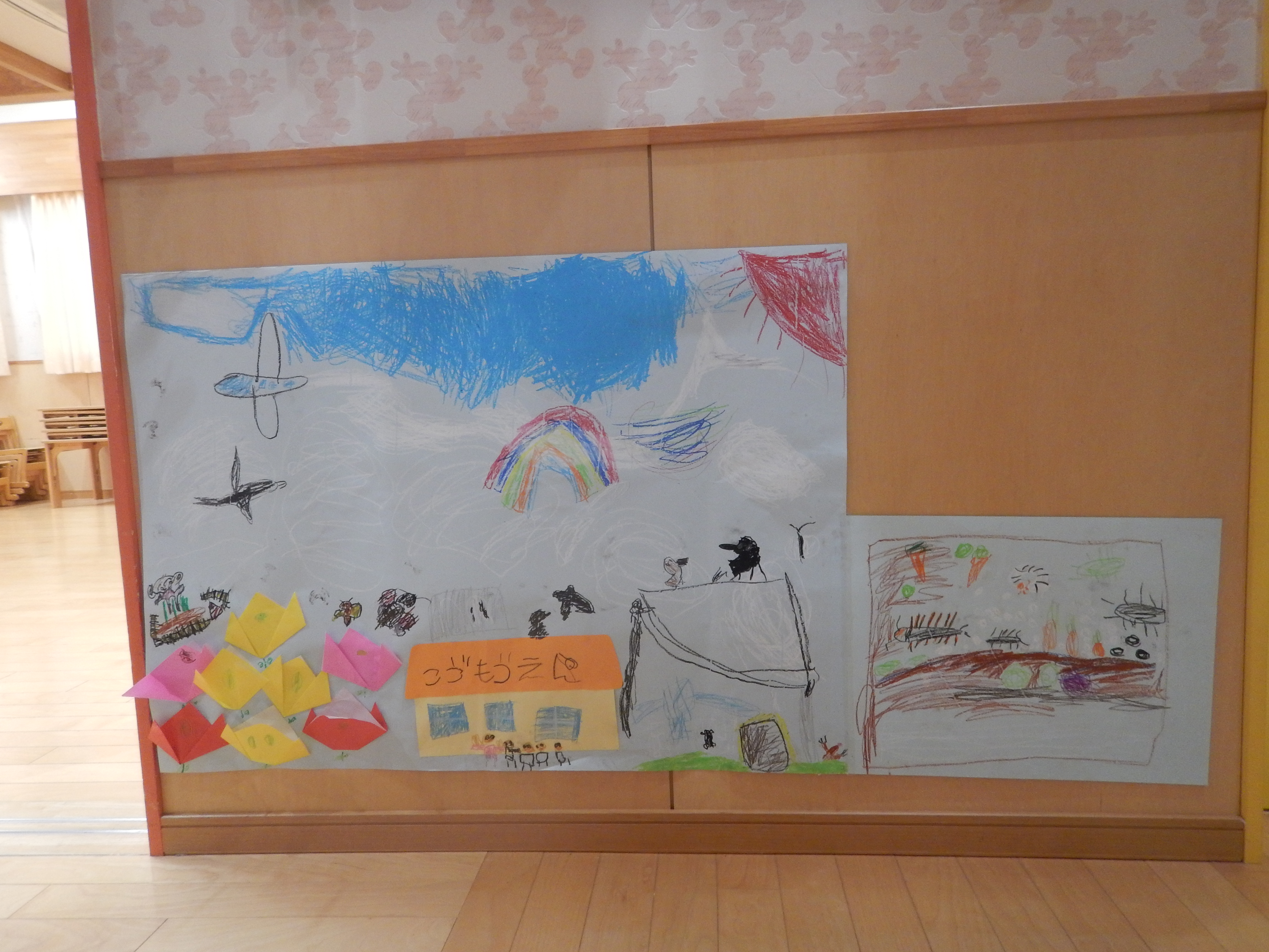 駐車場や畑、虫や鳥、空や太陽などこのはこども園から見える風景をたくさん描いてくれました。園舎のそばに園長先生の姿もあります。(*’▽’)