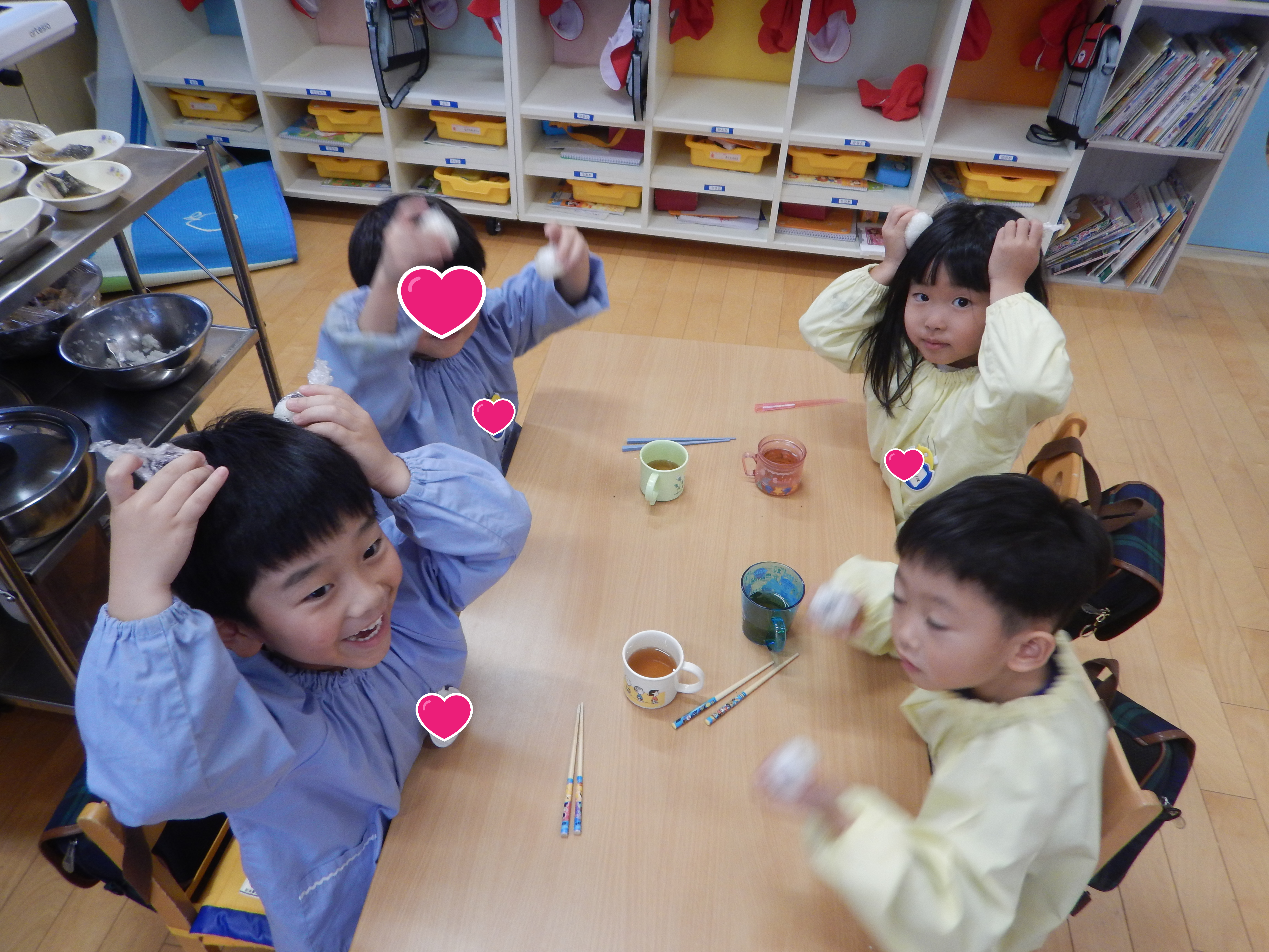 4歳児さんが、給食の時間に合わせておにぎり作りをしました。最初は園長先生が見本を見せました。かわいいおにぎりができて歓声があがり、子どもたちも楽しみながら体験していました。