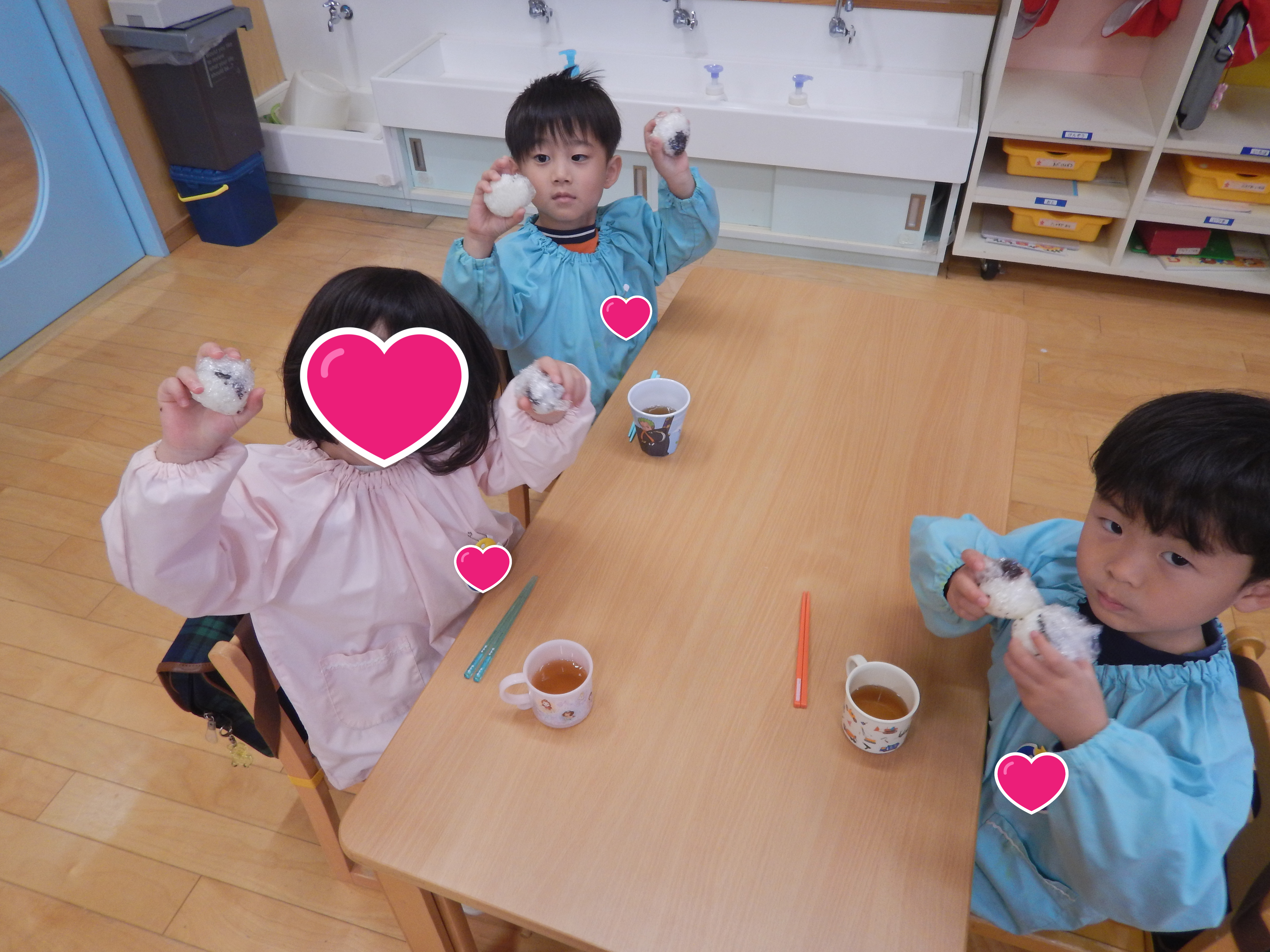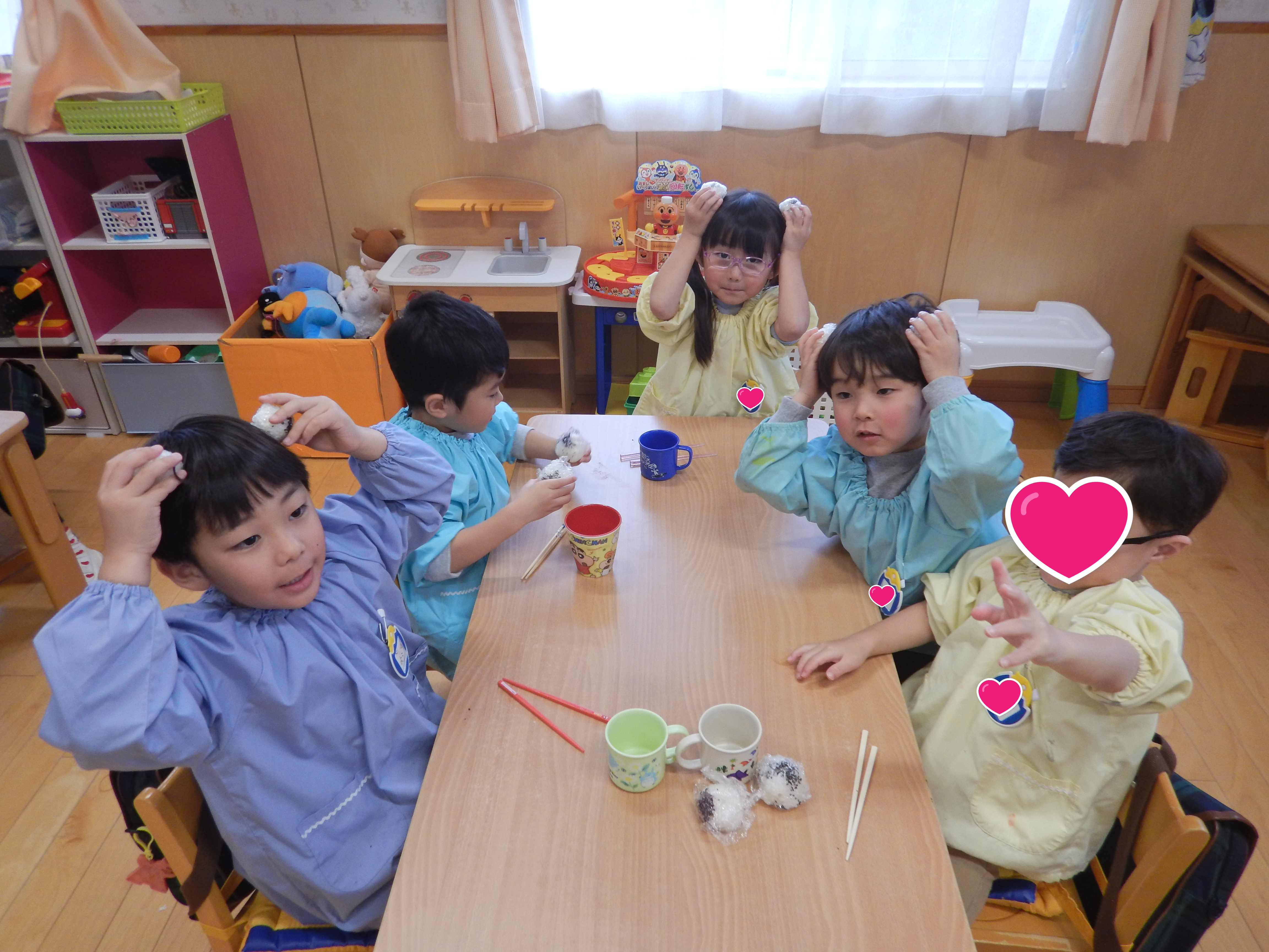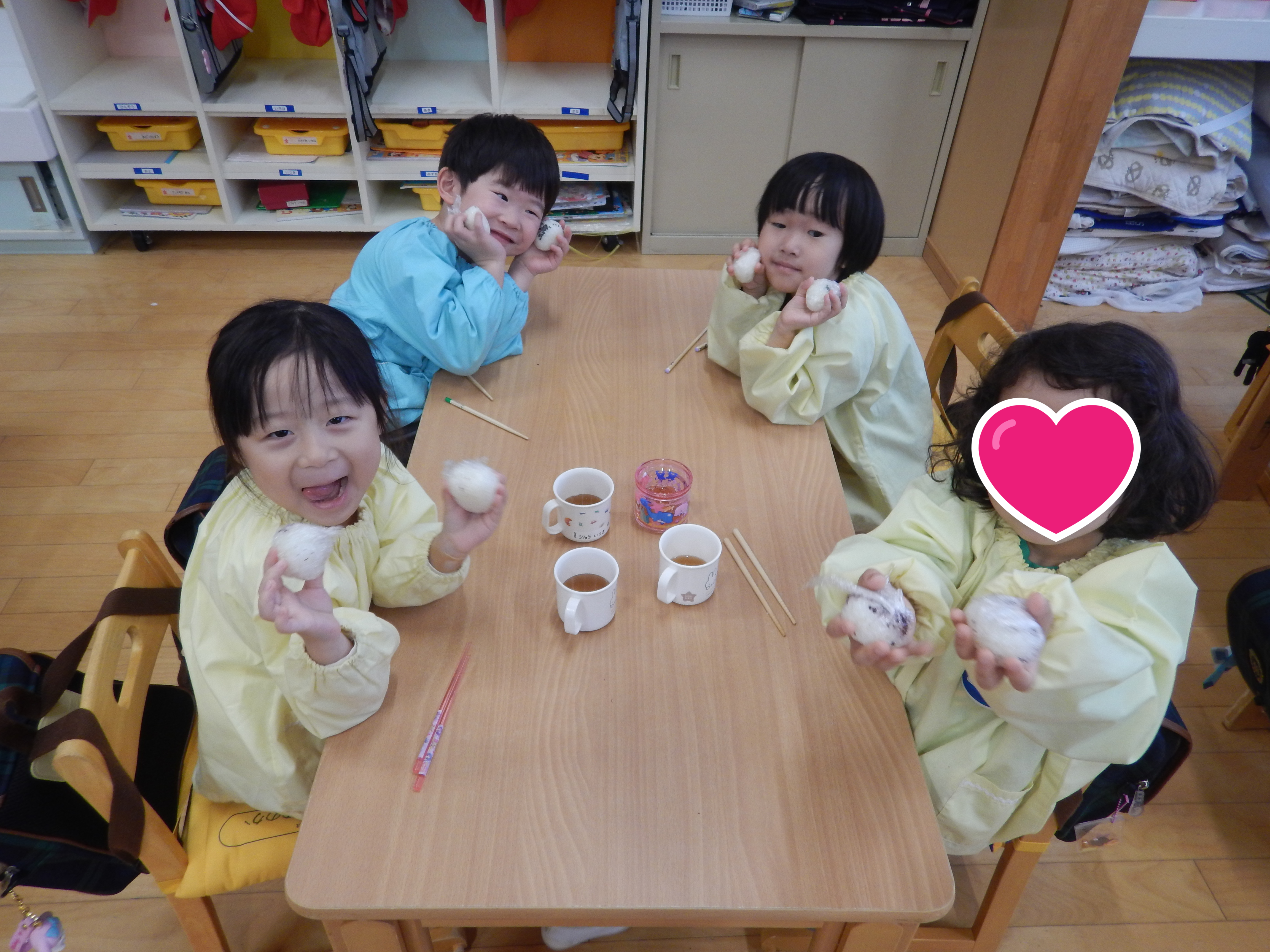 4歳児さんが、給食の時間に合わせておにぎり作りをしました。最初は園長先生が見本を見せました。かわいいおにぎりができて歓声があがり、子どもたちも楽しみながら体験していました。
