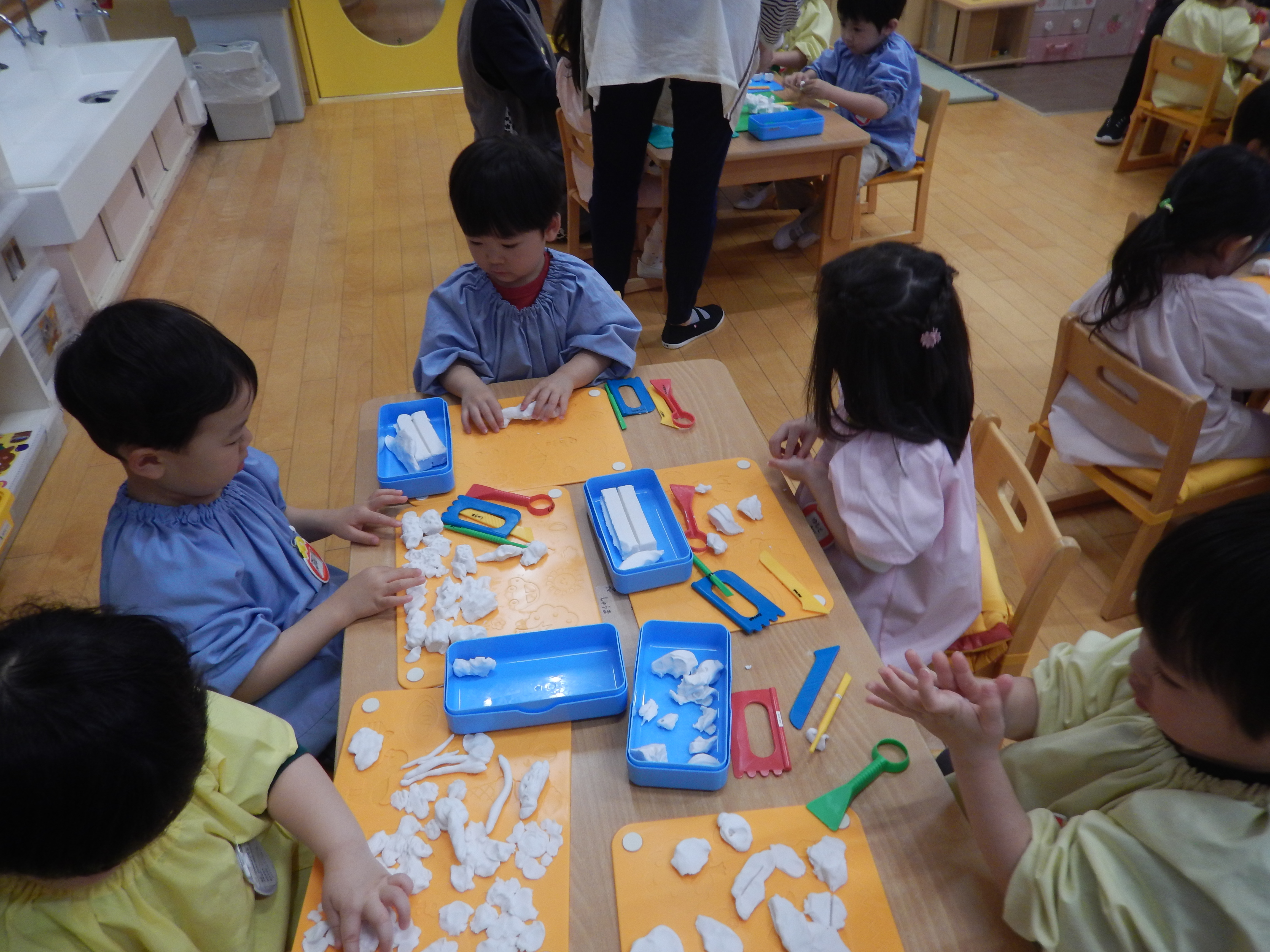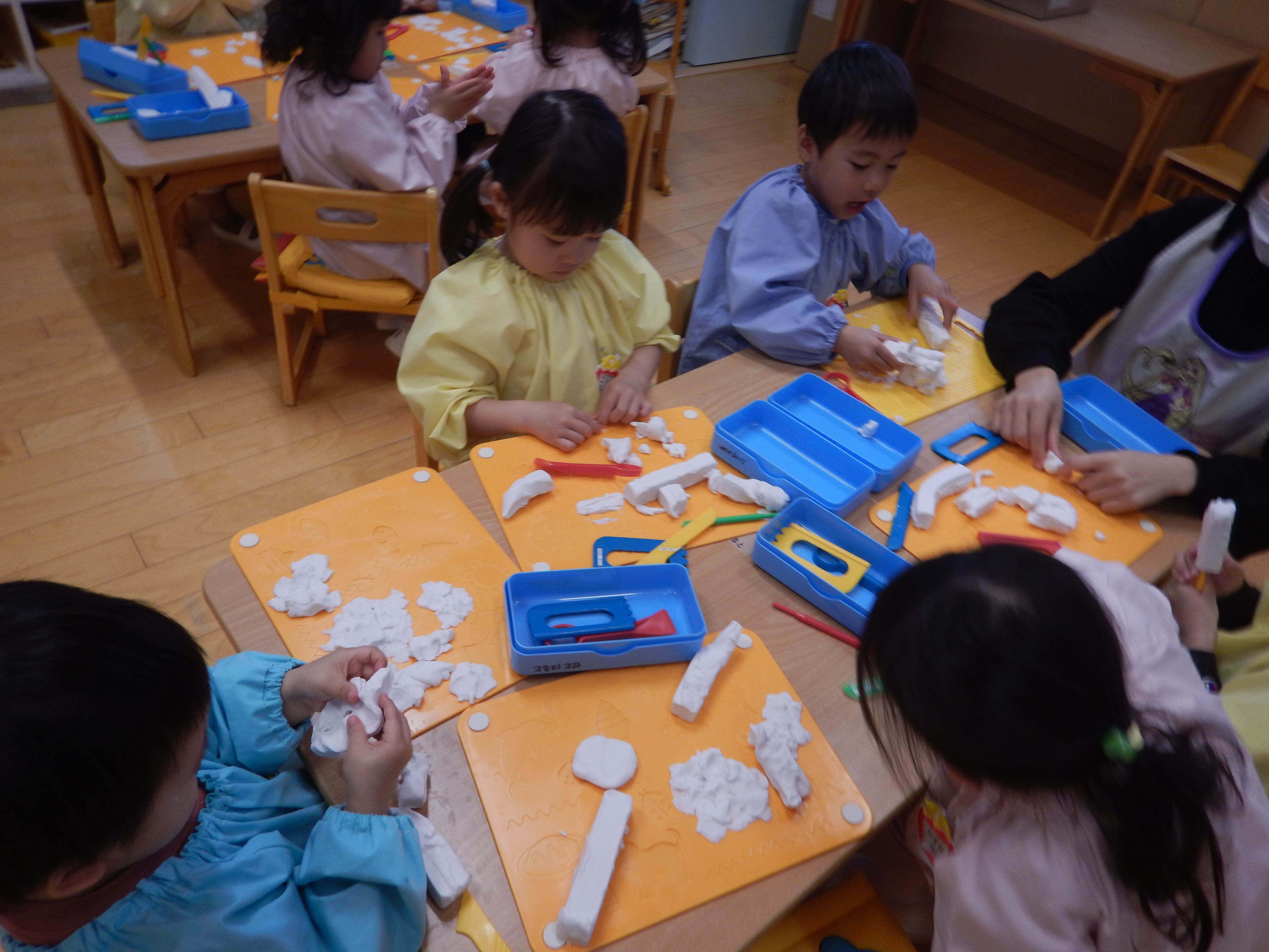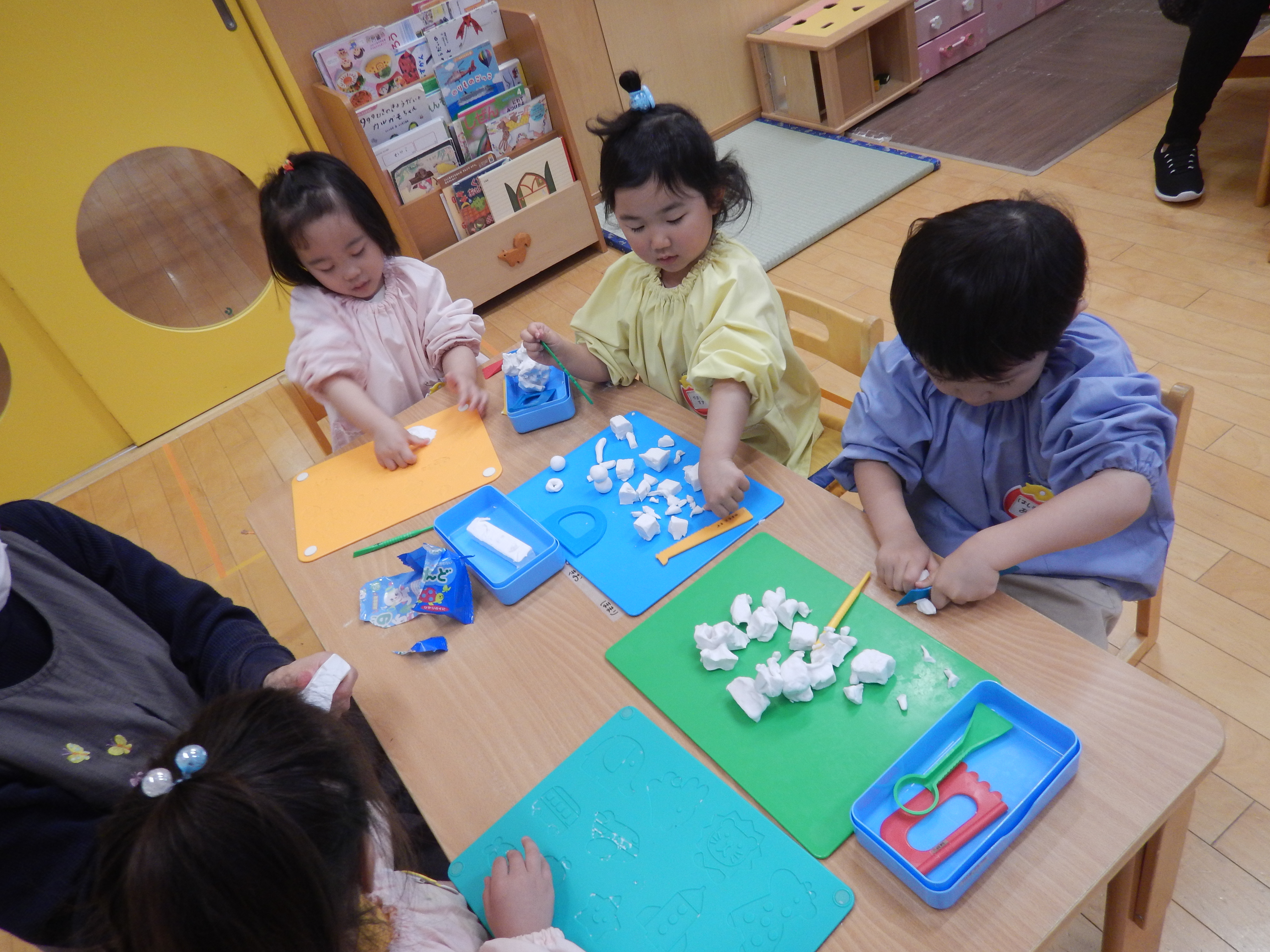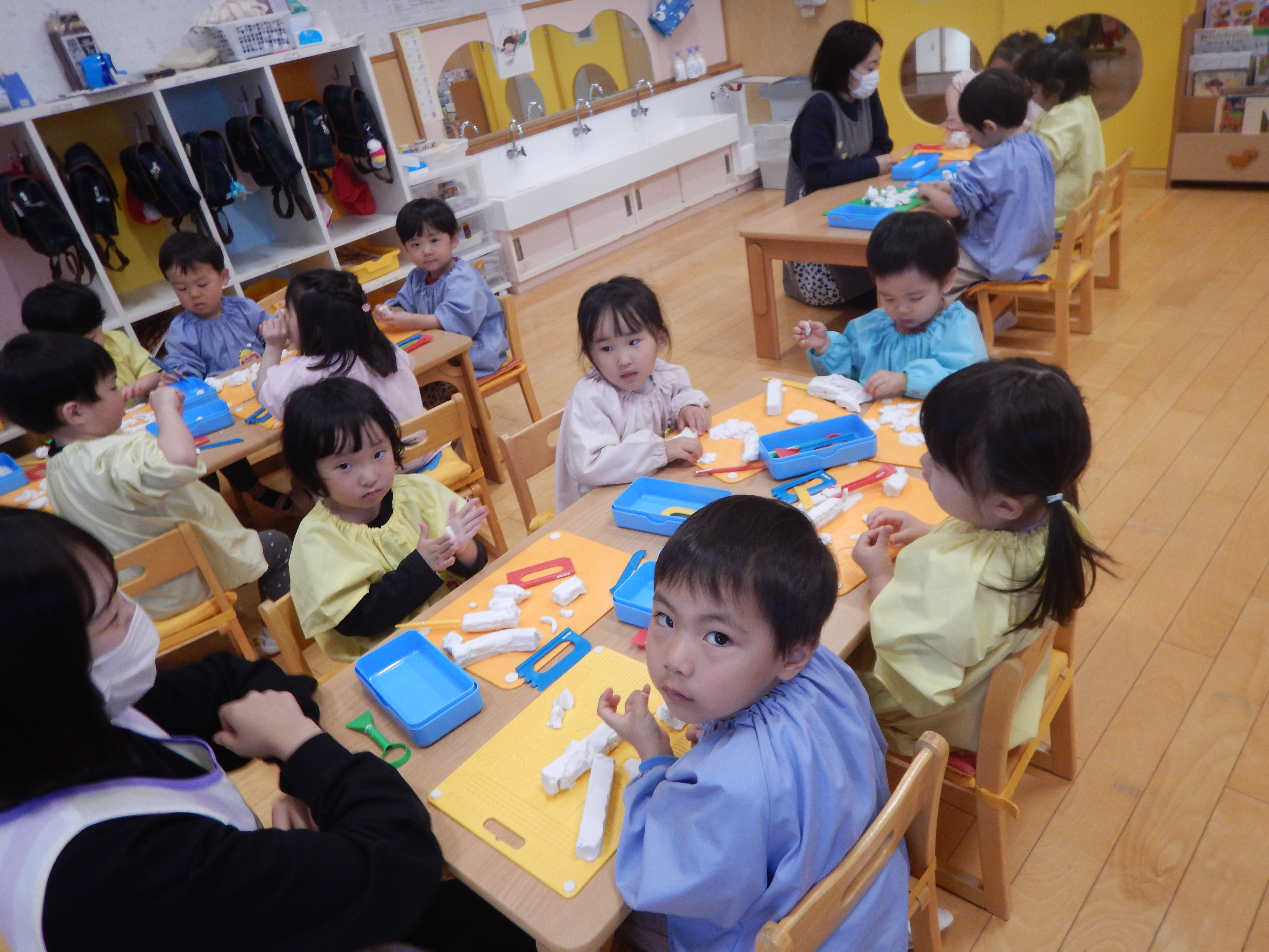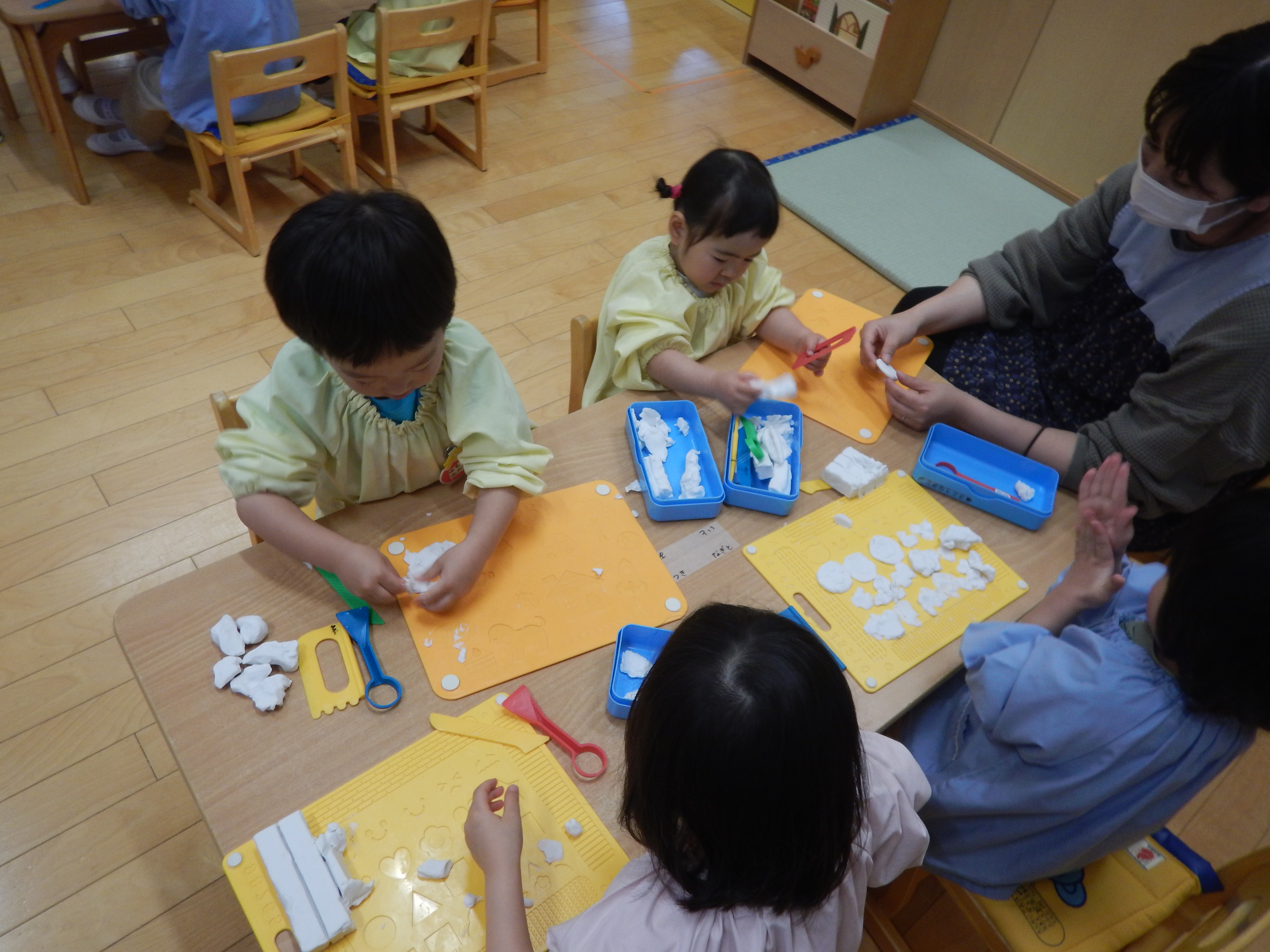 今日は、保育室に潜入してきました。3歳児クラスは初めての粘土遊びをしていました。粘土板の型に粘土を押し当てたり、粘土の棒を使って「マシュマロ~!キャンディー!」と見せてくれる子、太陽を表現したりと思い思いに好きなものを作っていました。みんな集中していましたよ(*^-^*)