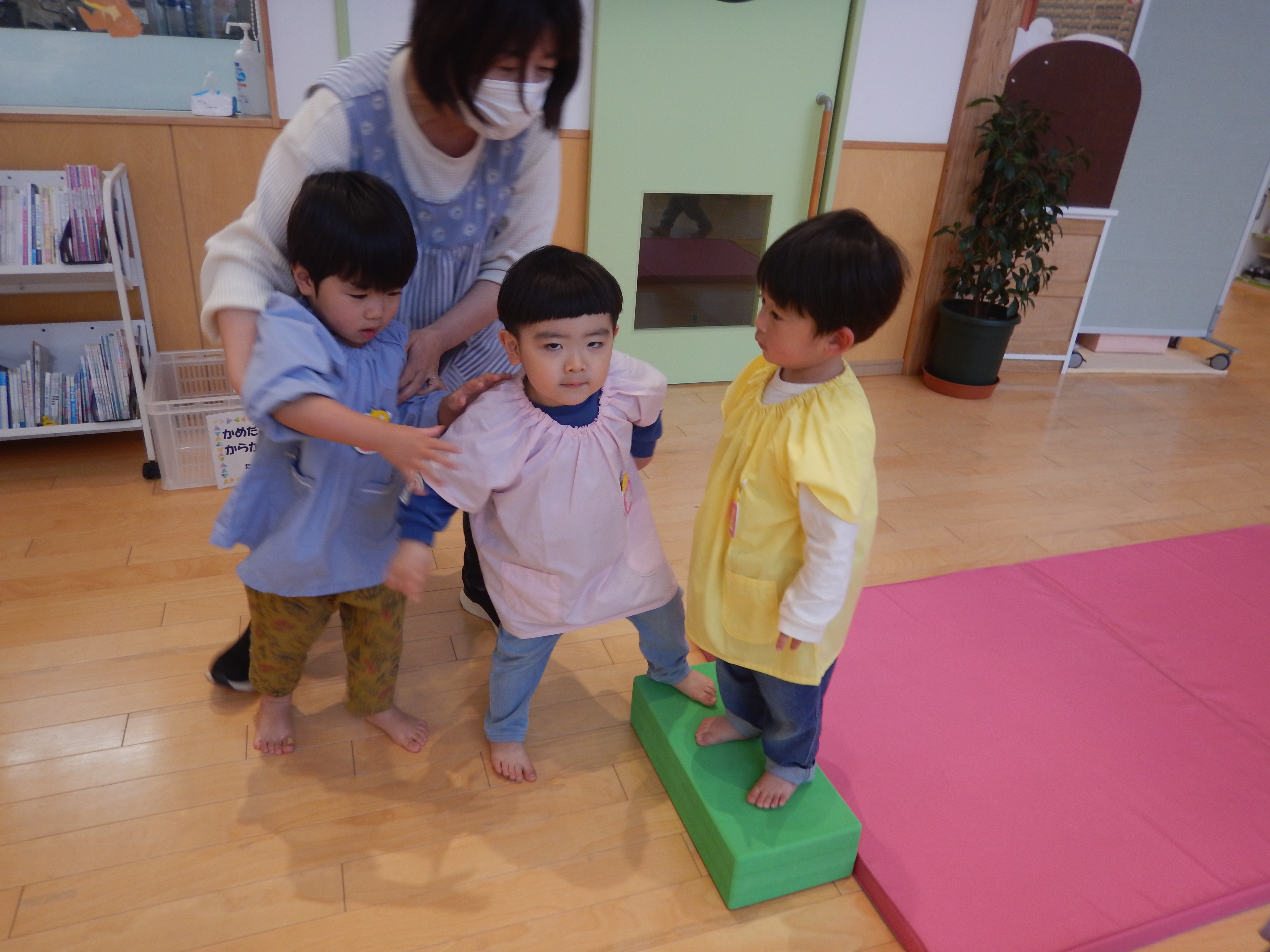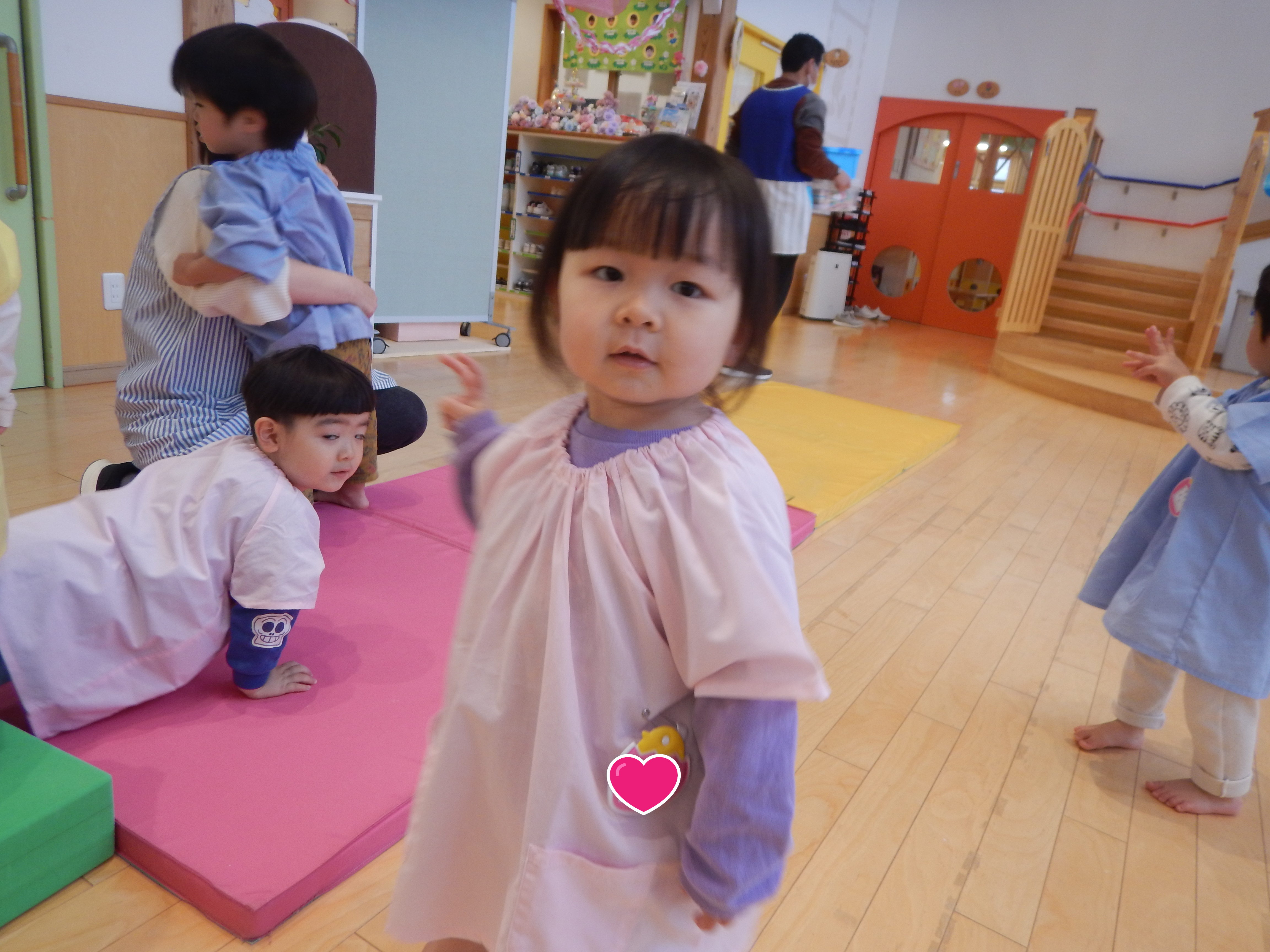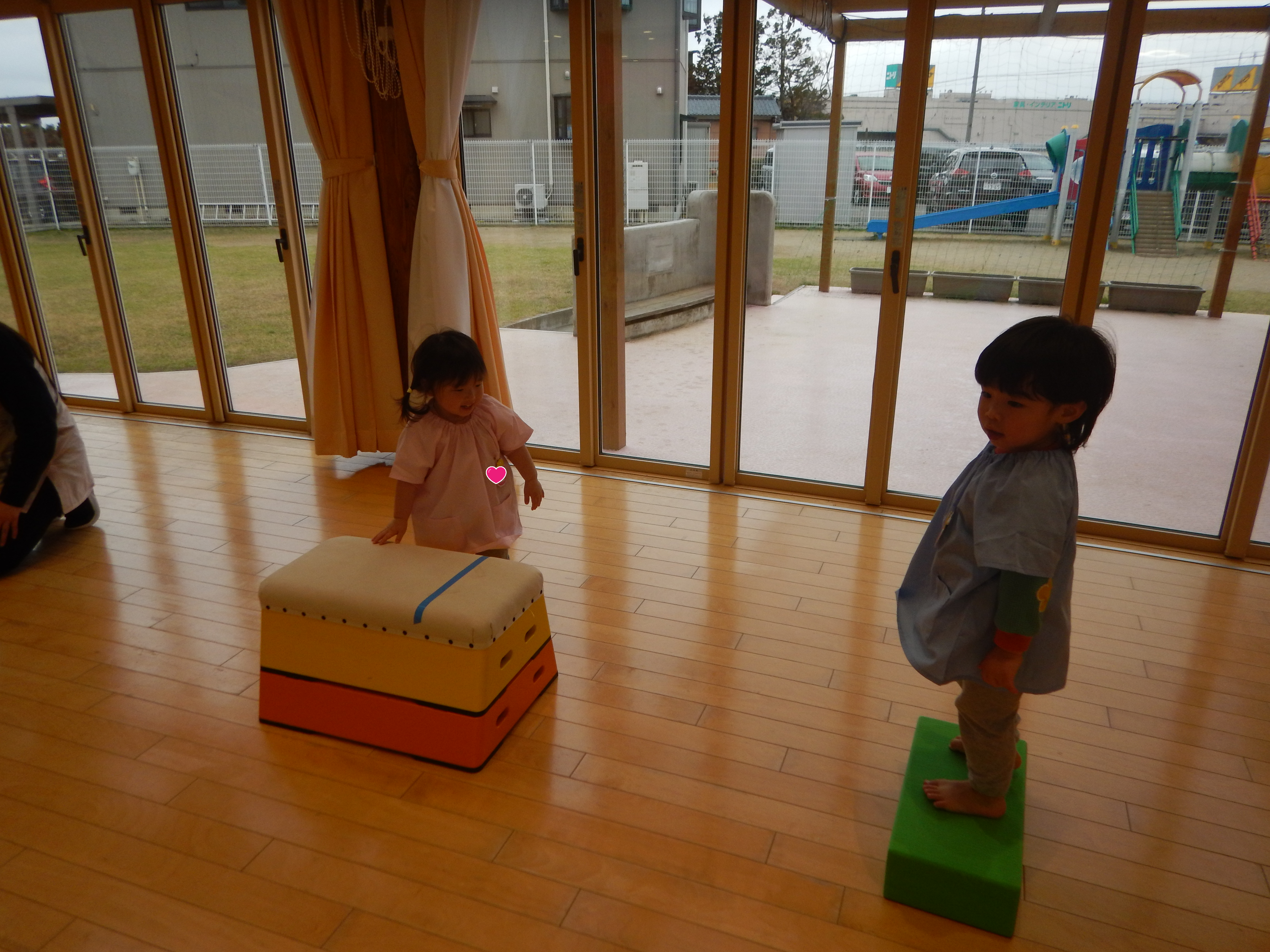 遊戯室では、2歳児さんが運動遊びをしていました。マットにごろごろと転がったり、跳び箱からジャンプしたり楽しそうに遊んでいました。