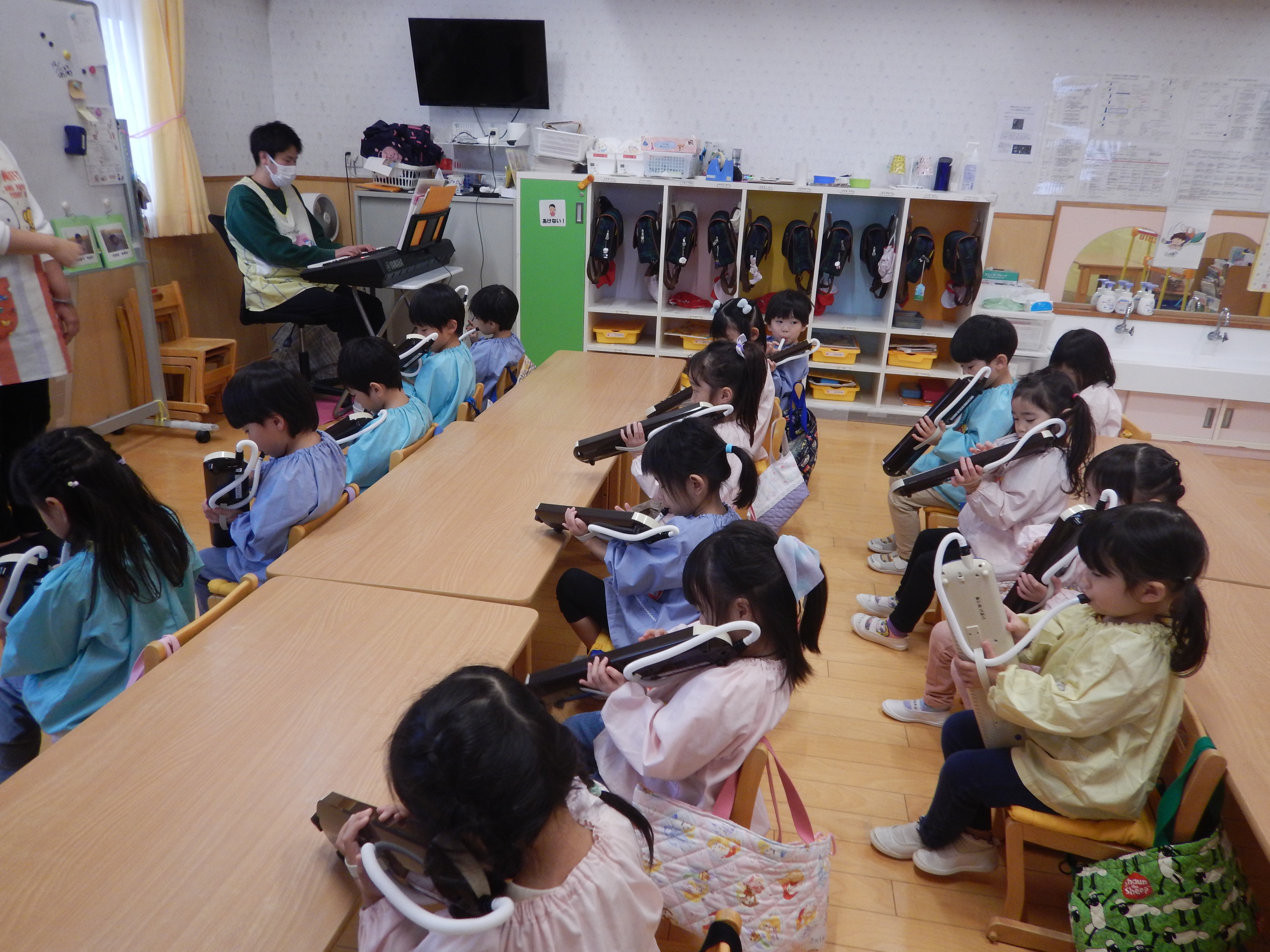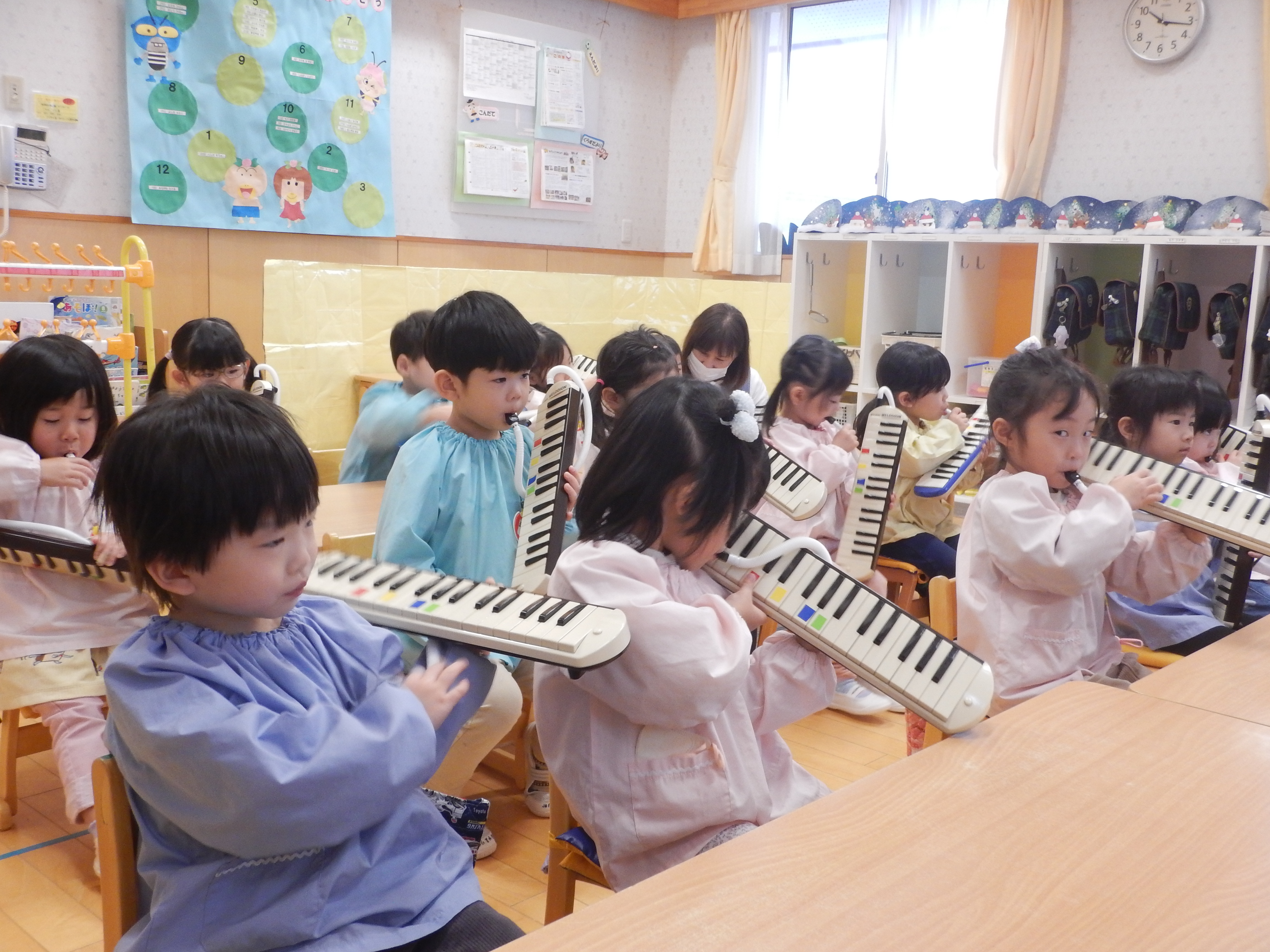 3歳児さんは、メロディオンの練習ということで、聞きに来てほしいとリクエストがありお邪魔しました。この日は、全員が登園しメロディオンも久しぶりだったそう…。いつのまにこんなに上手になったの??と思うくらいの演奏👏あんまり上手で思わずアンコールを2回もしてしましました。集中を途切れることなく一生懸命に弾いてくれました(*’▽’)