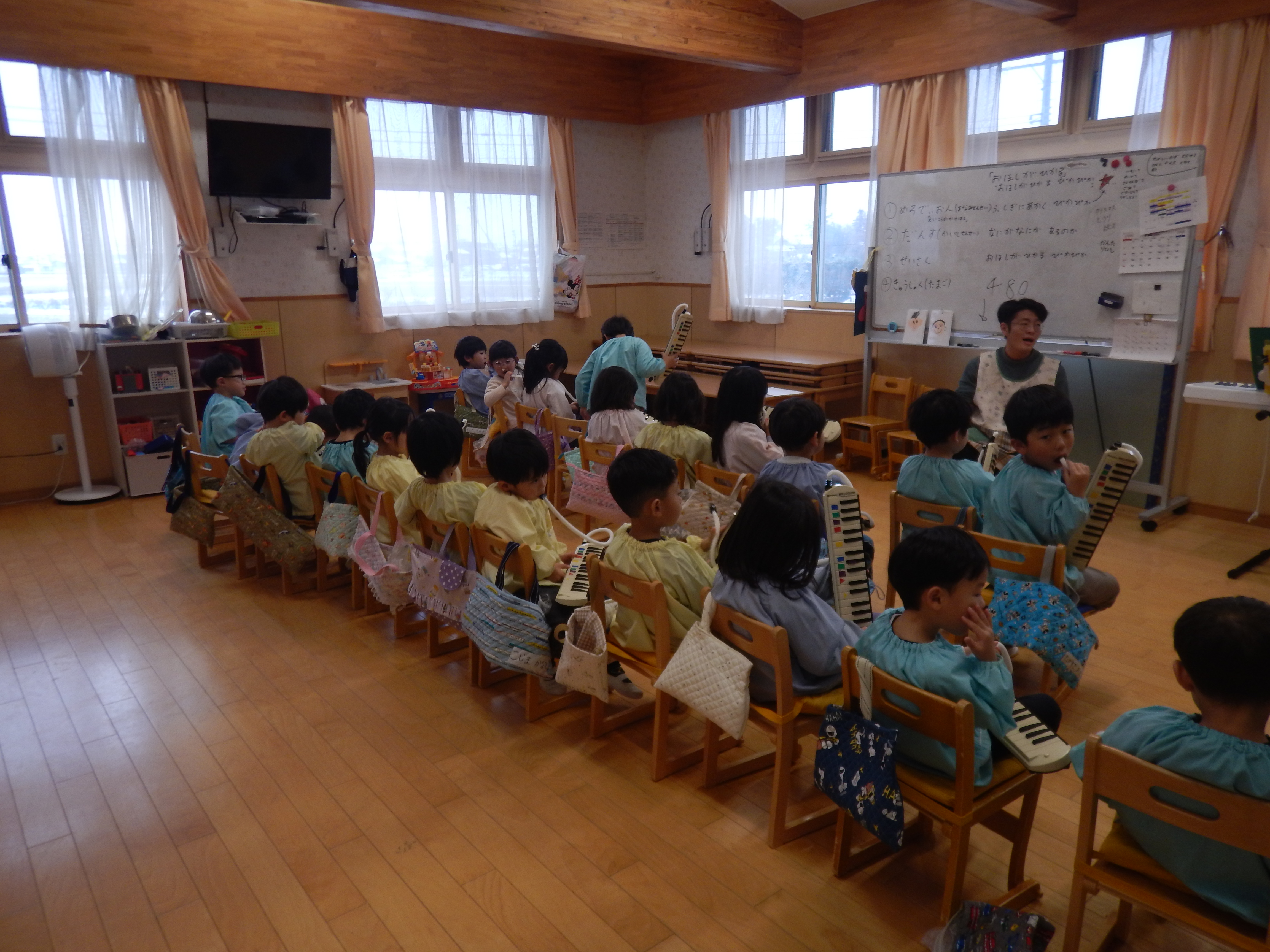 4歳児さんもメロディオン練習で5歳児さんと合同の曲を弾いていました。先生の指示を聞きながら頑張っていました。