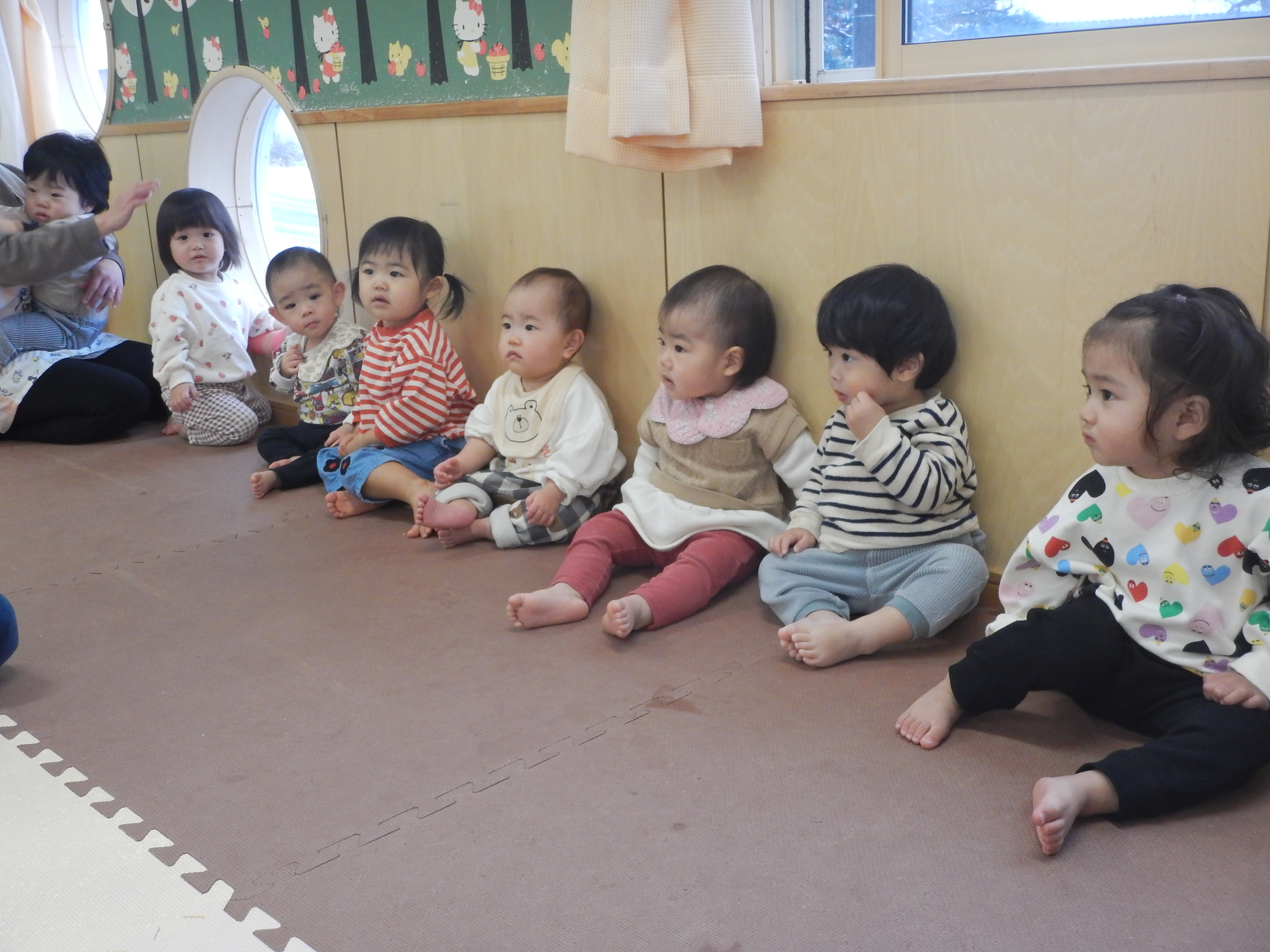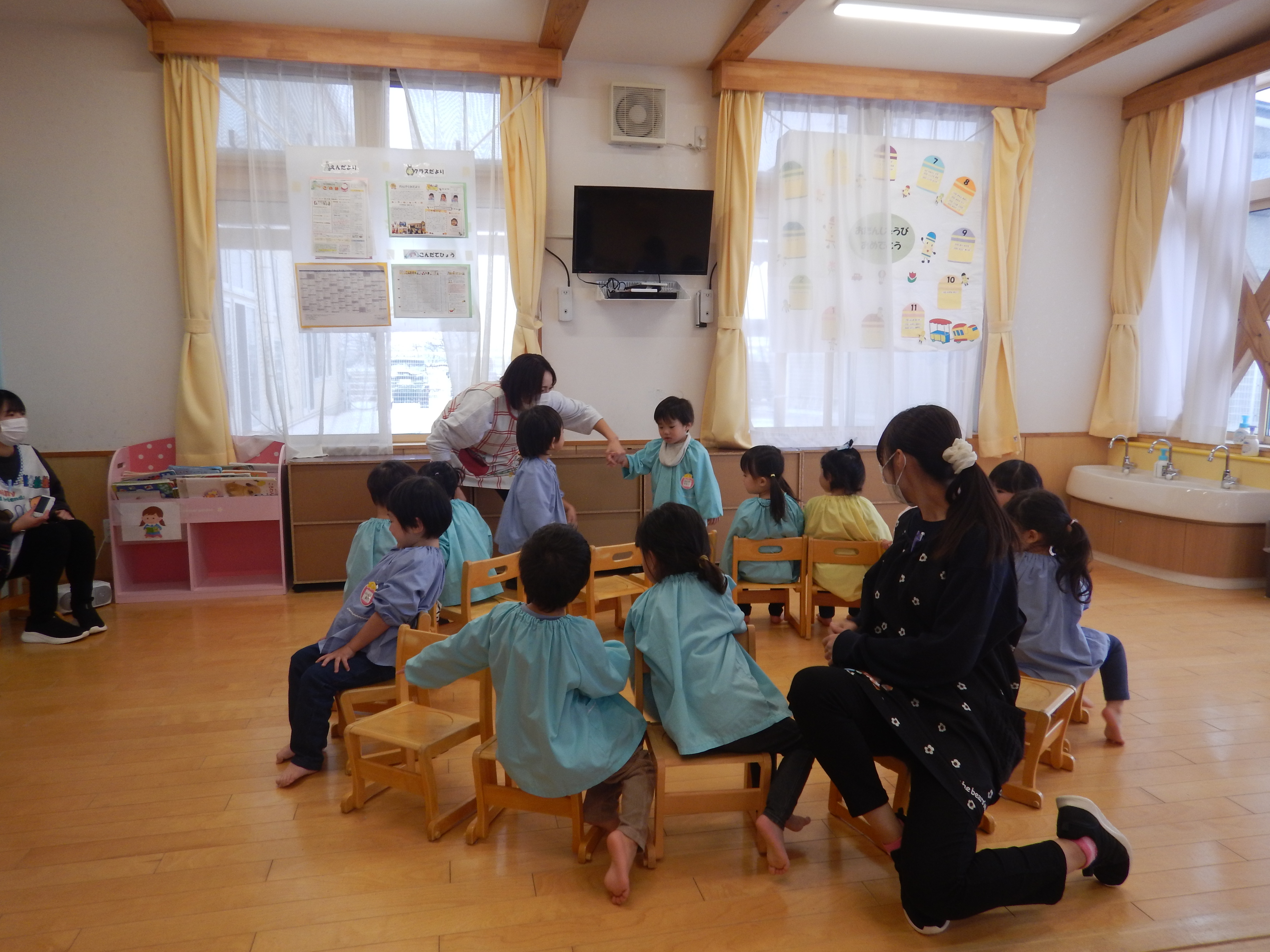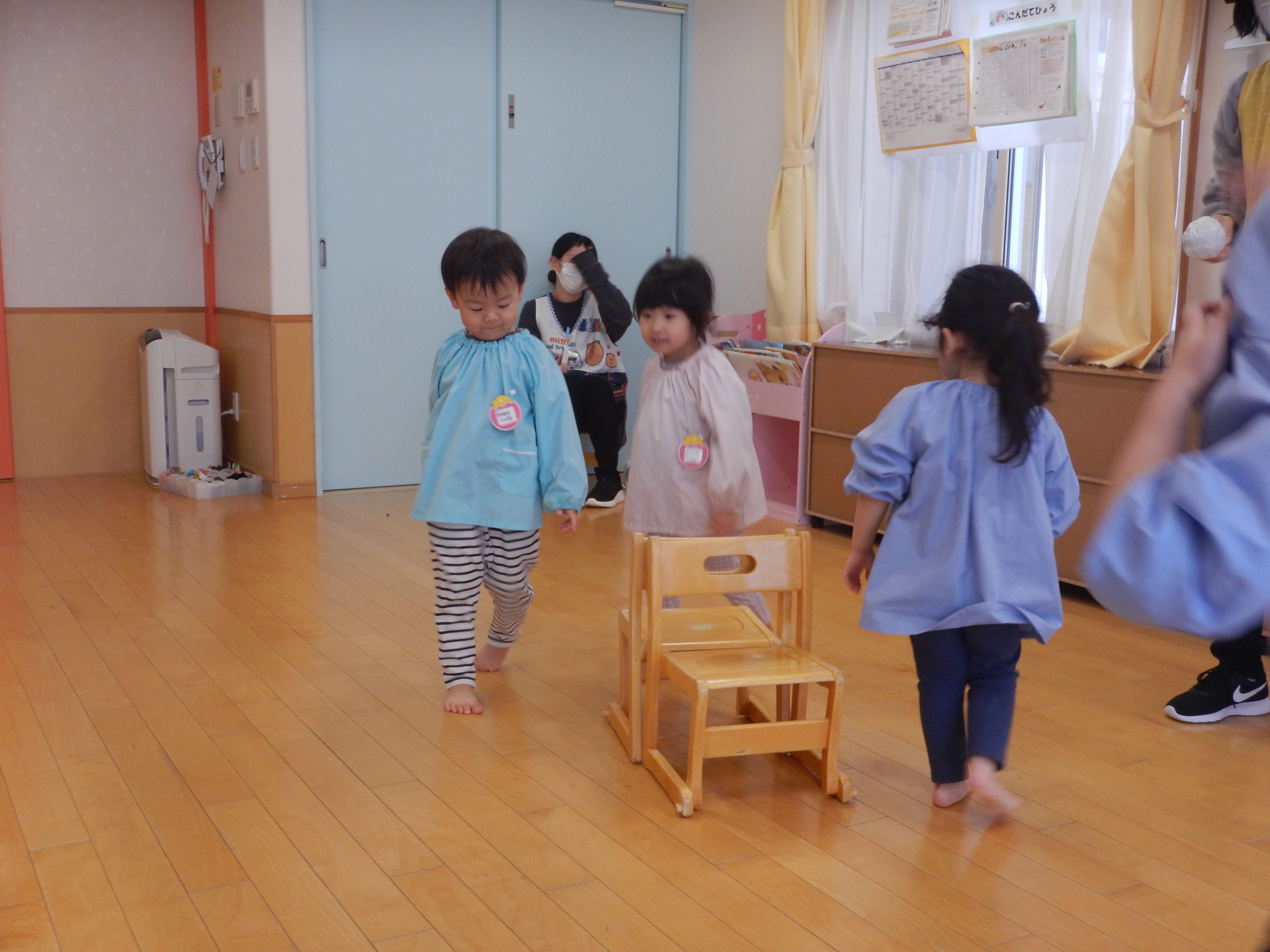 2歳児さんは、椅子取りゲーム、1歳児さんは自由遊び、0歳児さんは絵本の読み聞かせでした。
