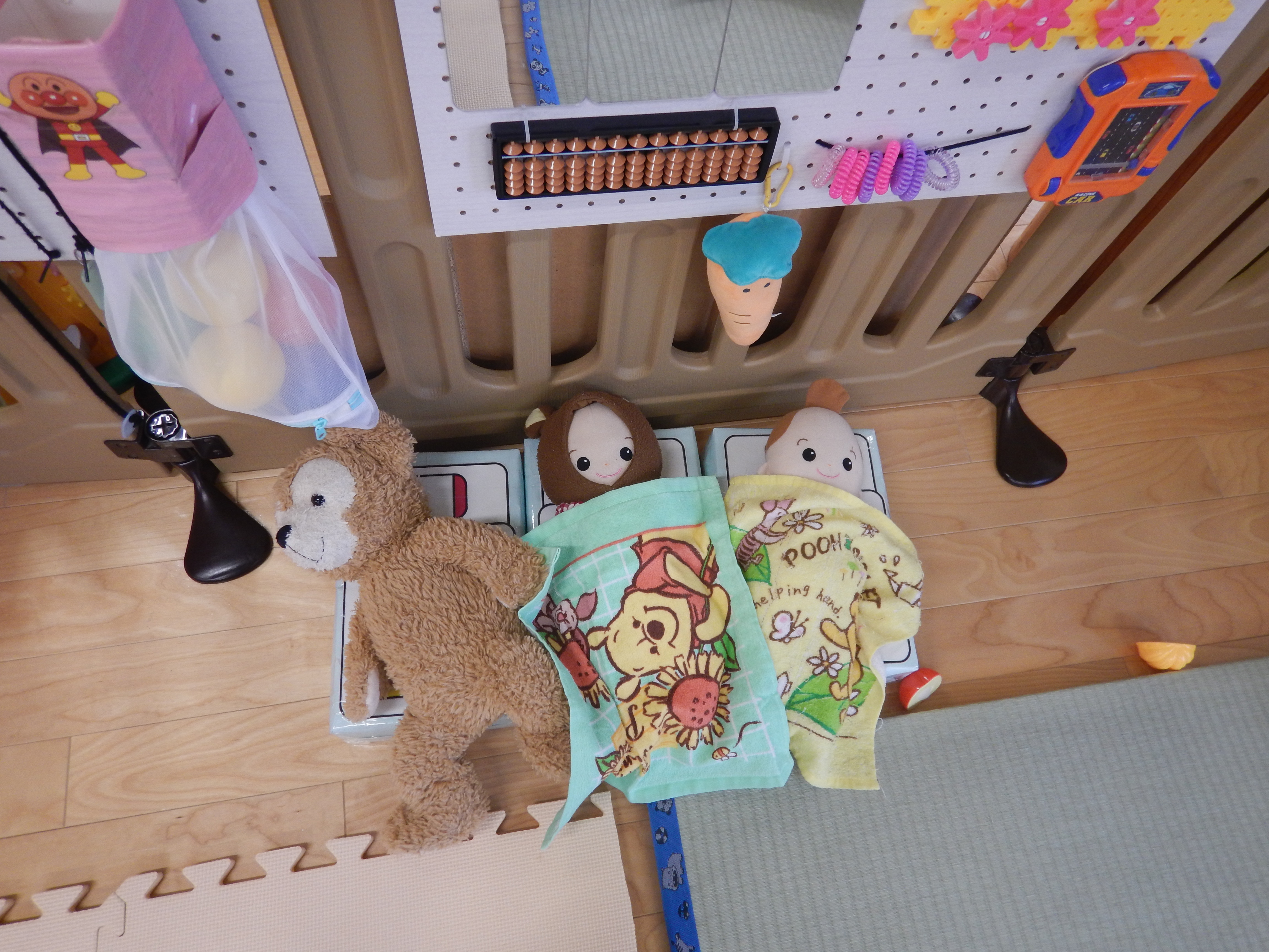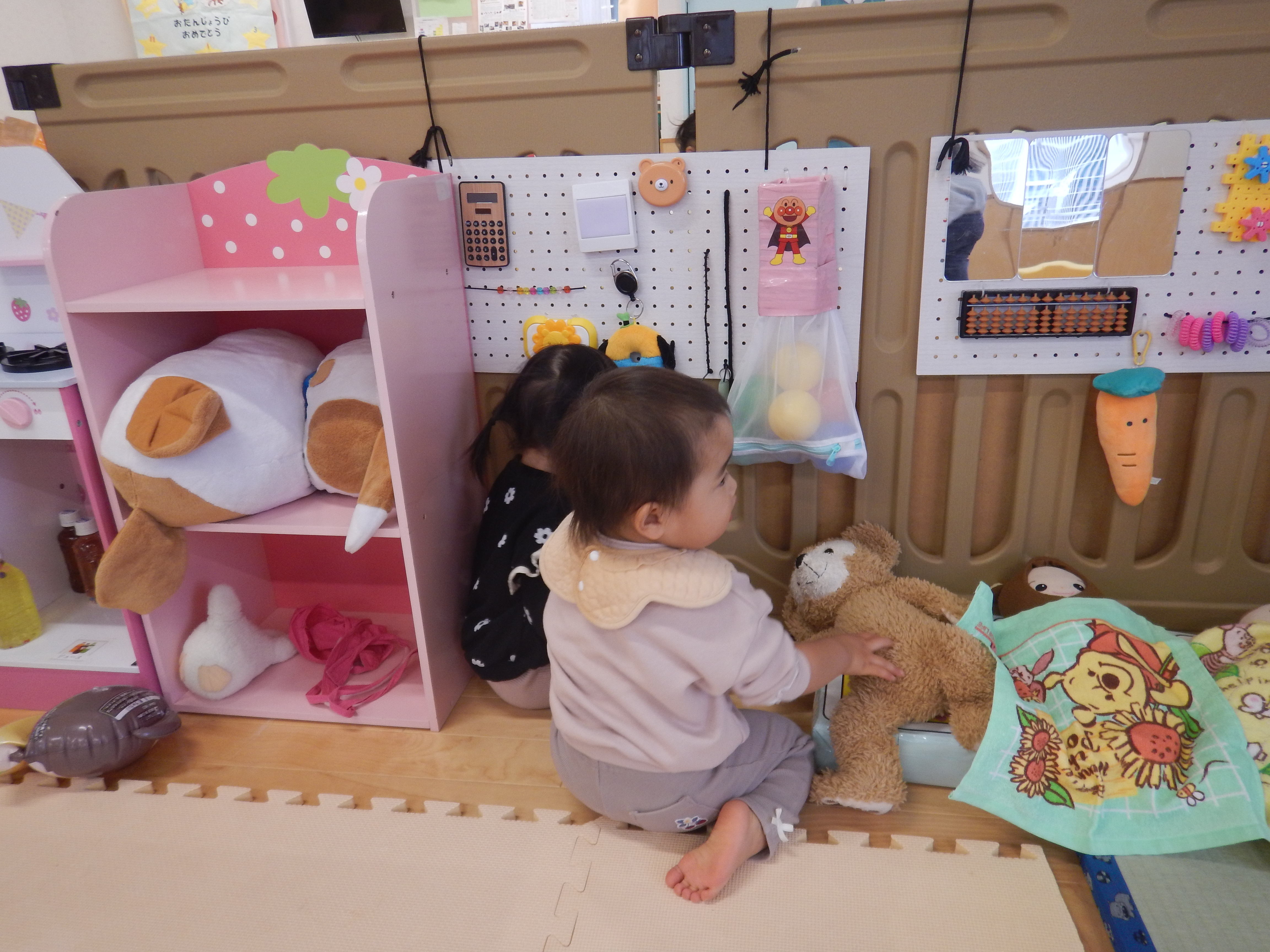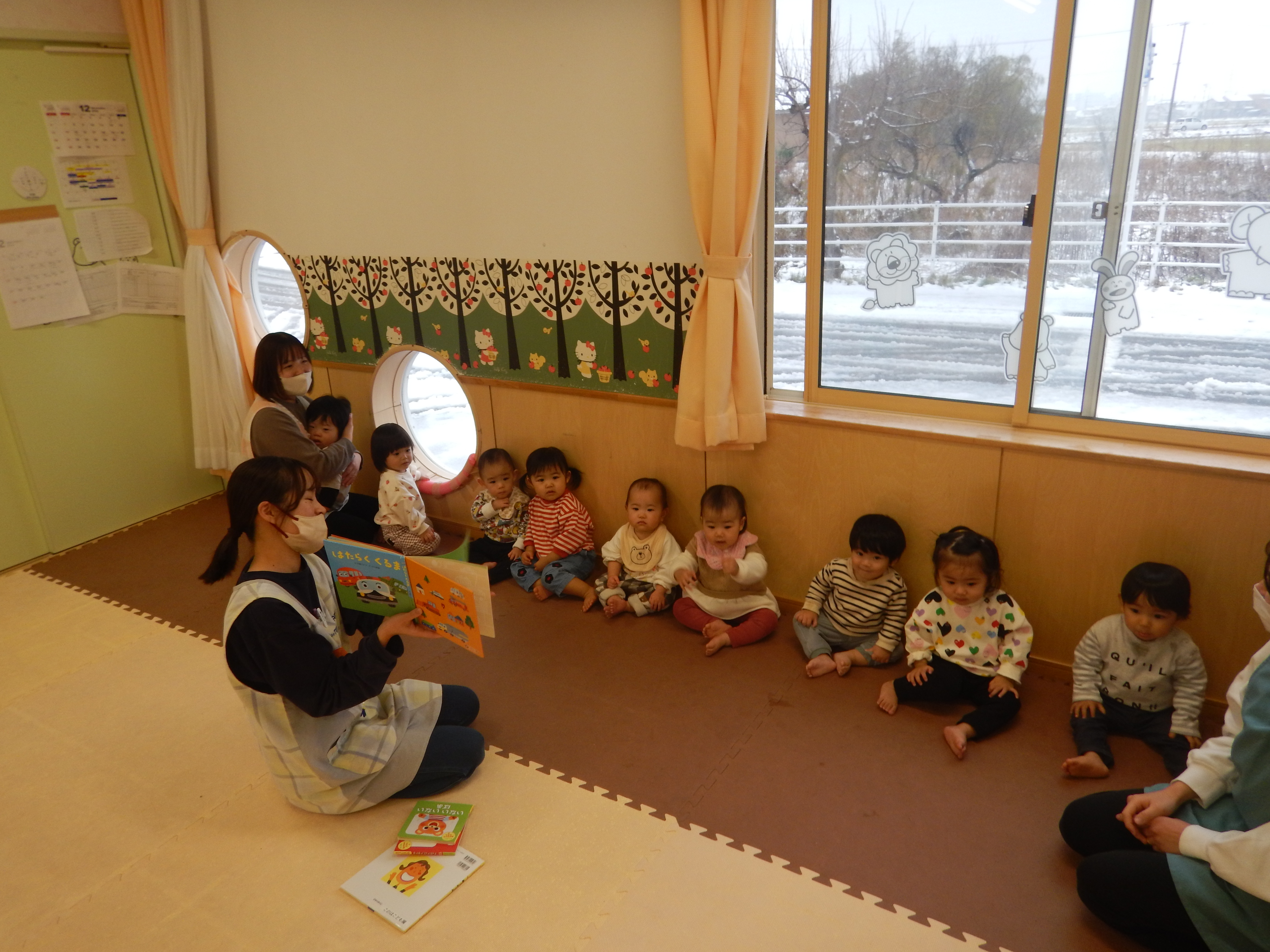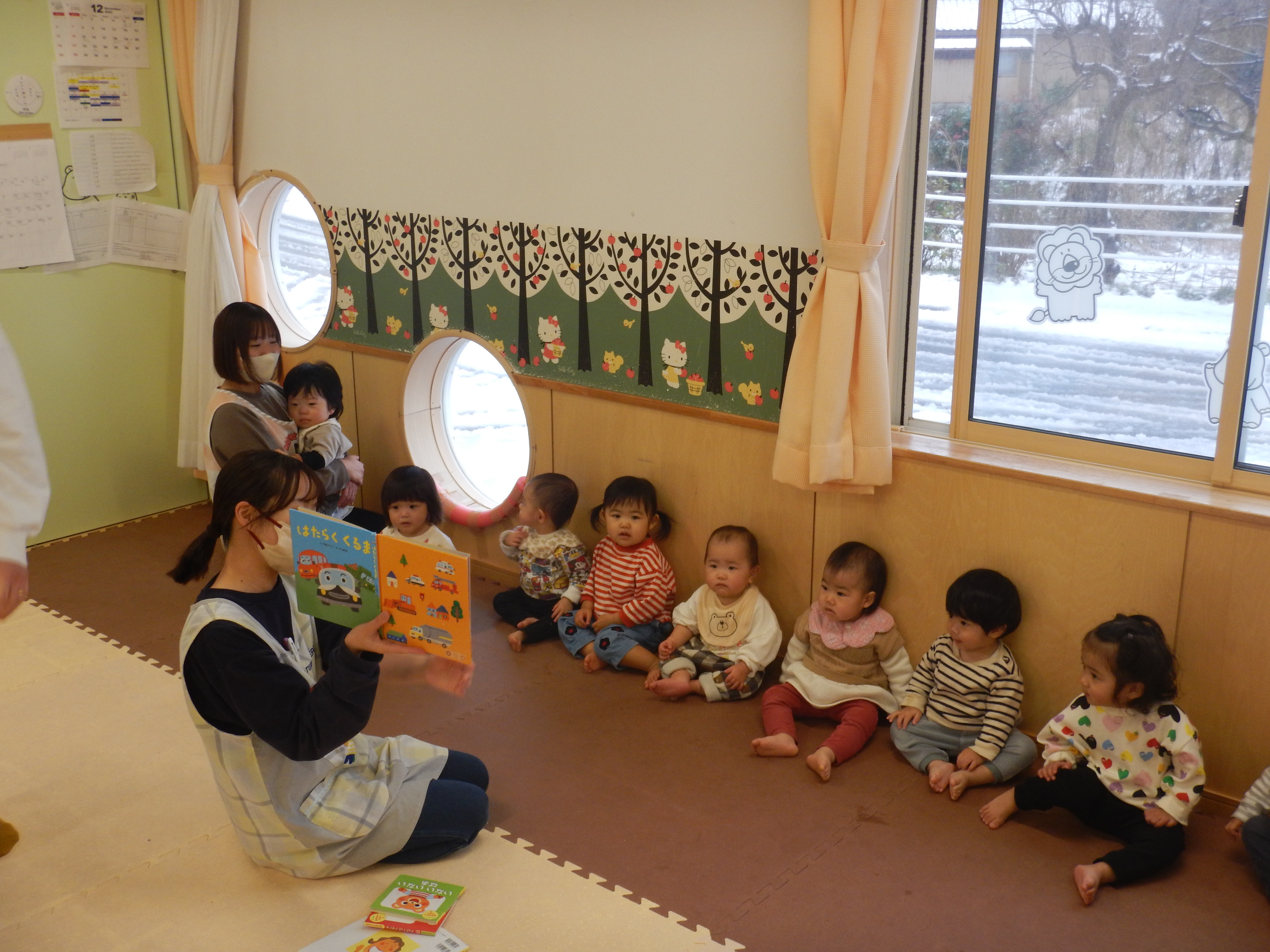 2歳児さんは、椅子取りゲーム、1歳児さんは自由遊び、0歳児さんは絵本の読み聞かせでした。