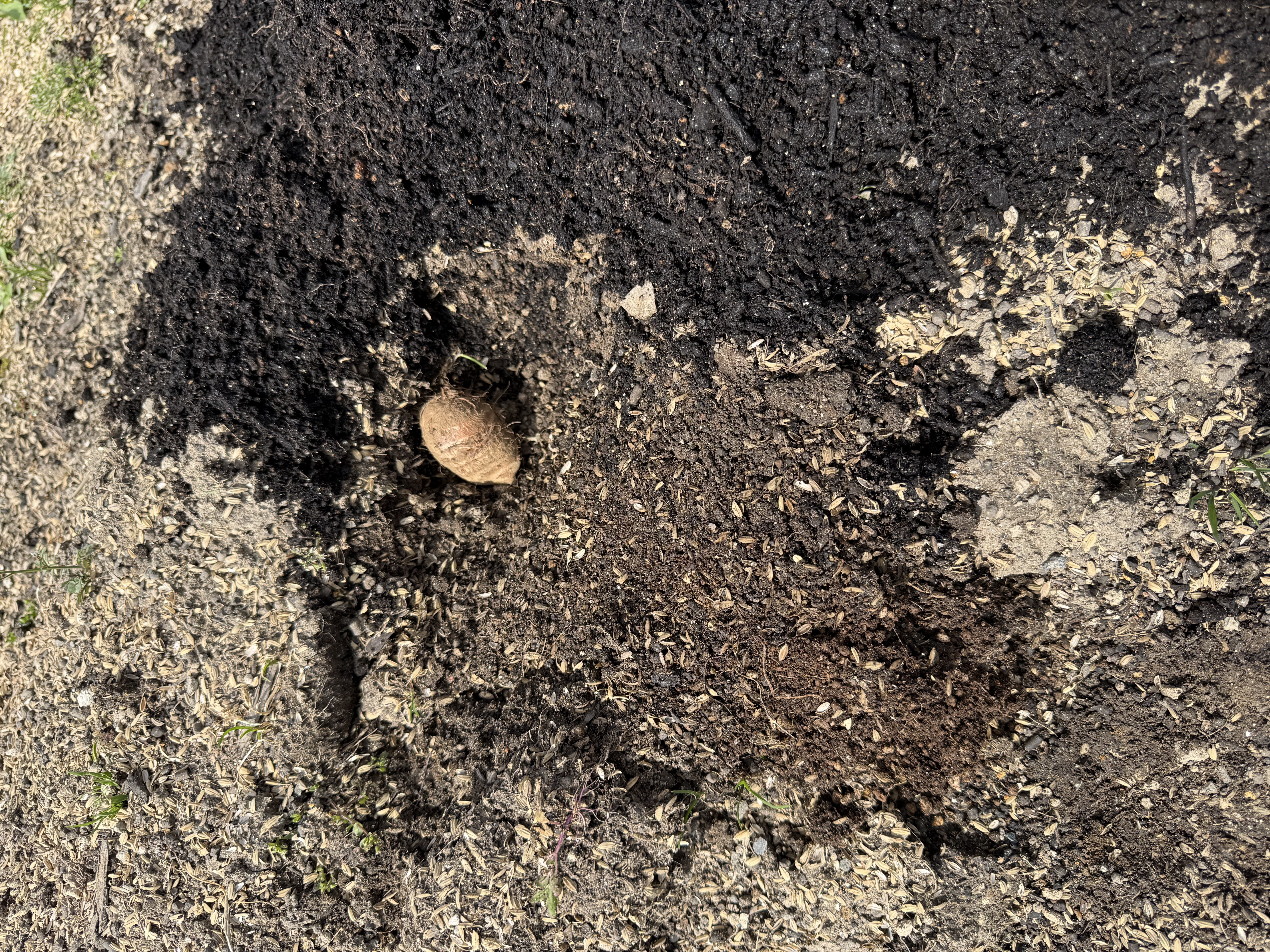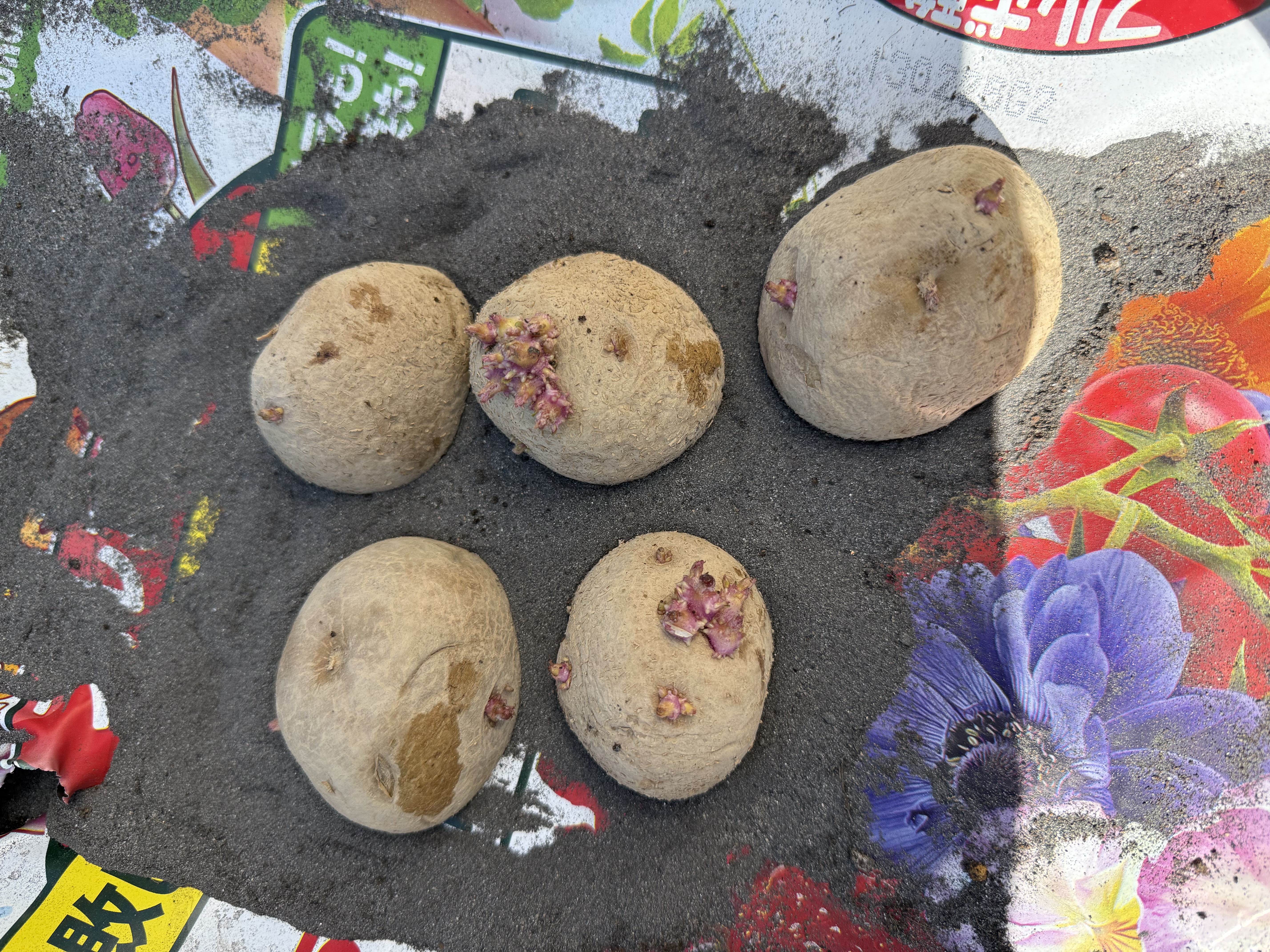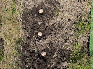第1農園にジャガイモと里芋の種芋を植えました。玉ねぎも順調に育ち、ホウレンソウも少しだけですが収穫しました。