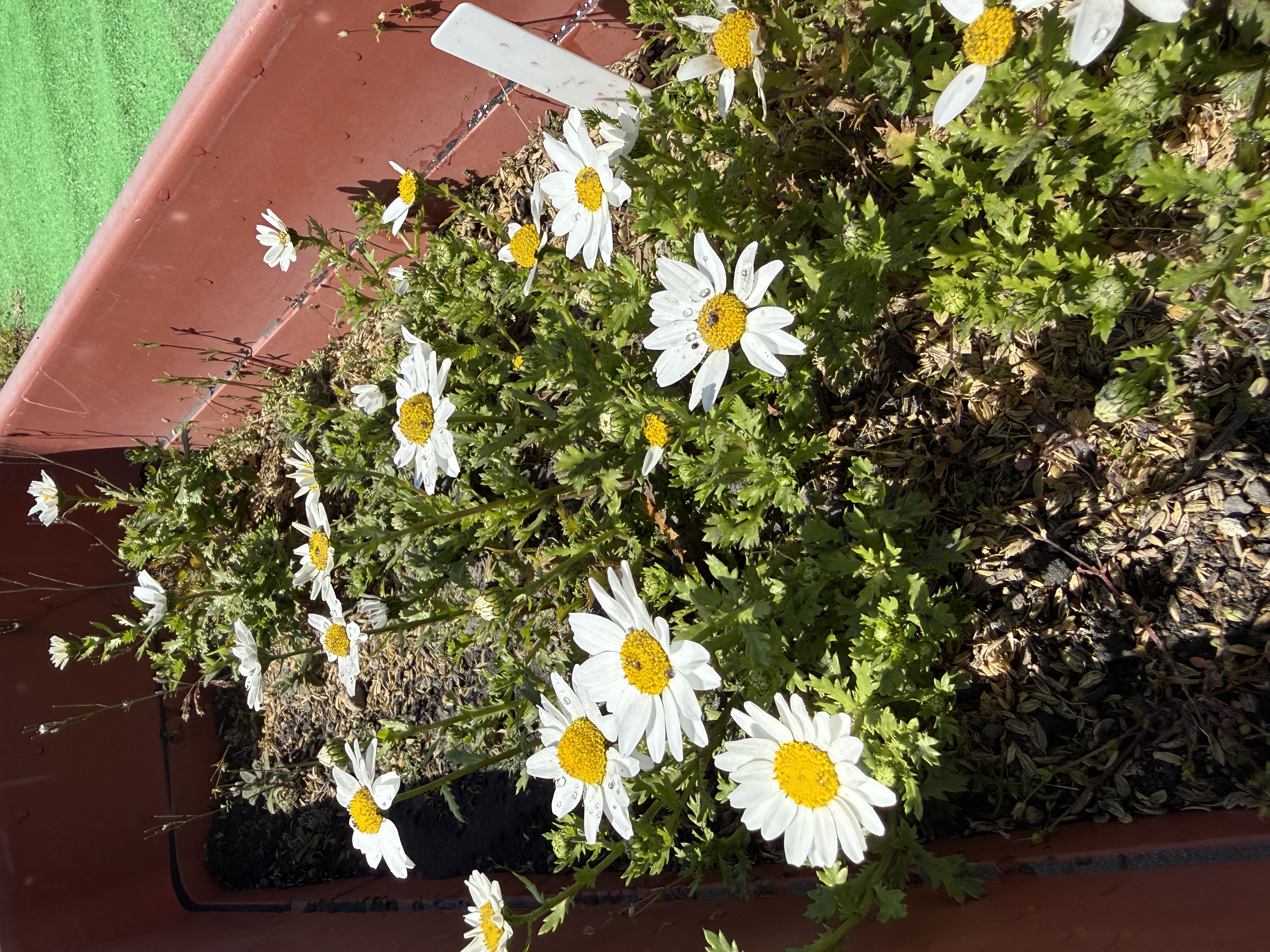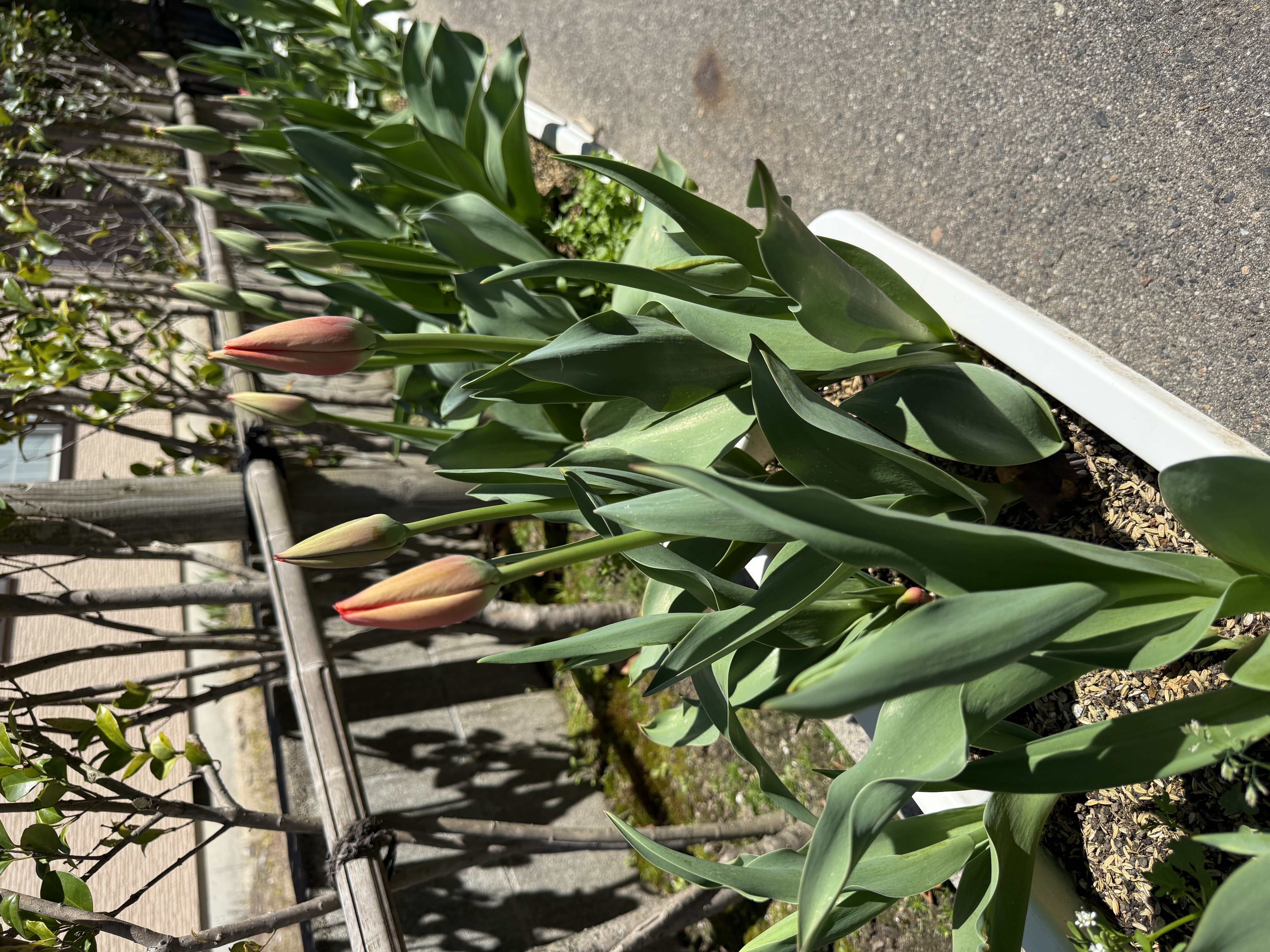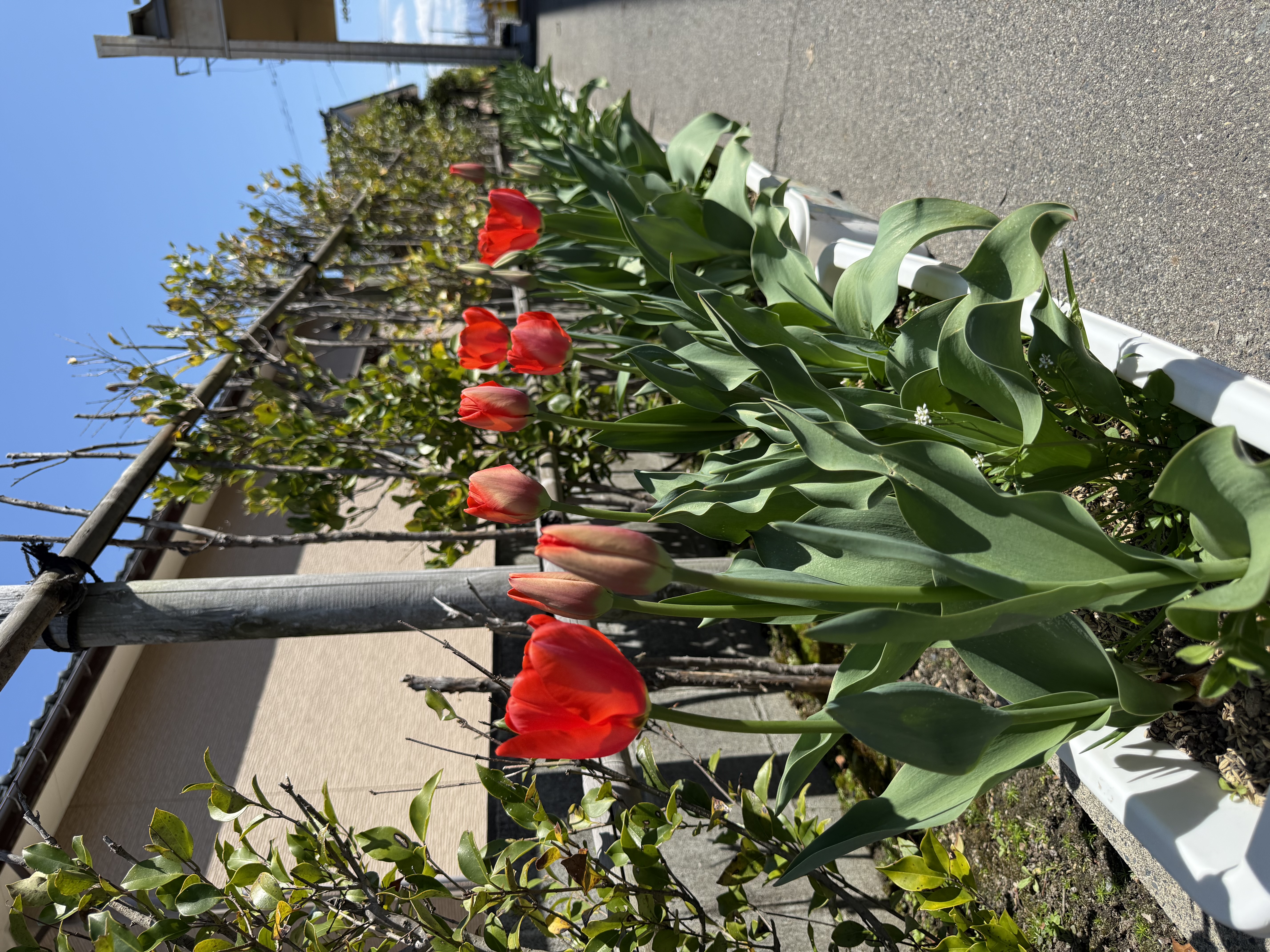 プランターに植えたチューリップも咲き始め、玄関は色とりどりの花があって春だな~と感じる光景です。