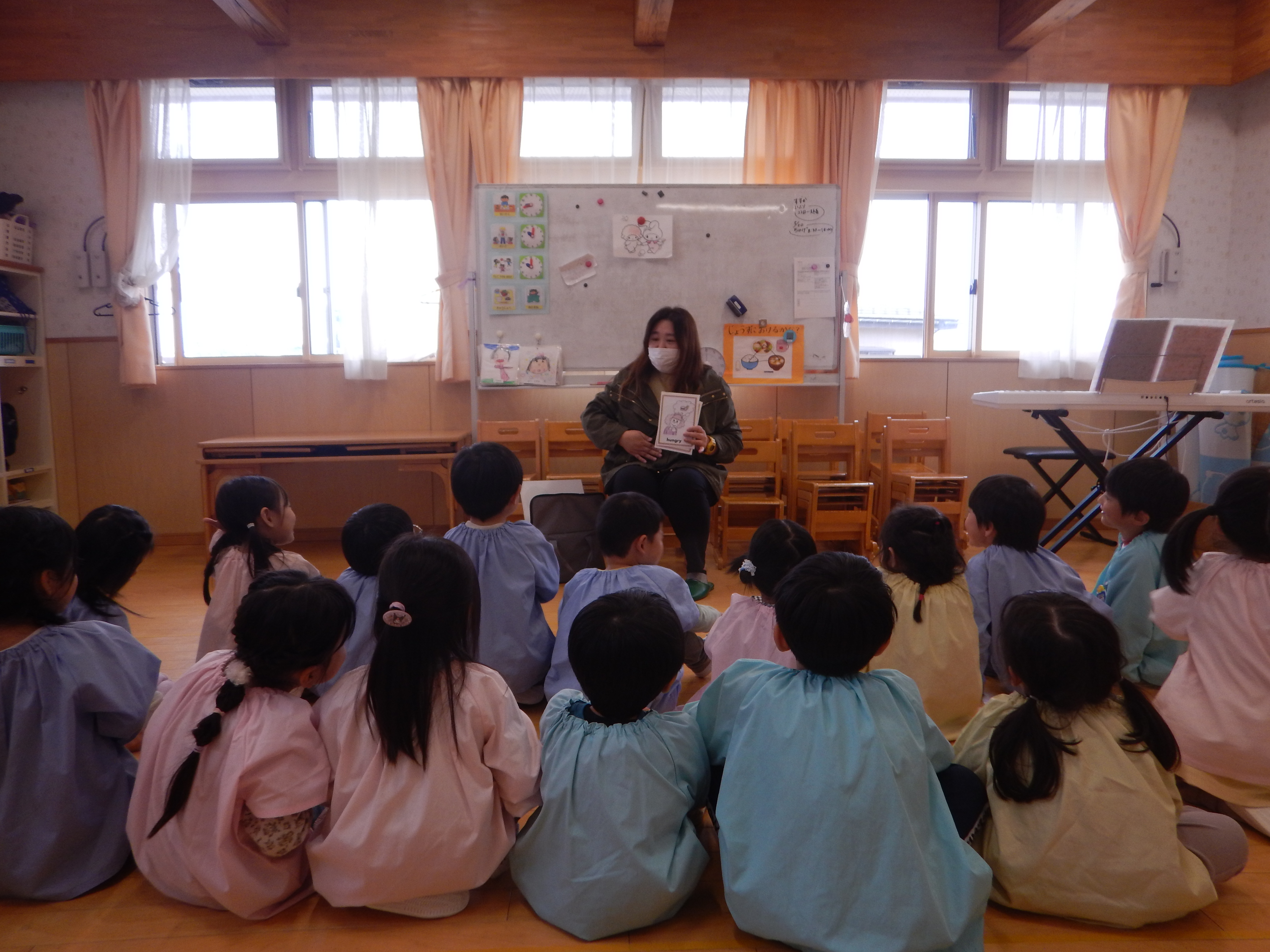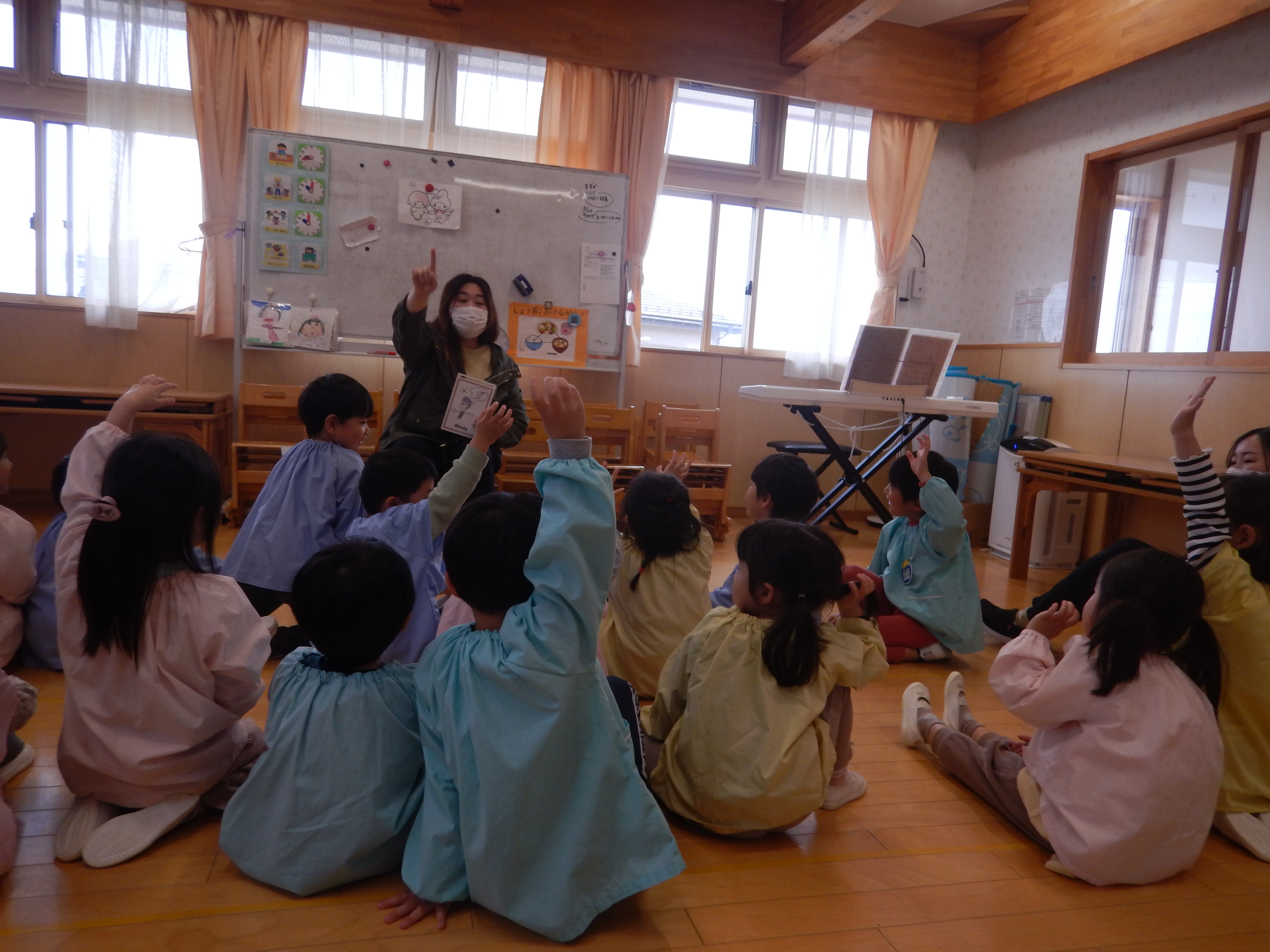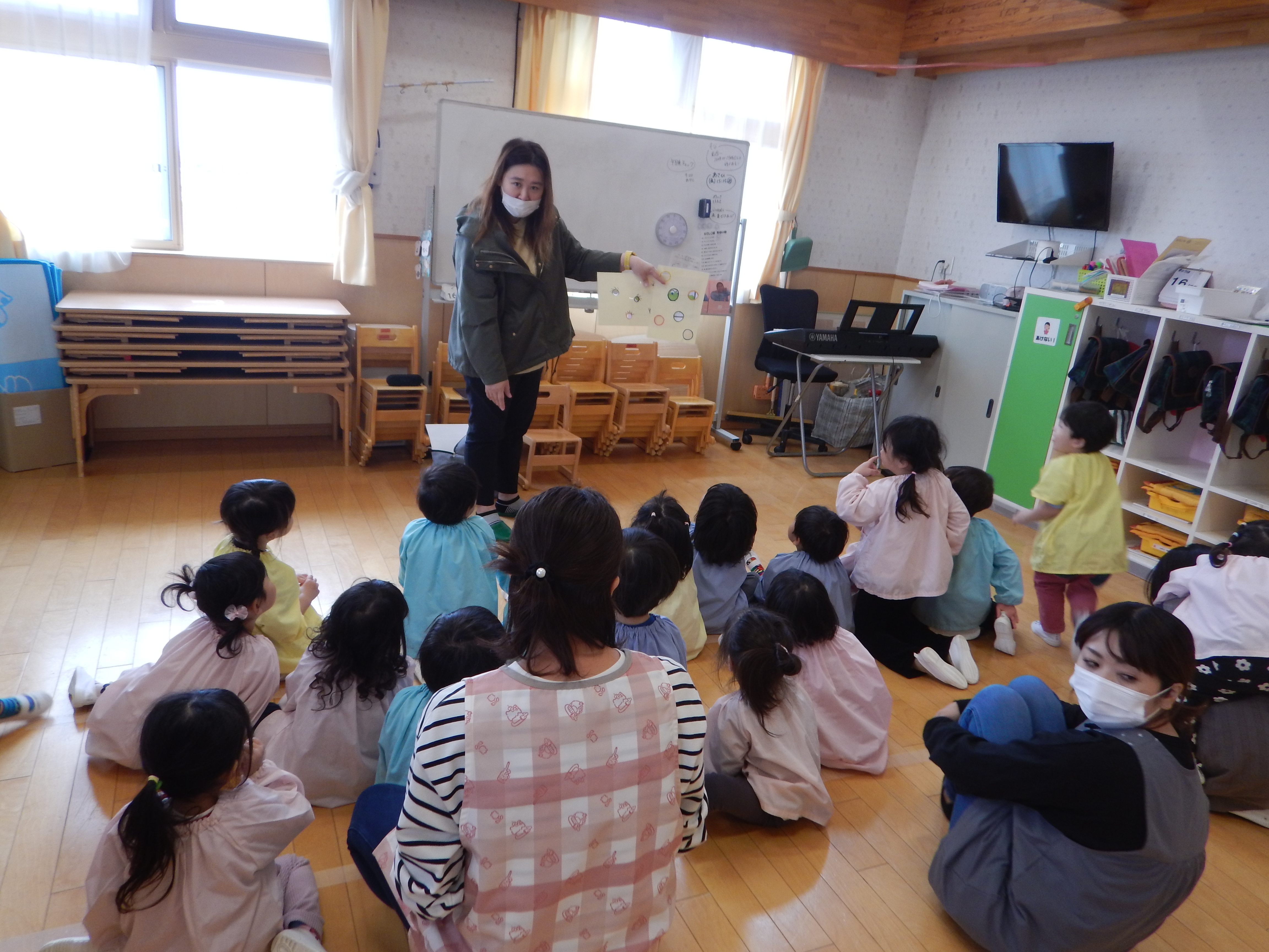 今日は、今年度初めての英語教室がありました。3歳児さんは園で初めての英語。バナナとアップルのカードで左右に移動するゲームをしたりアリゲーター🐊の絵本を読んでもらったり最後はさようならの歌を振りをつけながら歌って先生とバイバイしました。