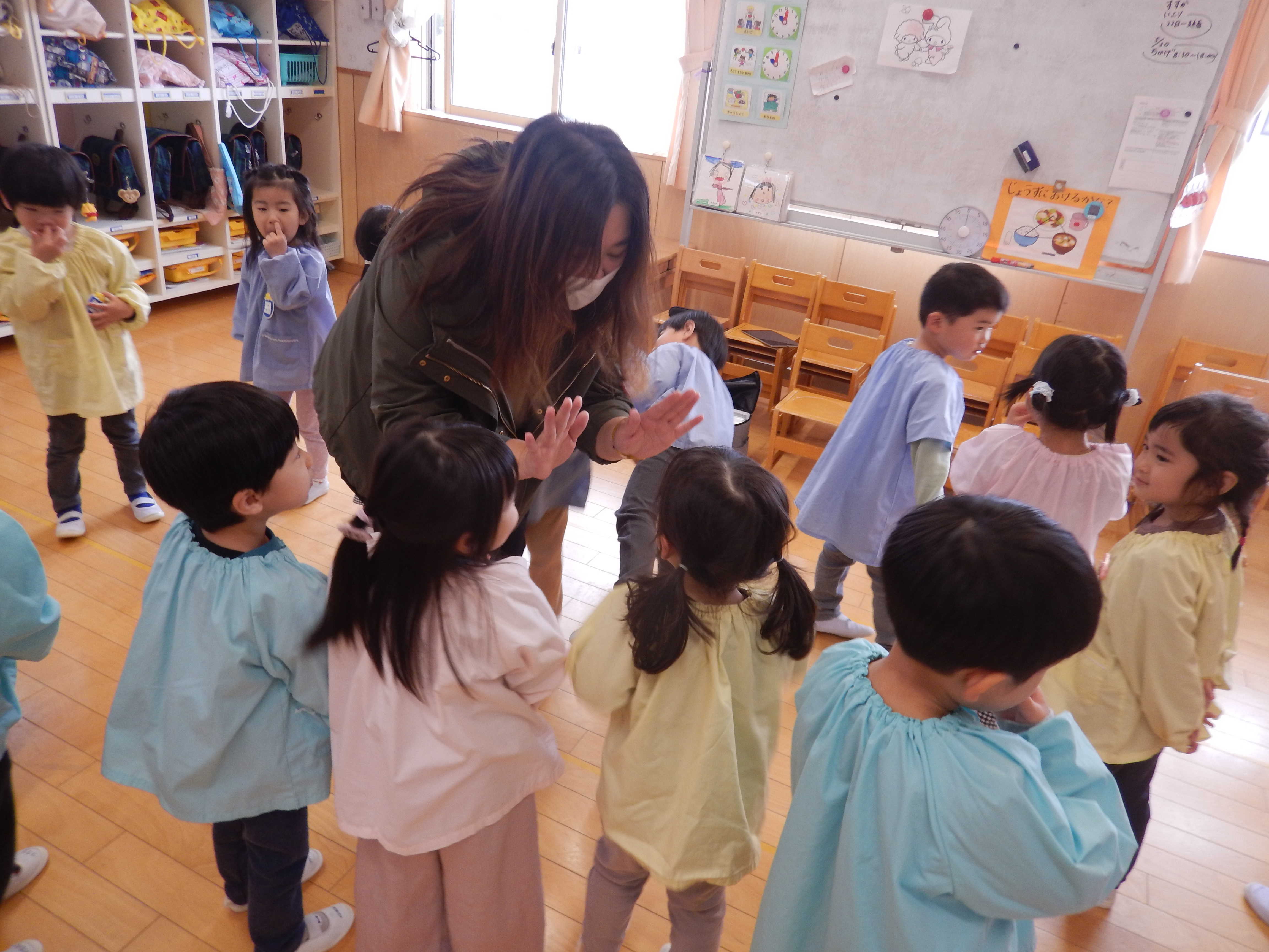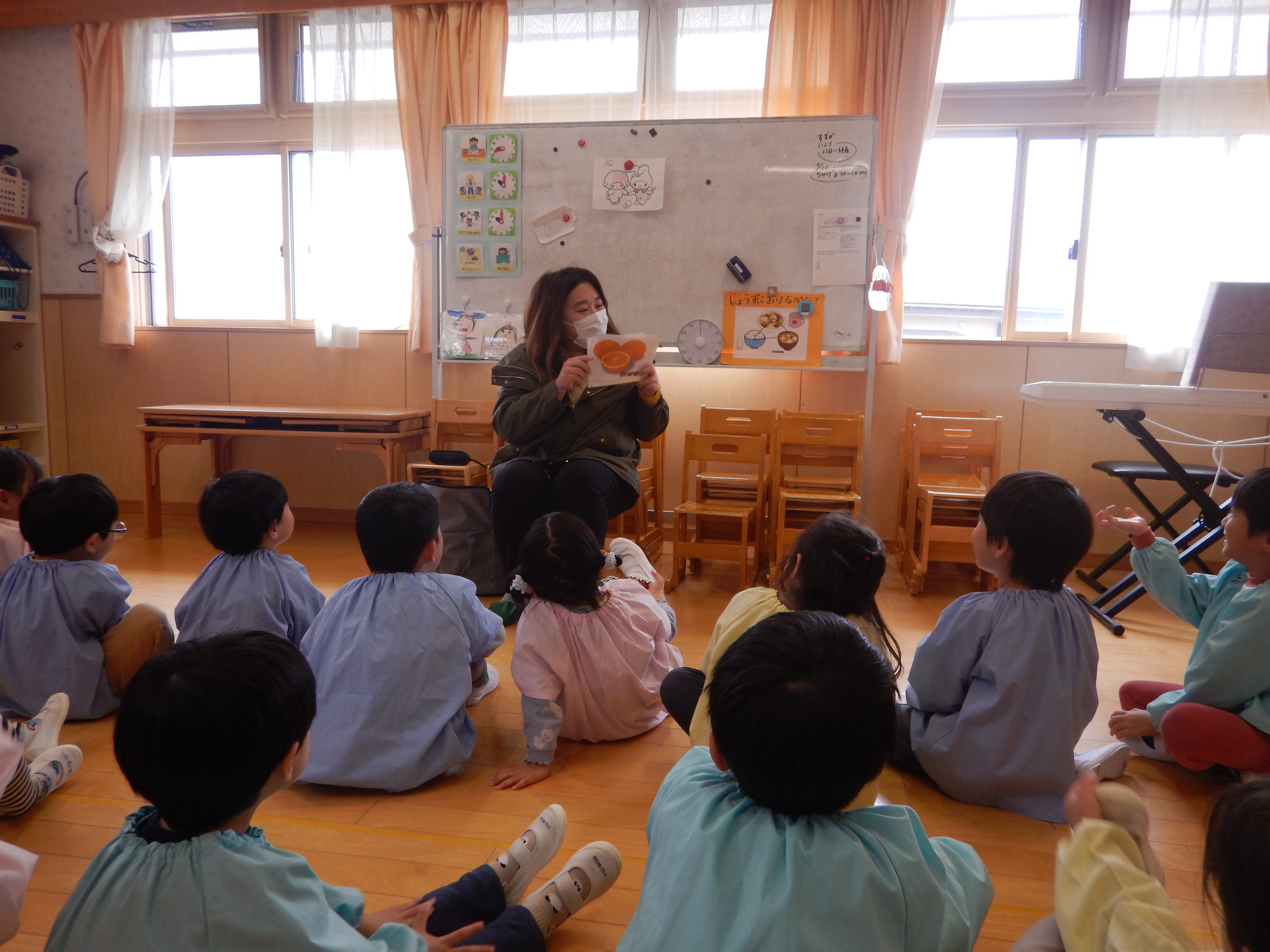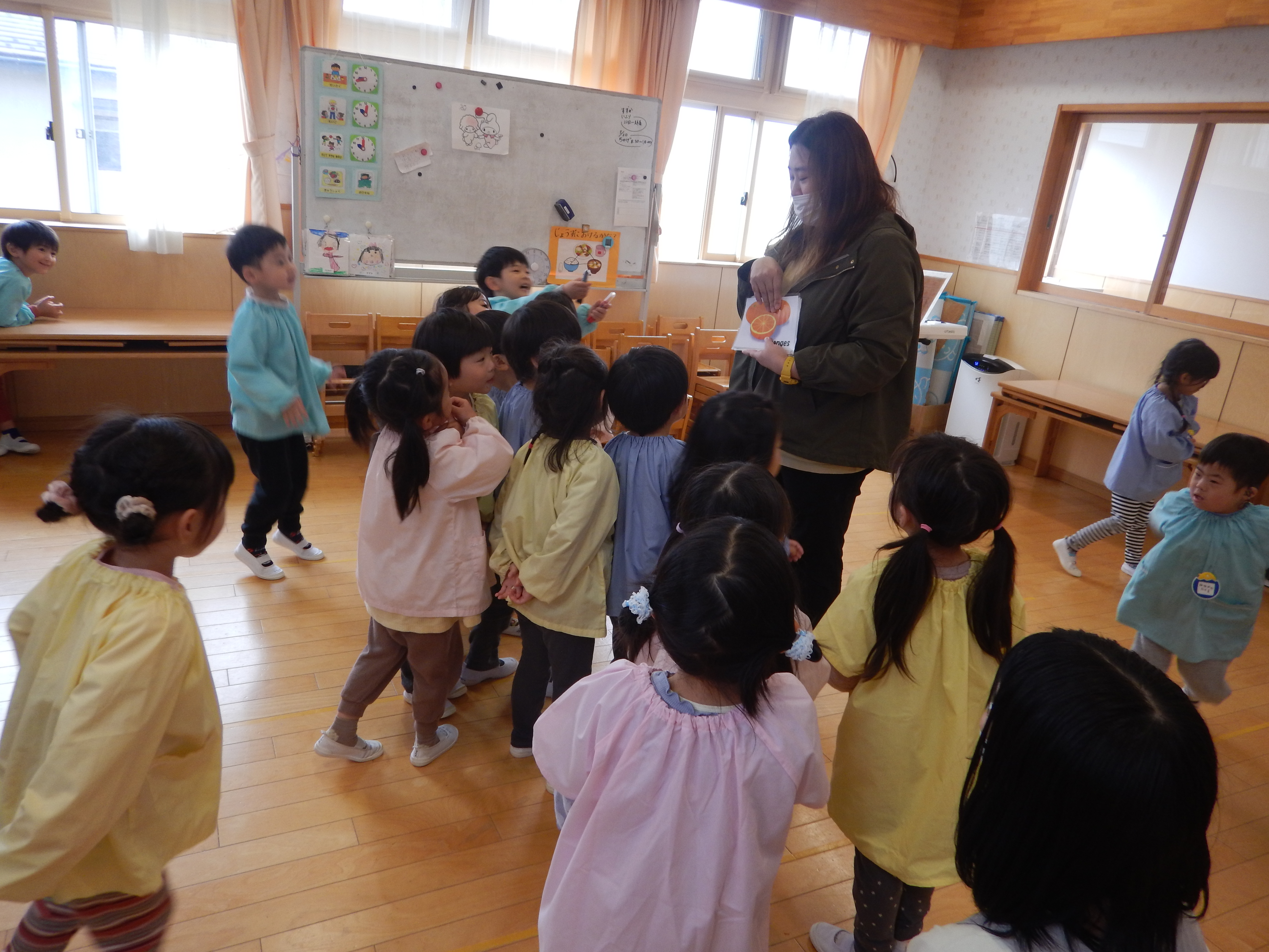 4歳児さんは、昨年の経験もあるので、元気よく「ハロー!」と挨拶したりフルーツの色と同じ色をお部屋の中から探すゲームで楽しみました。