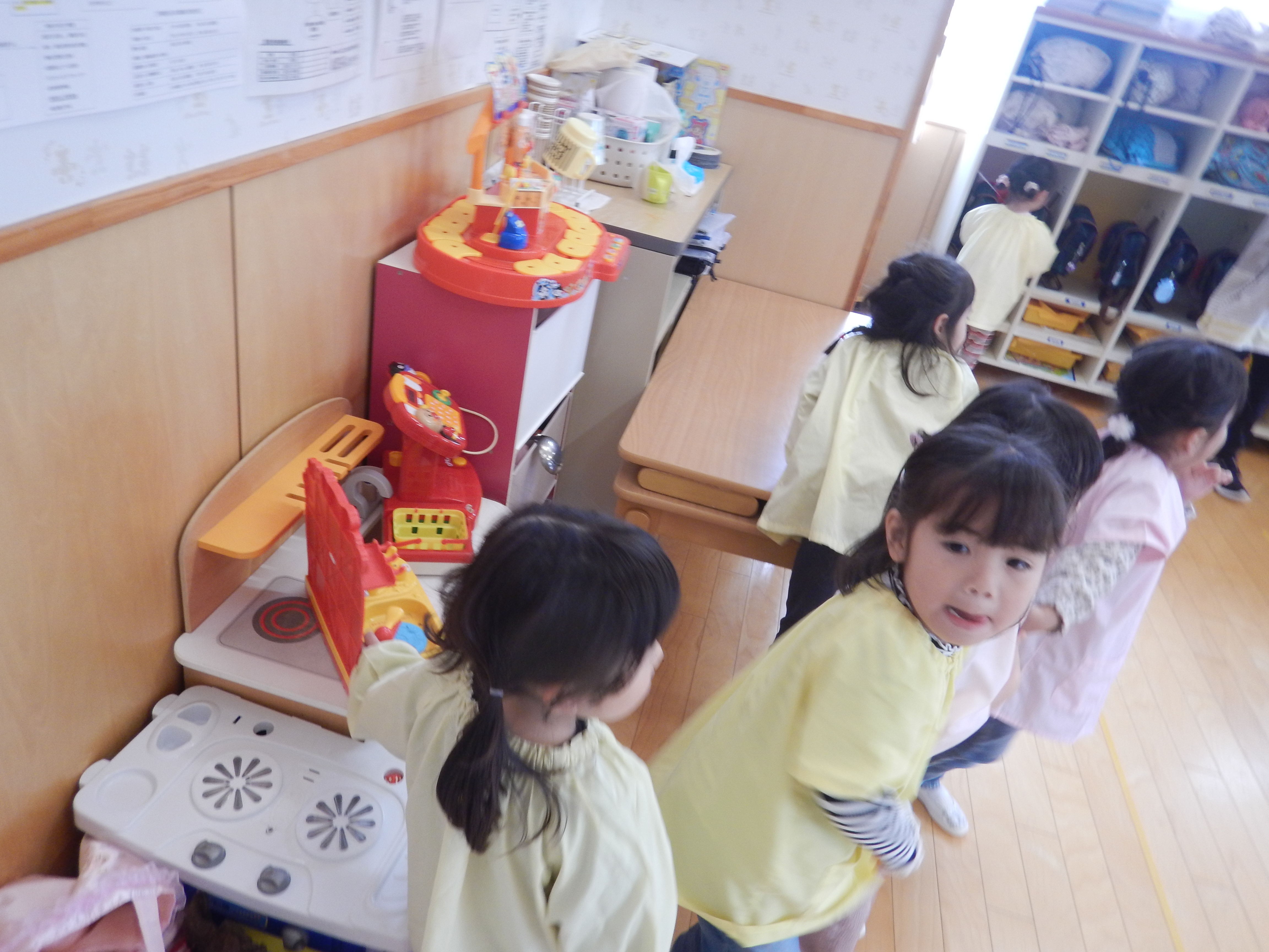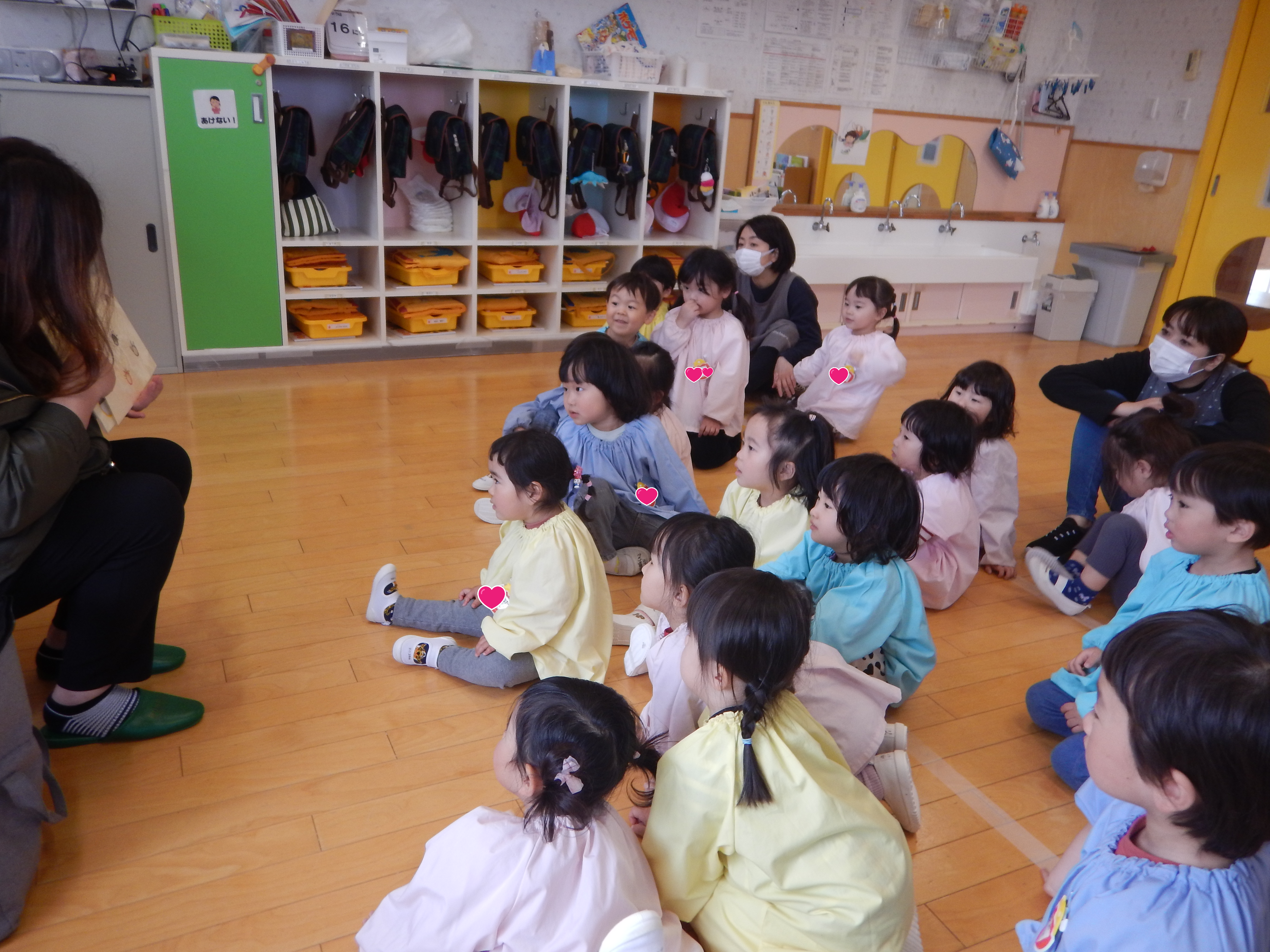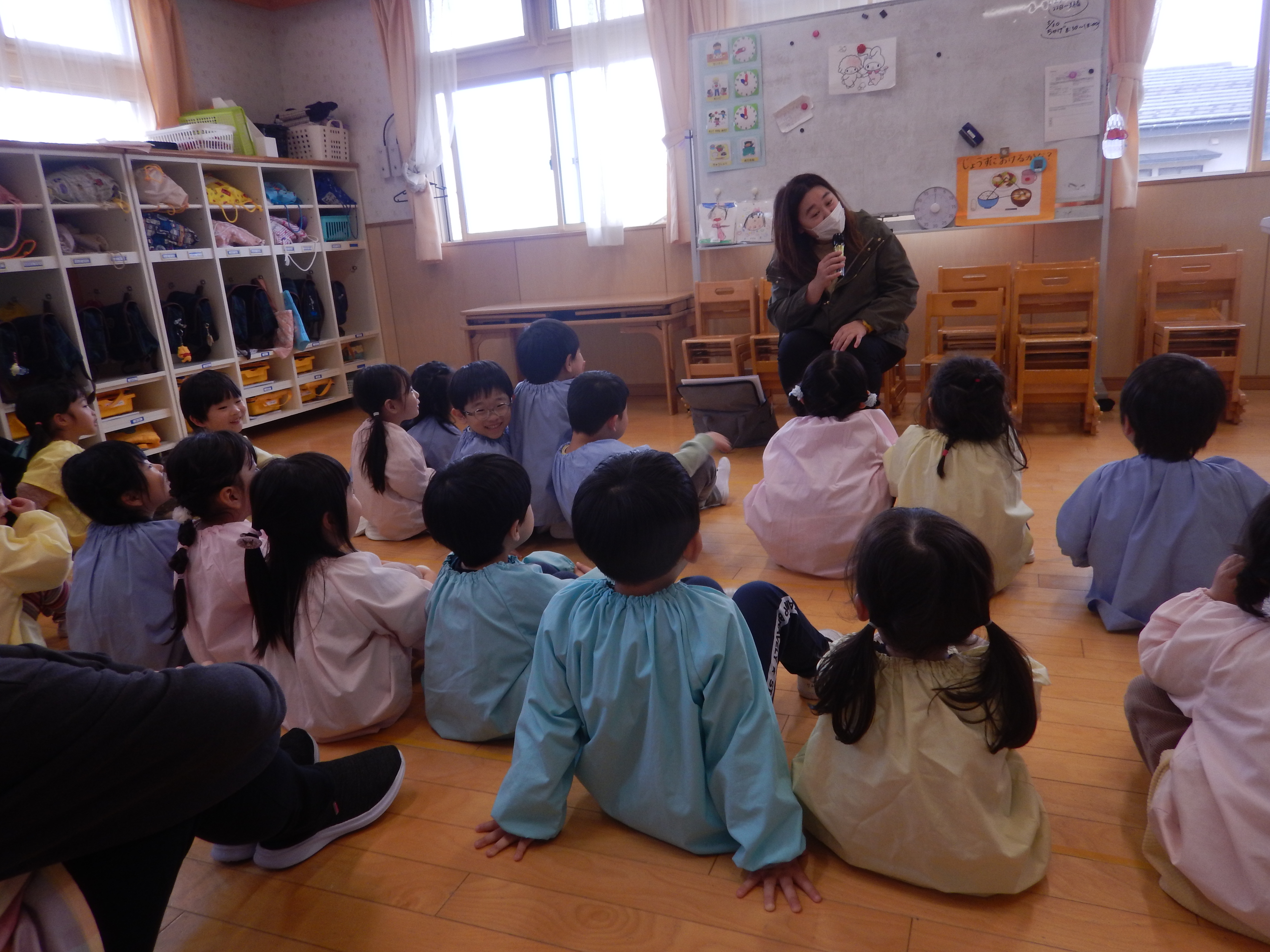 4歳児さんは、昨年の経験もあるので、元気よく「ハロー!」と挨拶したりフルーツの色と同じ色をお部屋の中から探すゲームで楽しみました。